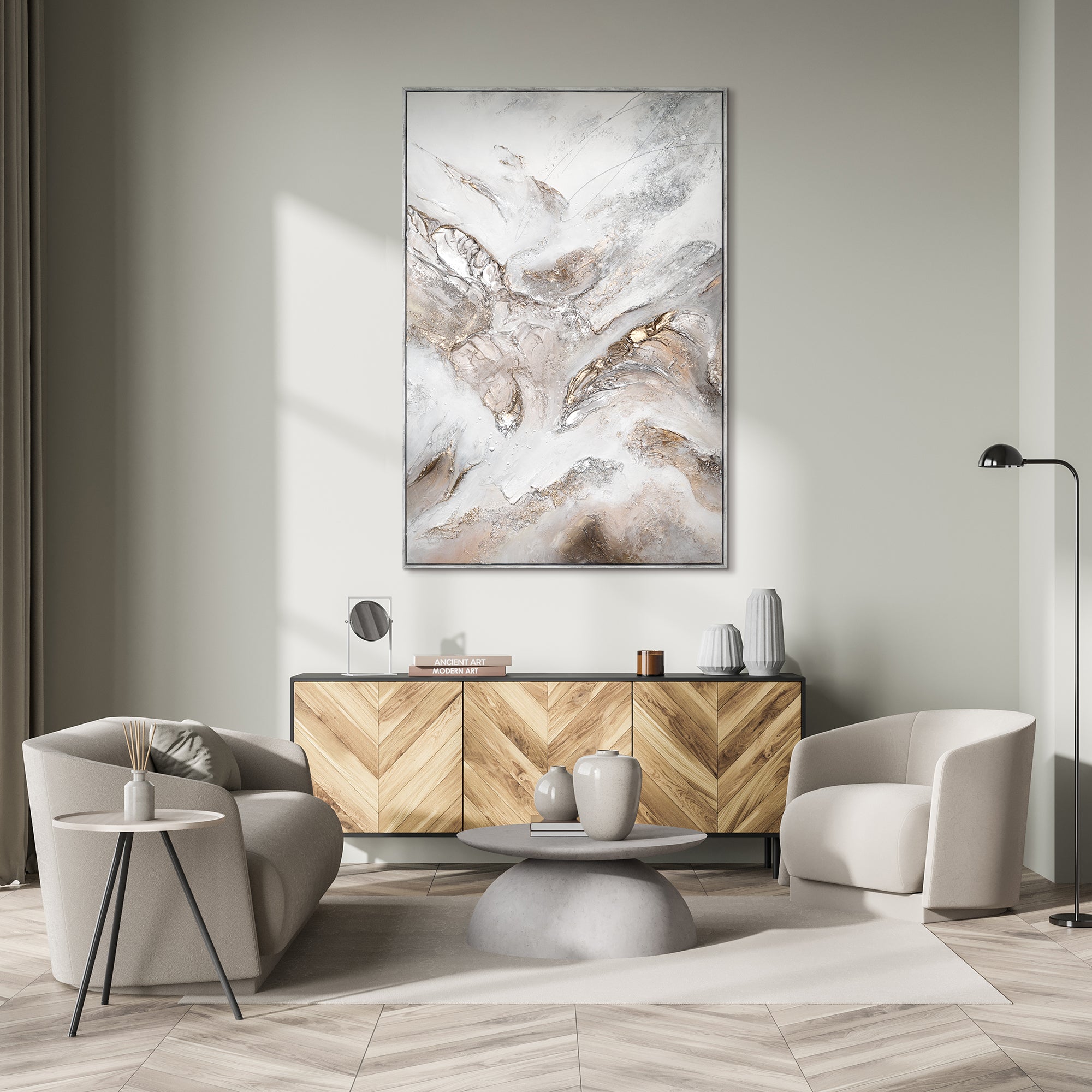 'Silver Touches' es un ejemplo excepcional de arte abstracto moderno, que combina formas naturales y tonos terrosos con vibrantes detalles en plata y oro.