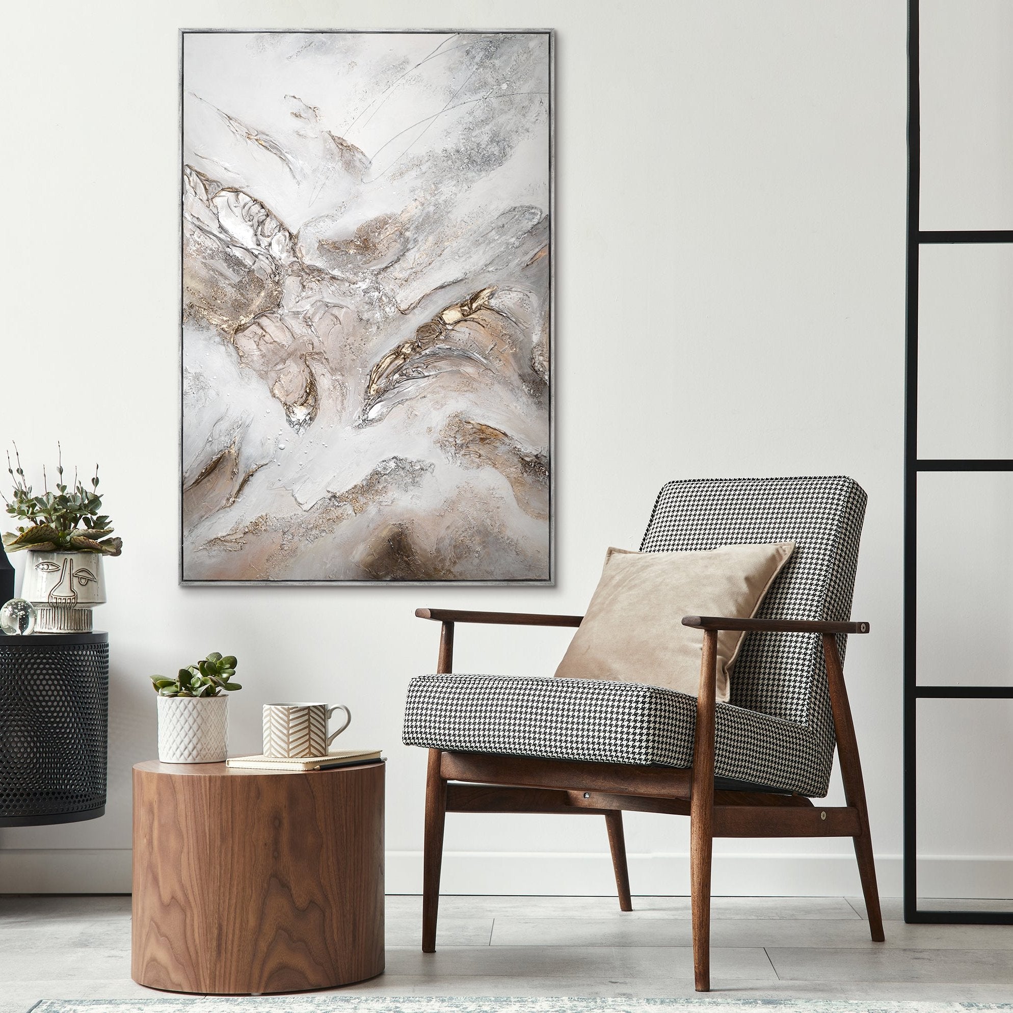 • Großes Gemälde in neutralem Raum über Sessel mit Kissen