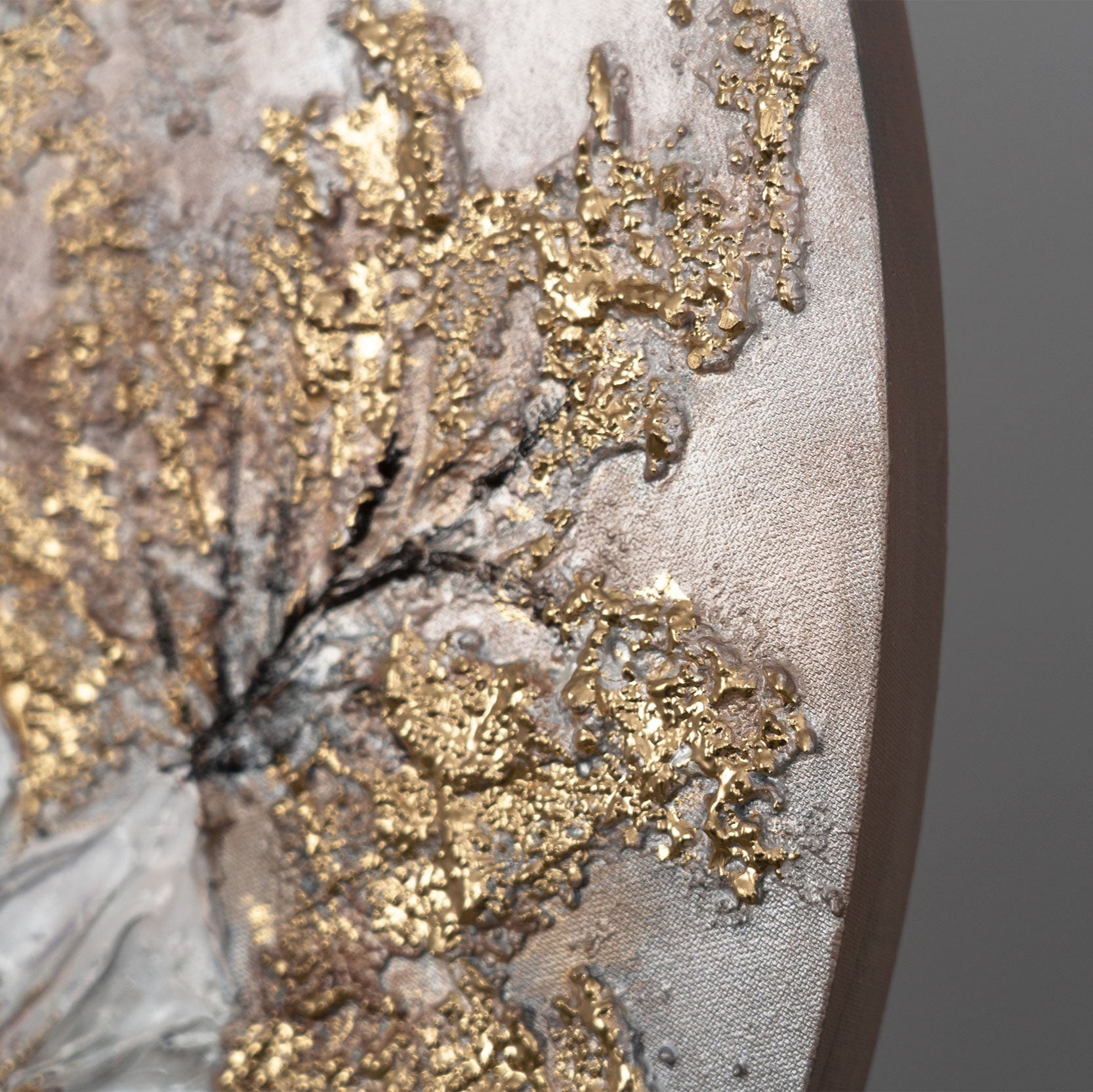 Rundes Florale Acrylbild Wandkunst in Gold-Beige "Das Glühen der Knospen"
