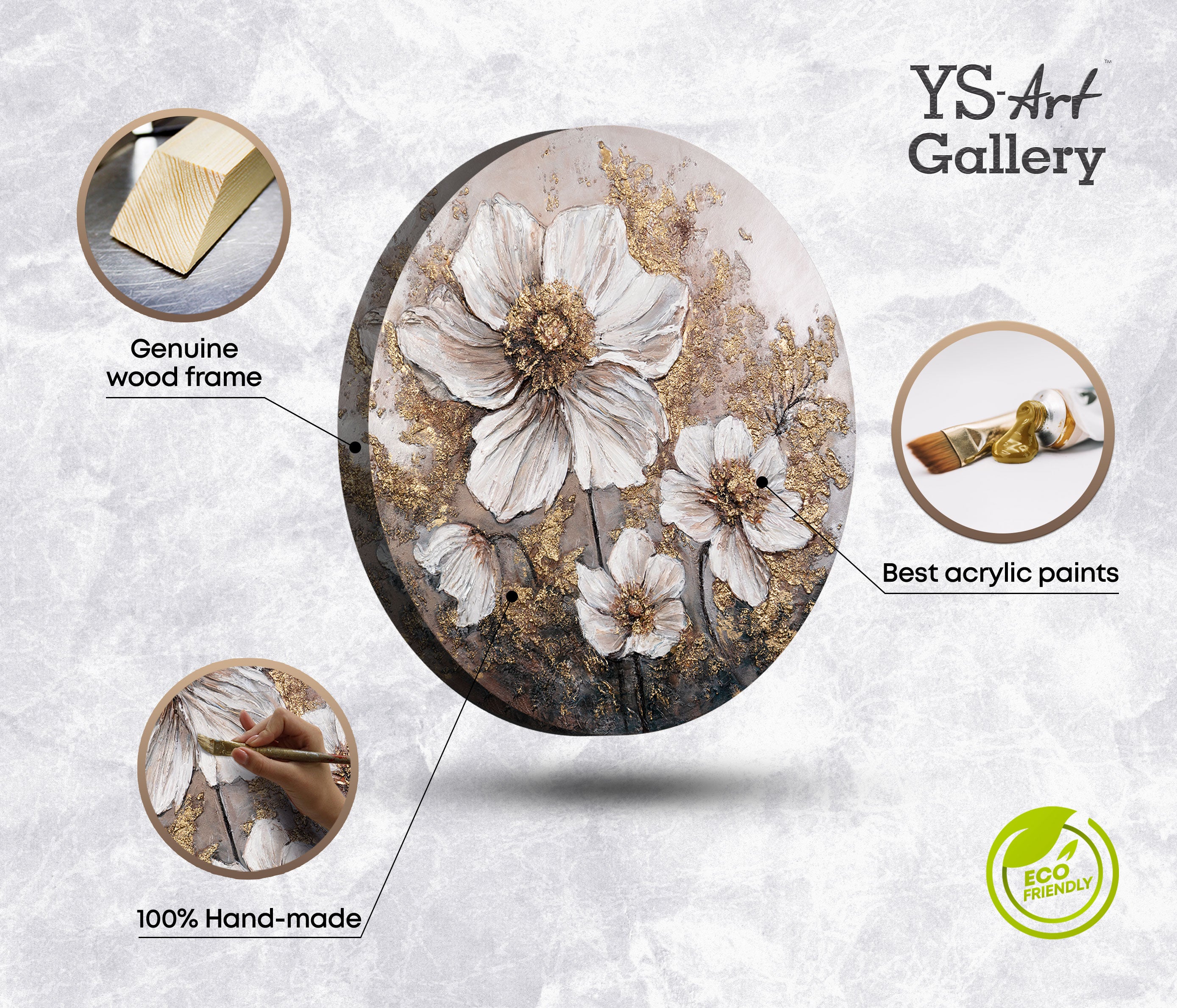 •  moderne wandkunst blumen, runde leinwand mit gold