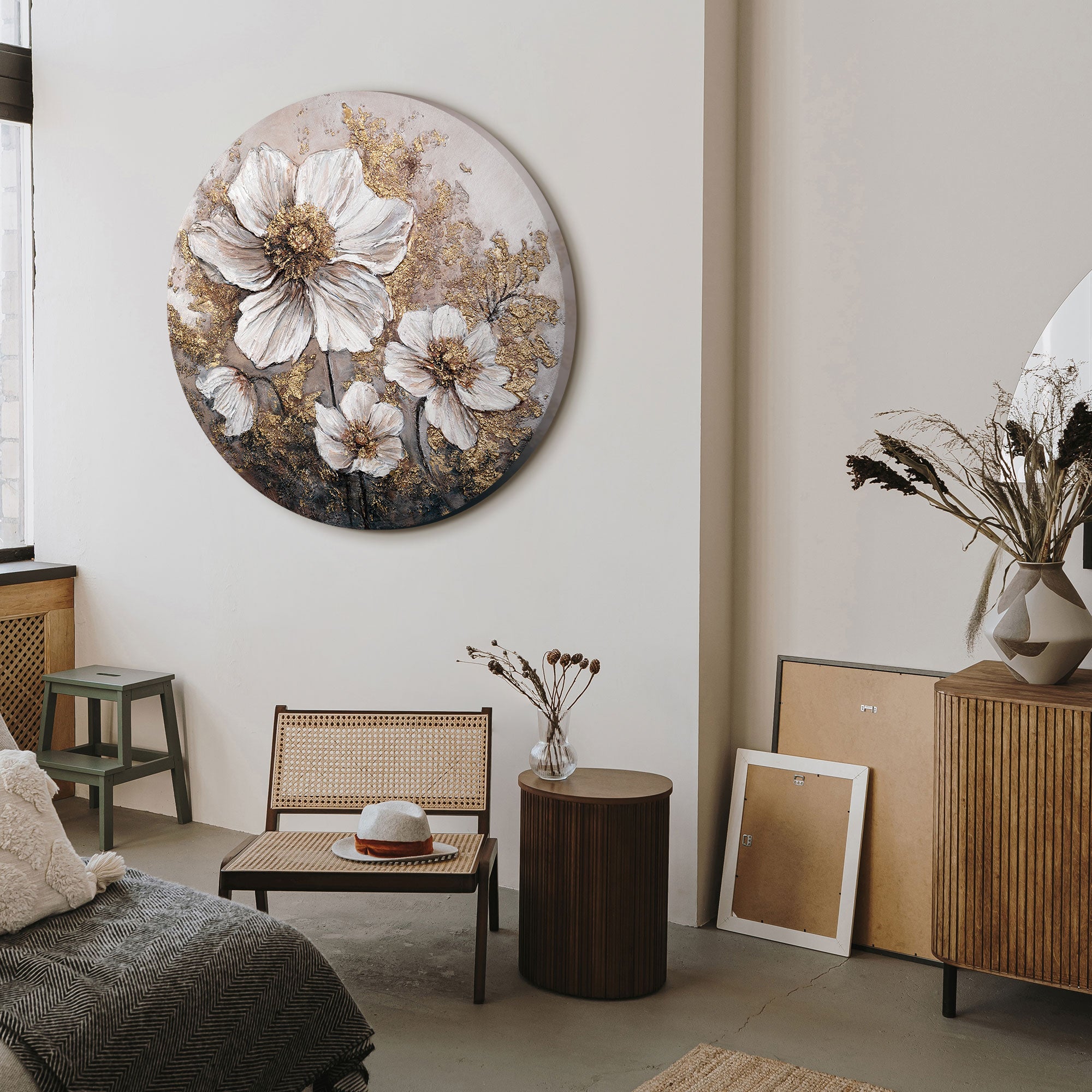 • runde wanddeko wohnzimmer, acrylbild floral gold