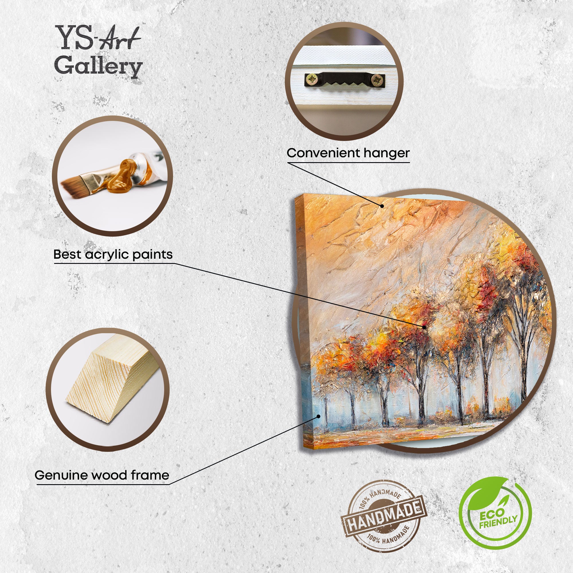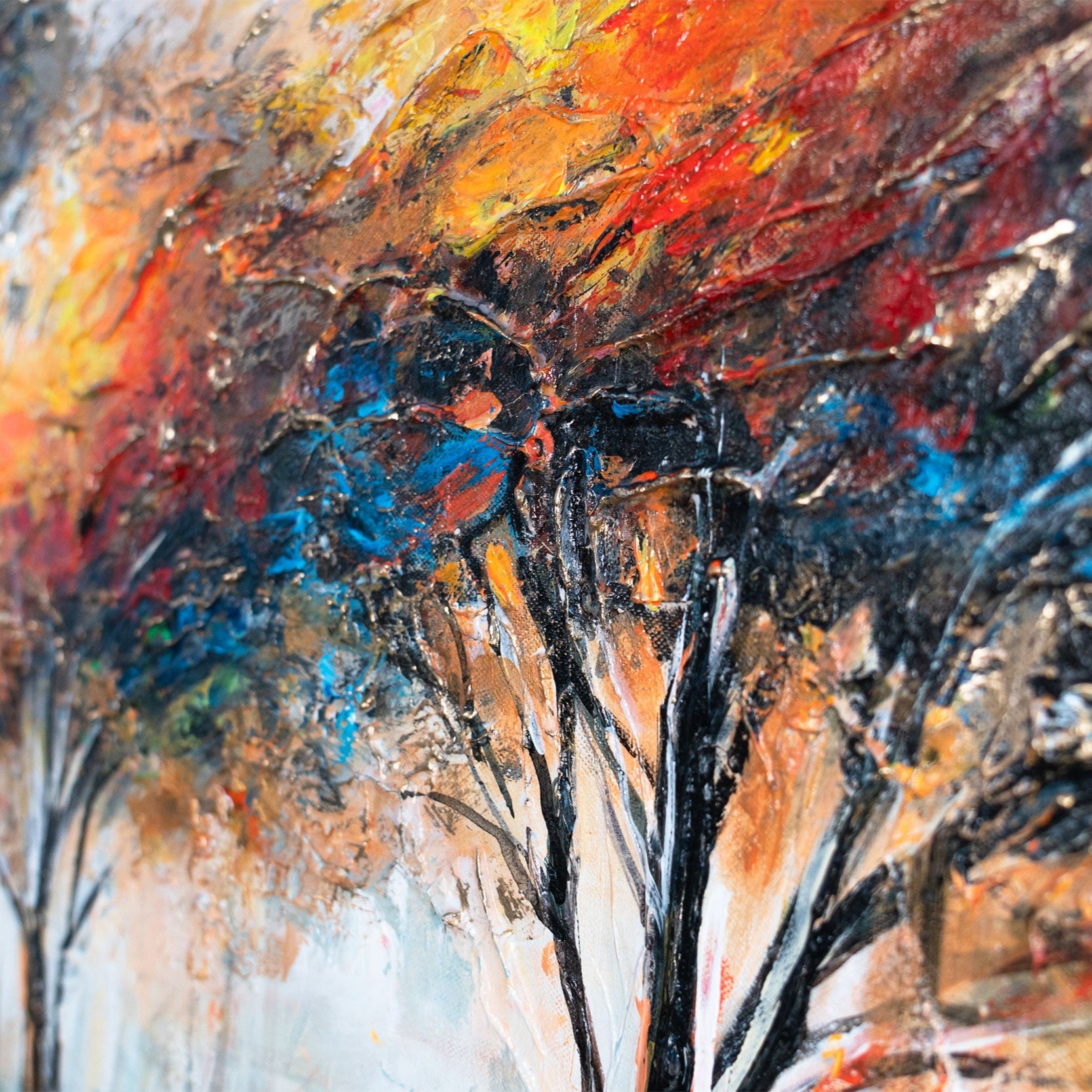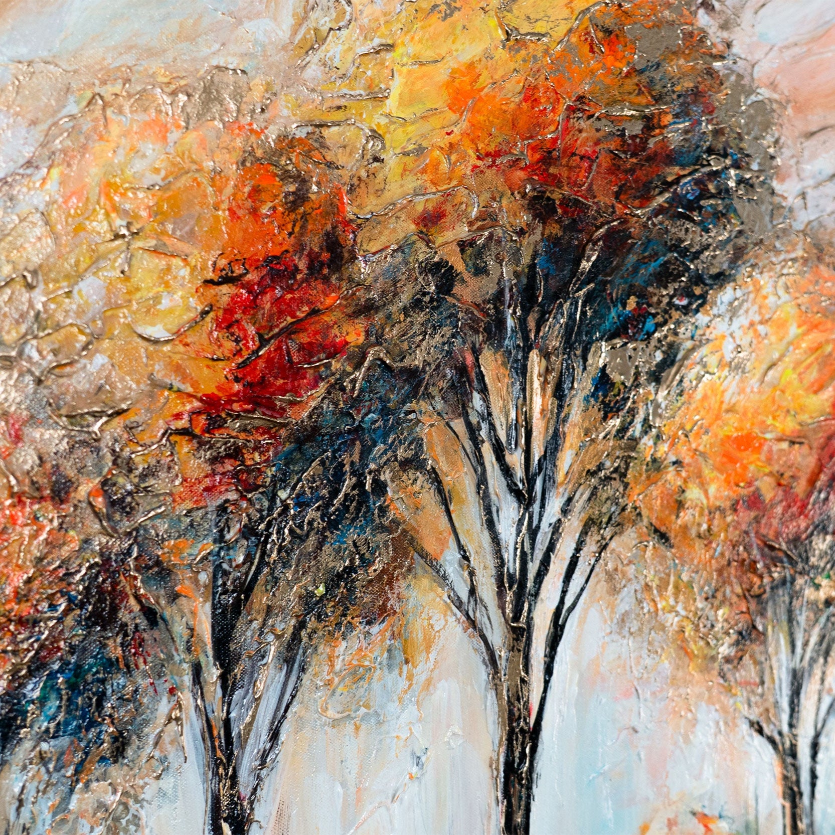 Ein strahlendes Acrylgemälde, das die Schönheit des Herbstes in warmen Farben und strukturierter Technik widerspiegelt. Die handgemalten Bäume mit leuchtendem Laub in Gold, Orange und Rot stehen vor einem zarten Hintergrund in Creme und Blau – ideal als dekoratives Highlight.