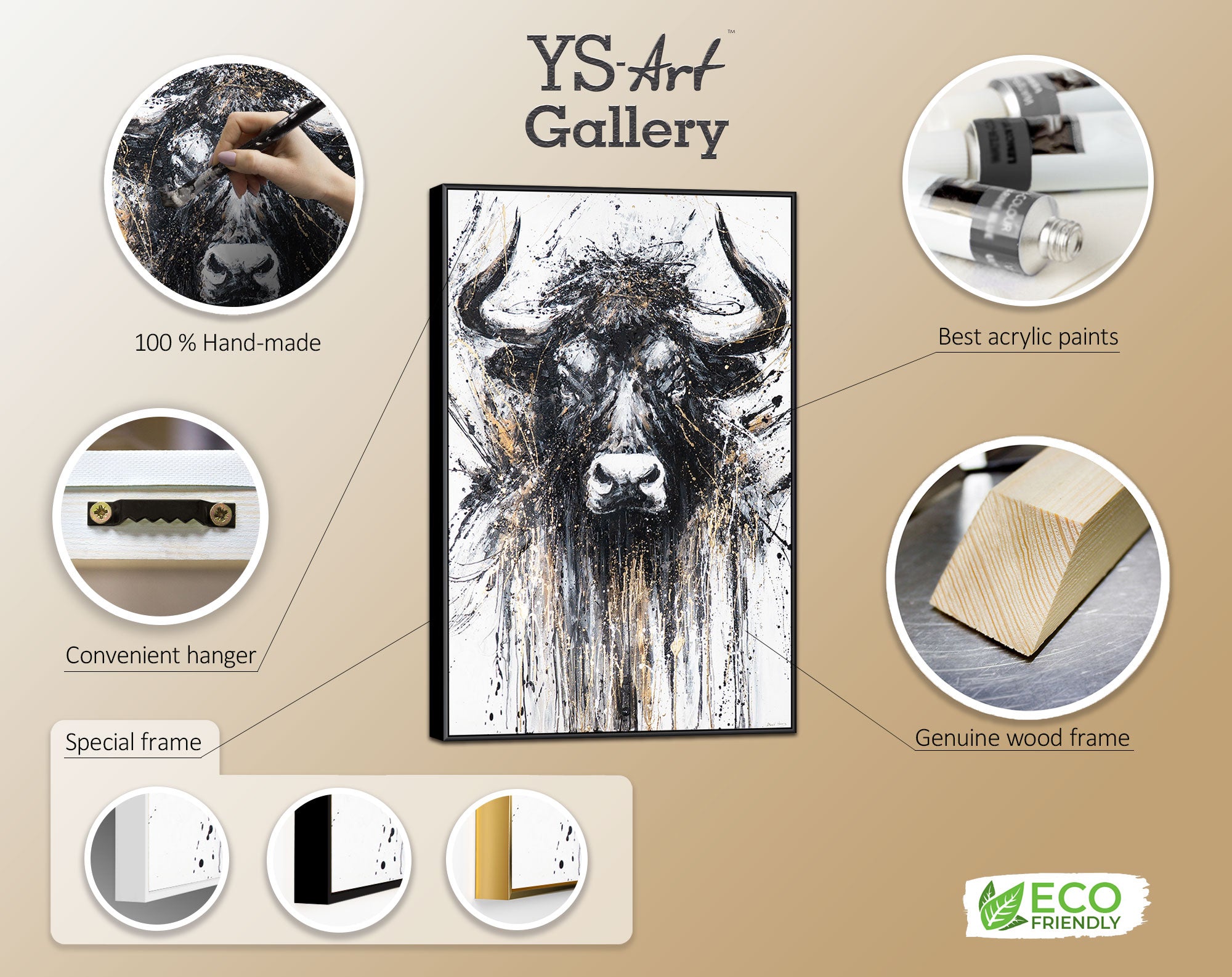 • Gemälde Handgemalt mit Rahmen „Stärke in Schwarz und Gold“ – majestätischer Bulle frontal