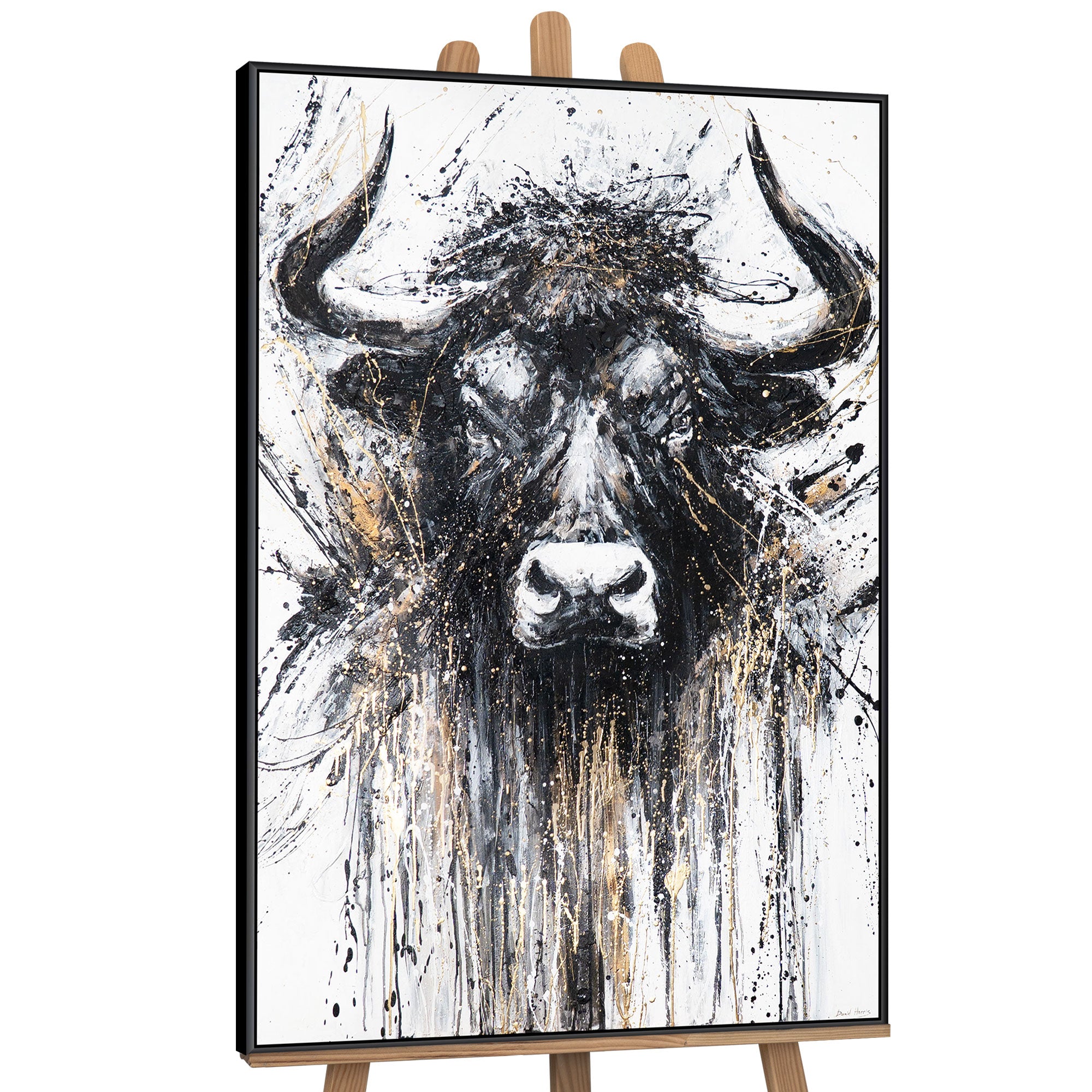 Gemälde Handgemalt mit Rahmen „Stärke in Schwarz und Gold“ – majestätischer Bulle frontal
