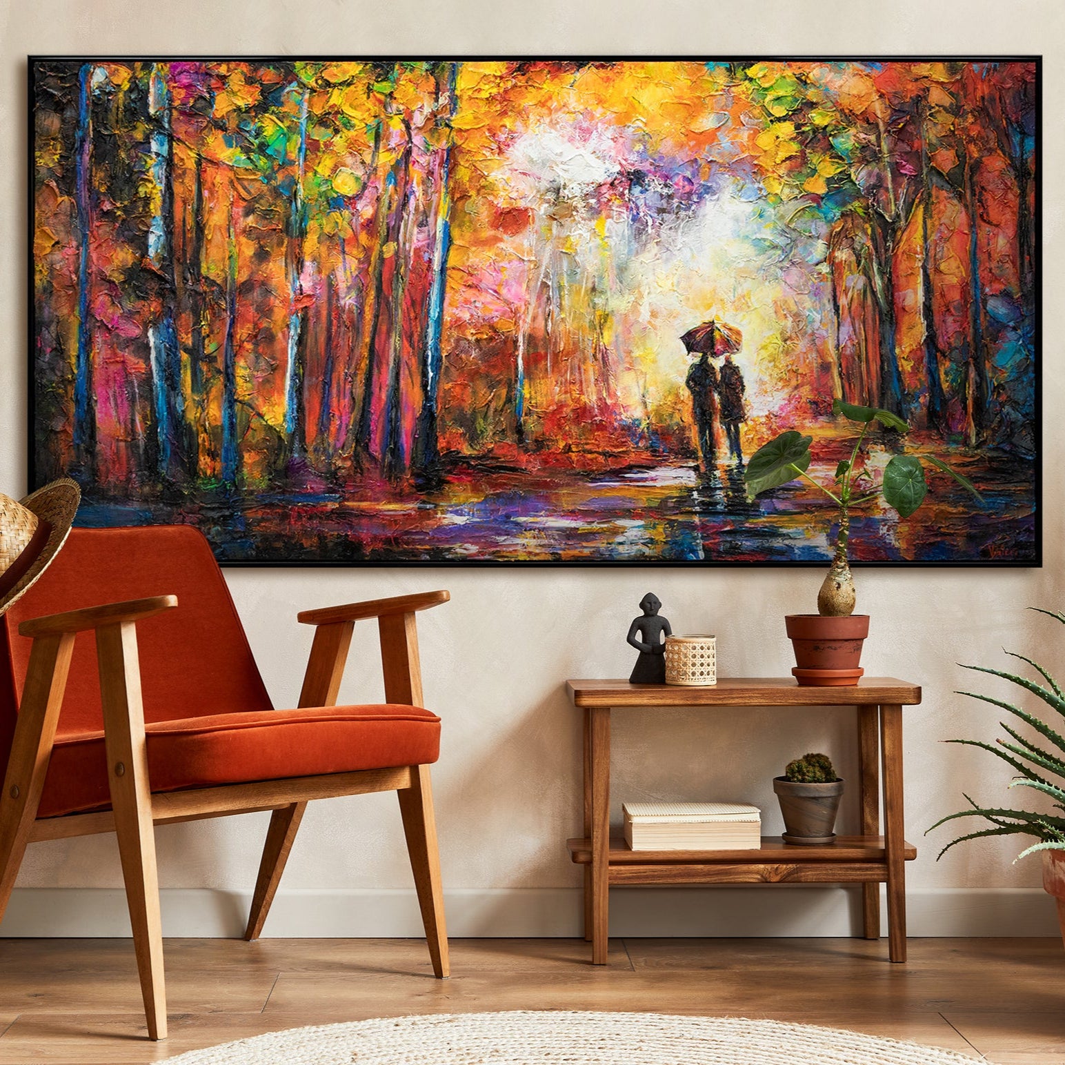 • Bunte Acrylmalerei mit Paar im Regen moderne Wandkunst