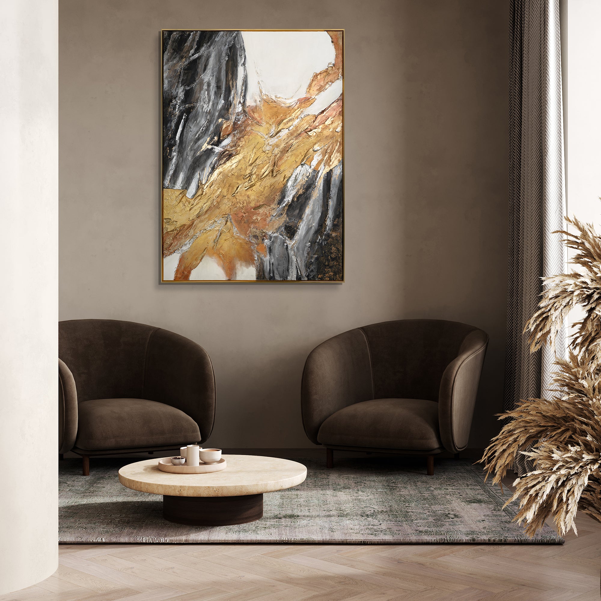 'Goldener Horizont' verführt mit seiner dynamischen Komposition aus kühlen Grautönen und warmen Gold- und Erdtönen. Diese abstrakte Darstellung, handgemalt auf Leinwand, fängt die Essenz natürlicher Landschaften in einer modernen Interpretation ein.