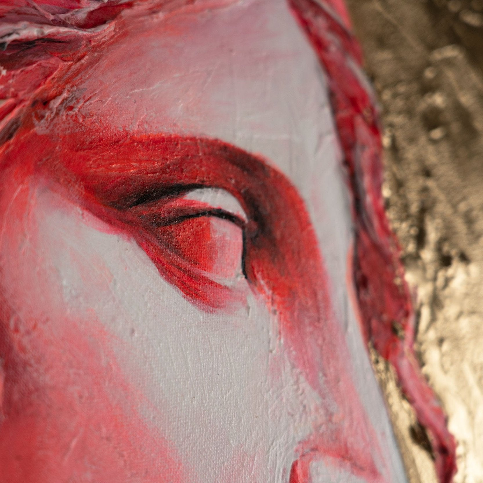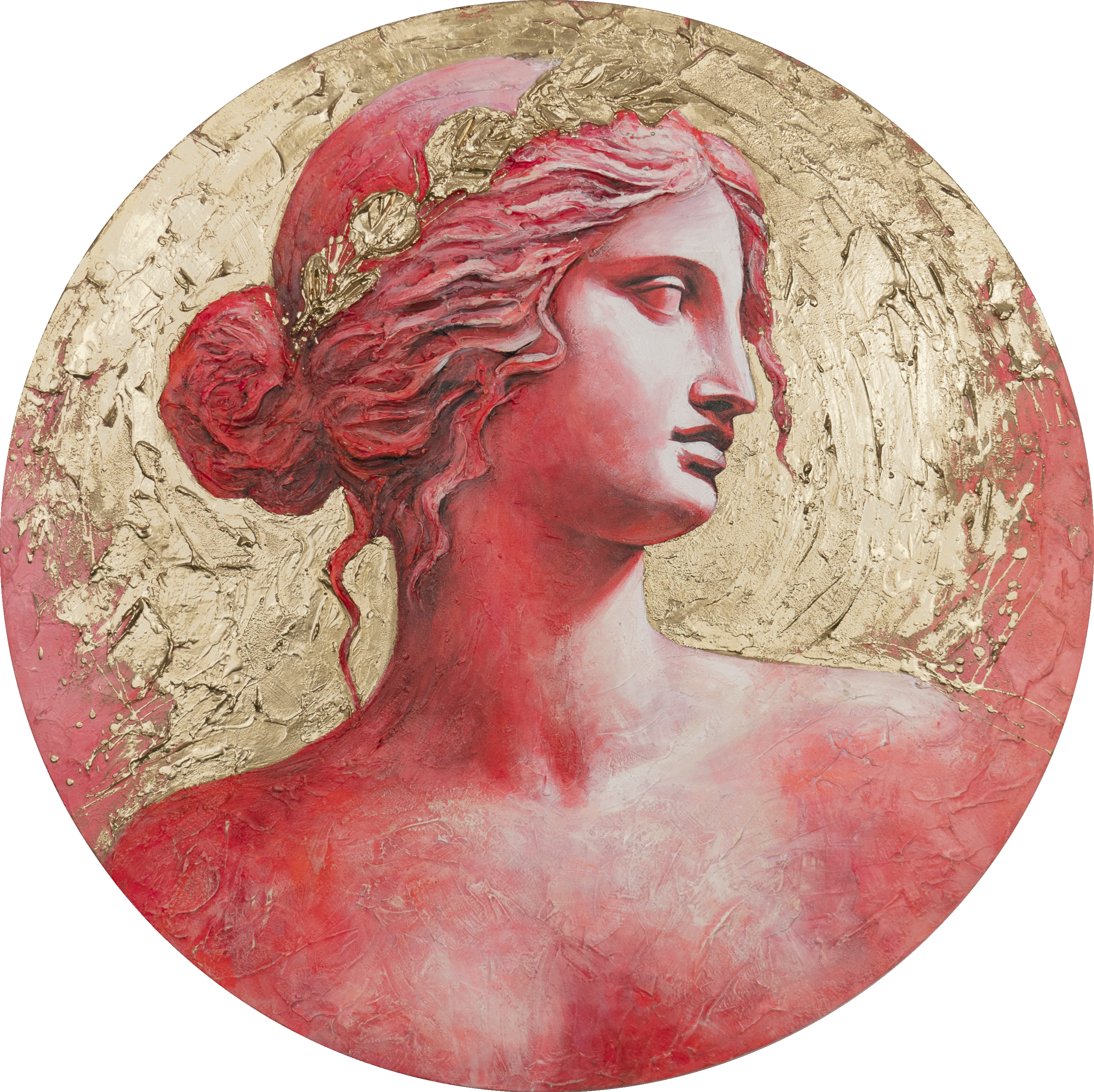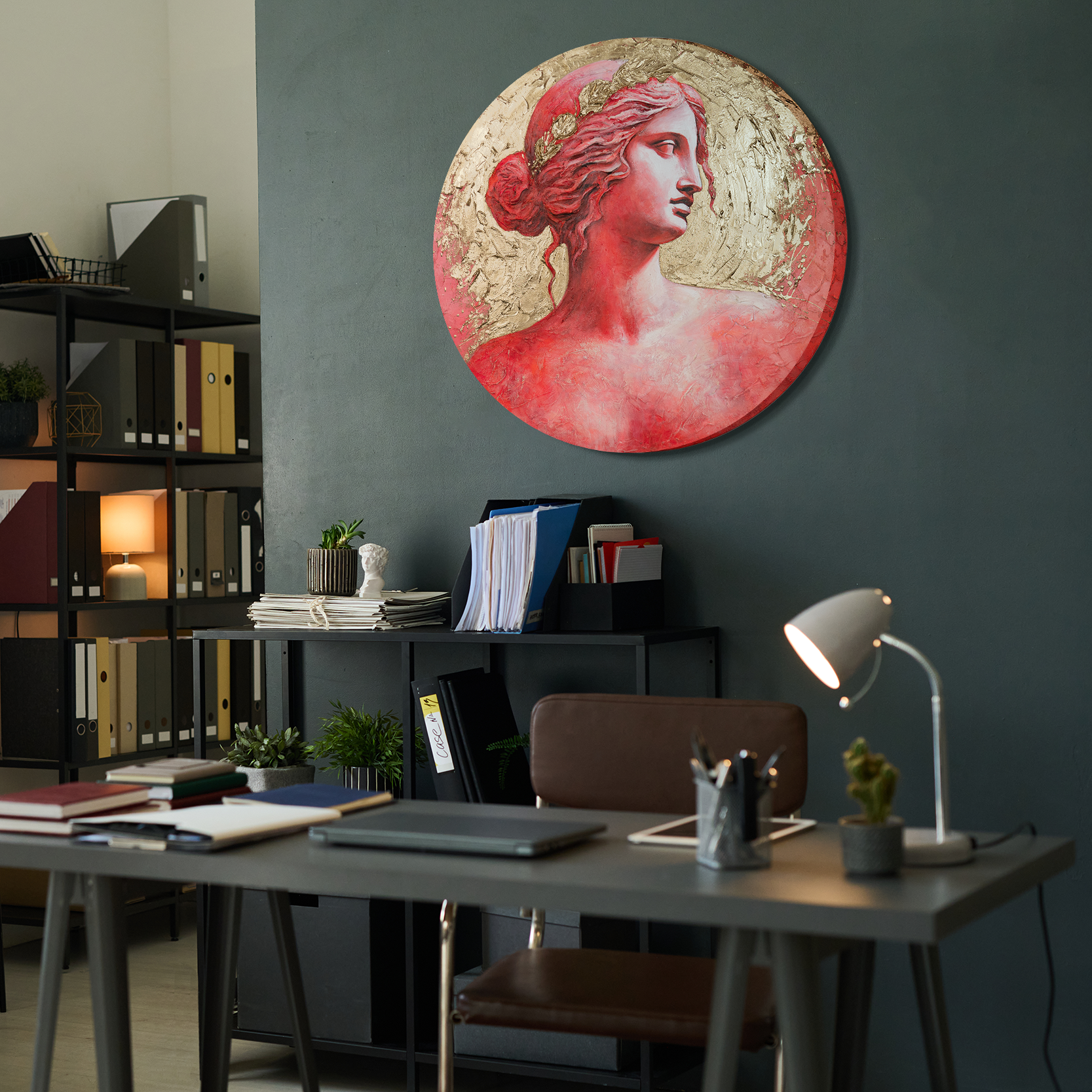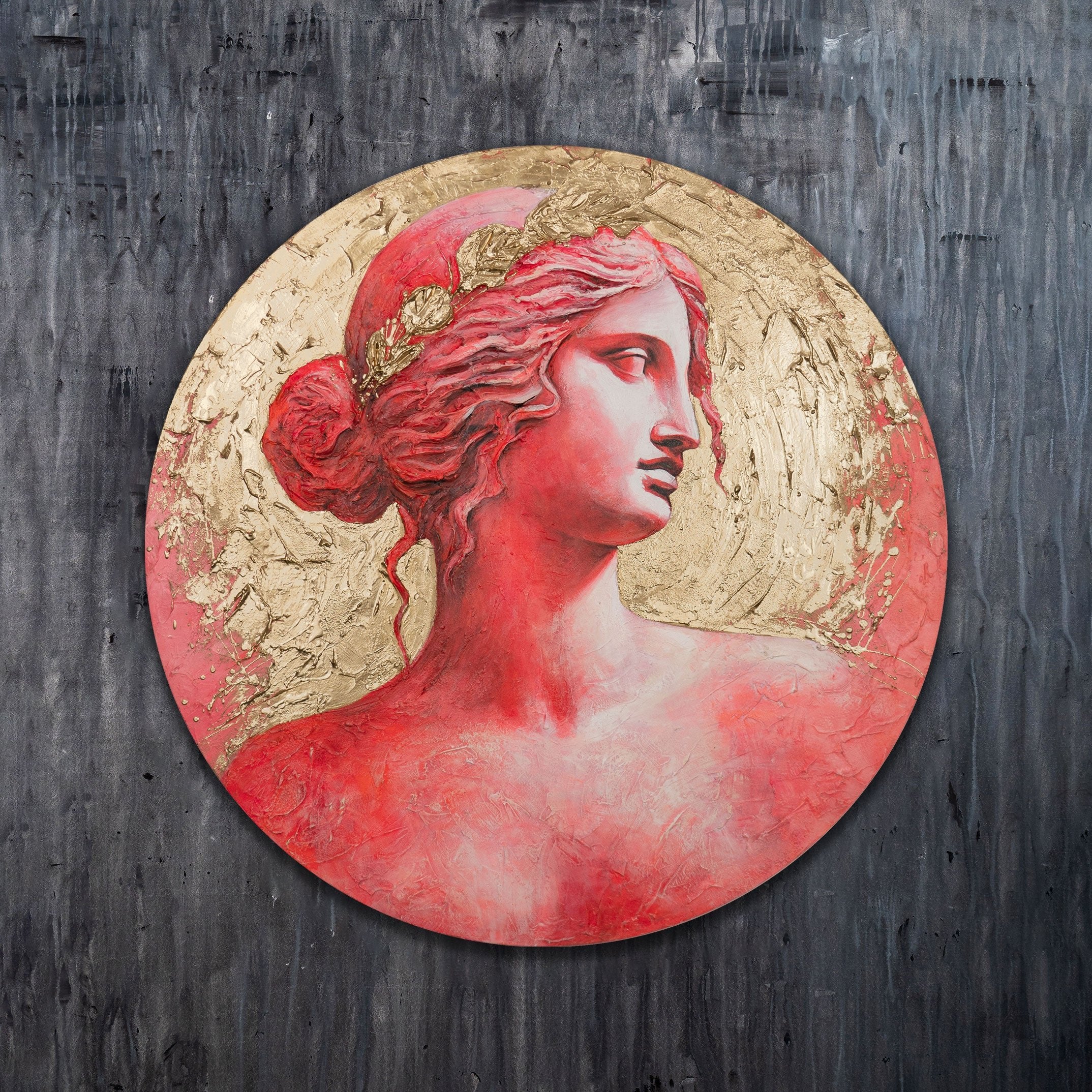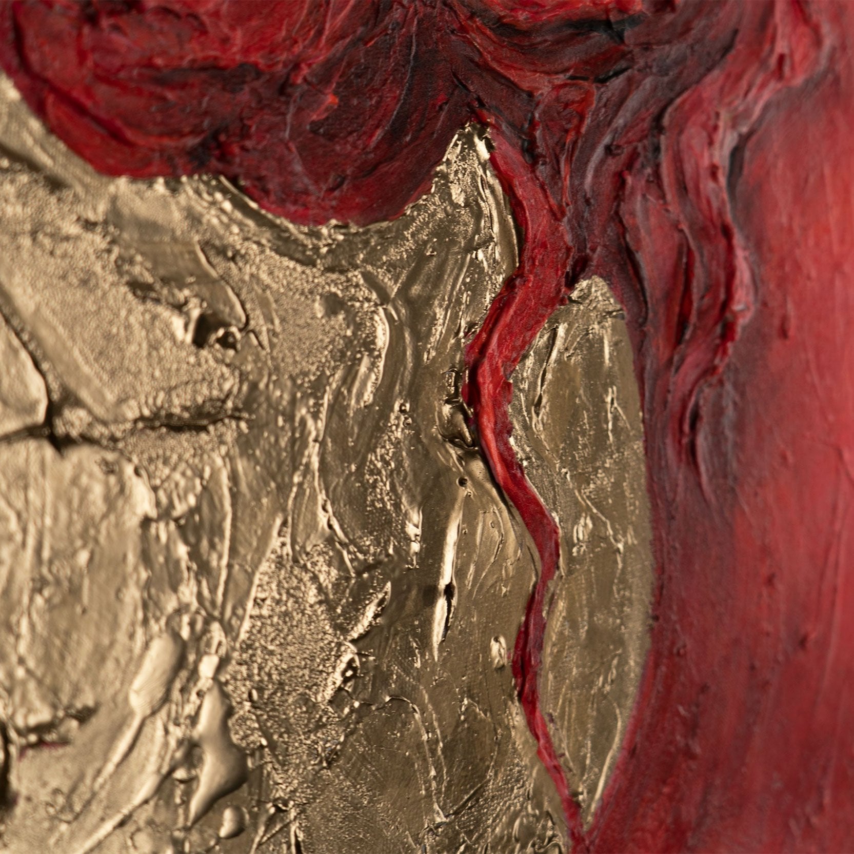 Das handgemalte Kunstwerk "Golden Radiance" beeindruckt durch seine zeitlose Eleganz und leuchtenden Farben. Die Kombination aus intensiven Rot- und warmen Goldtönen schafft eine unvergleichliche Dynamik, die jeden Raum aufwertet. Diese runde Komposition zeigt eine klassische Silhouette, die durch schimmernde Texturen hervorgehoben wird, und bringt eine harmonische Atmosphäre in Ihr Zuhause oder Büro.