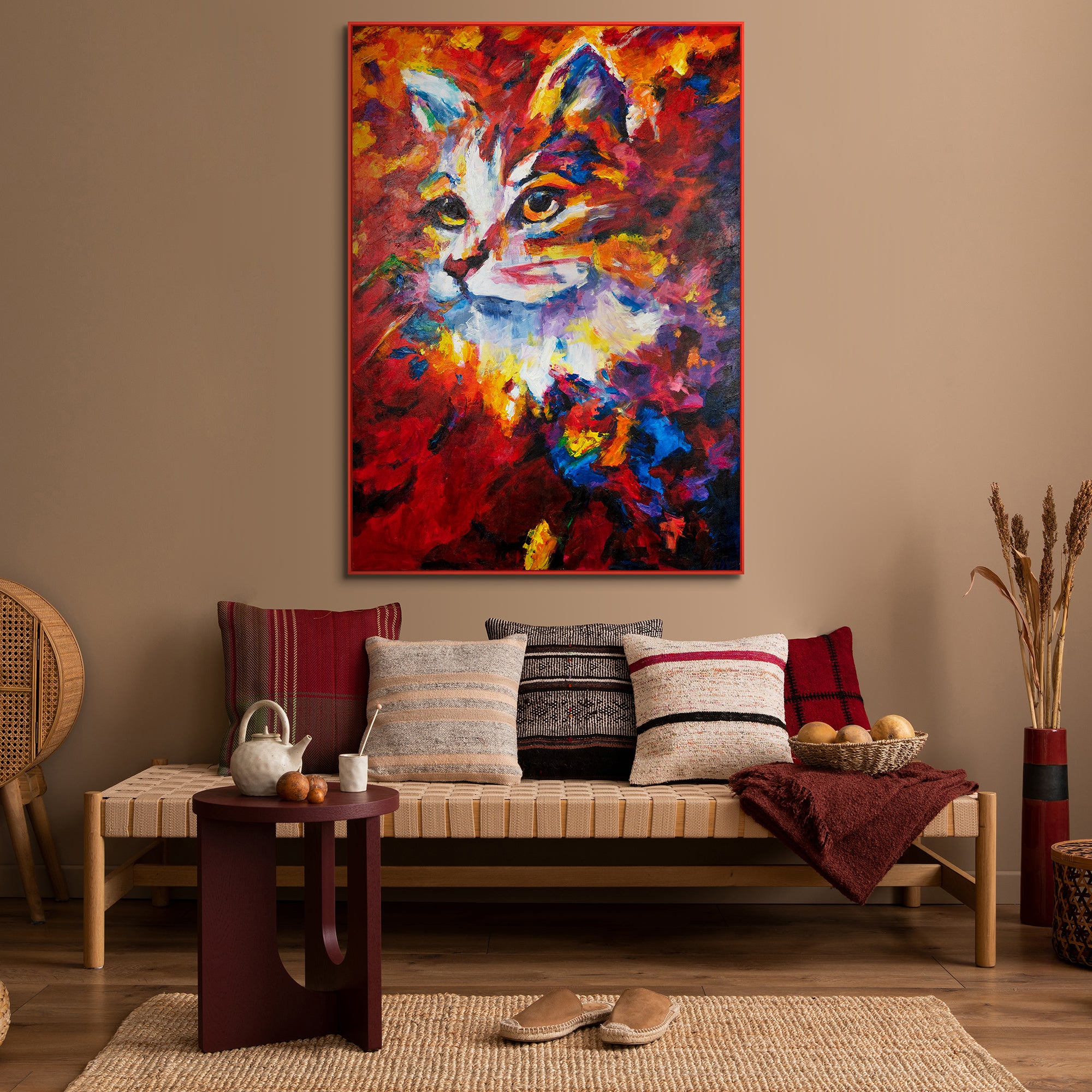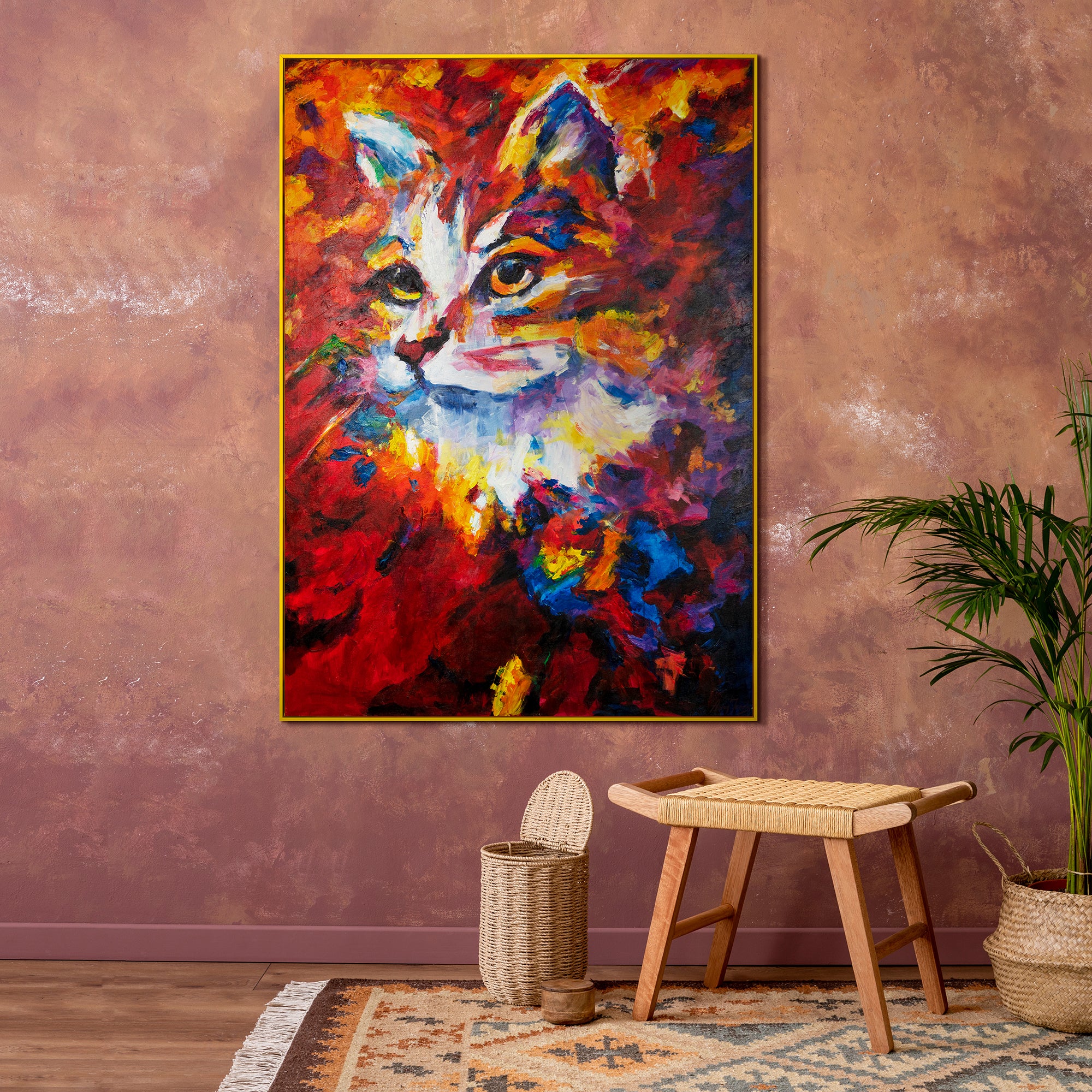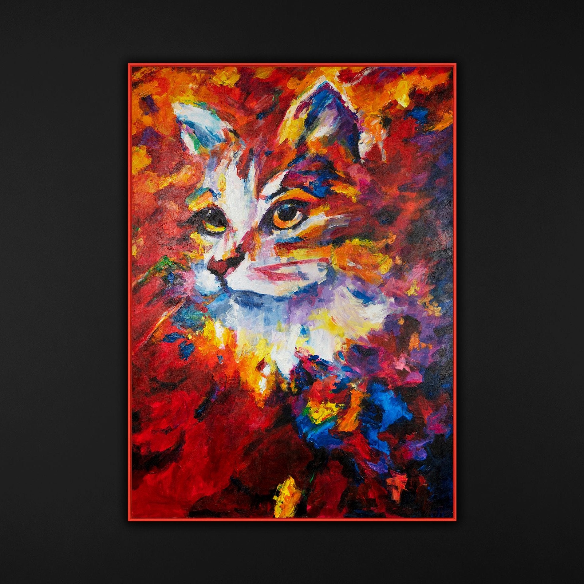 Das Acrylbild 'Bunte Katze' zeigt die lebendige Darstellung einer Katze in einer farbenfrohen, abstrakten Art. Mit intensiven Rot-, Blau- und Gelbtönen wird die Energie und Verspieltheit der Katze auf eine eindrucksvolle Weise eingefangen.