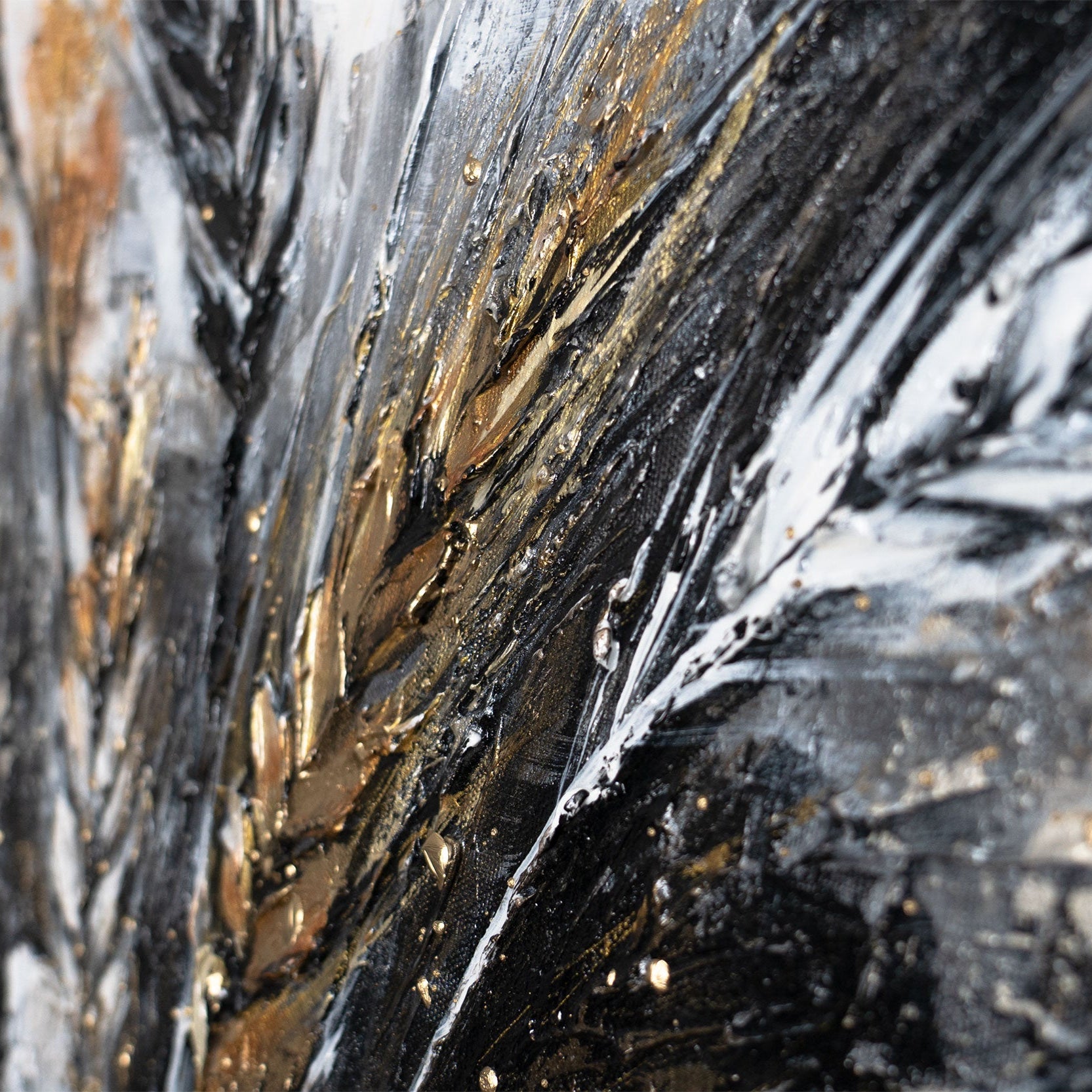 Diese Acrylmalerei wurde mit viel Liebe zum Detail auf Leinwand gefertigt und passt hervorragend zu stilvoll eingerichteten Wohn- oder Büroräumen. Die goldenen Akzente verleihen dem Bild einen edlen Charakter, während die abstrakte Gestaltung zeitgenössische Kunst in den Alltag bringt.