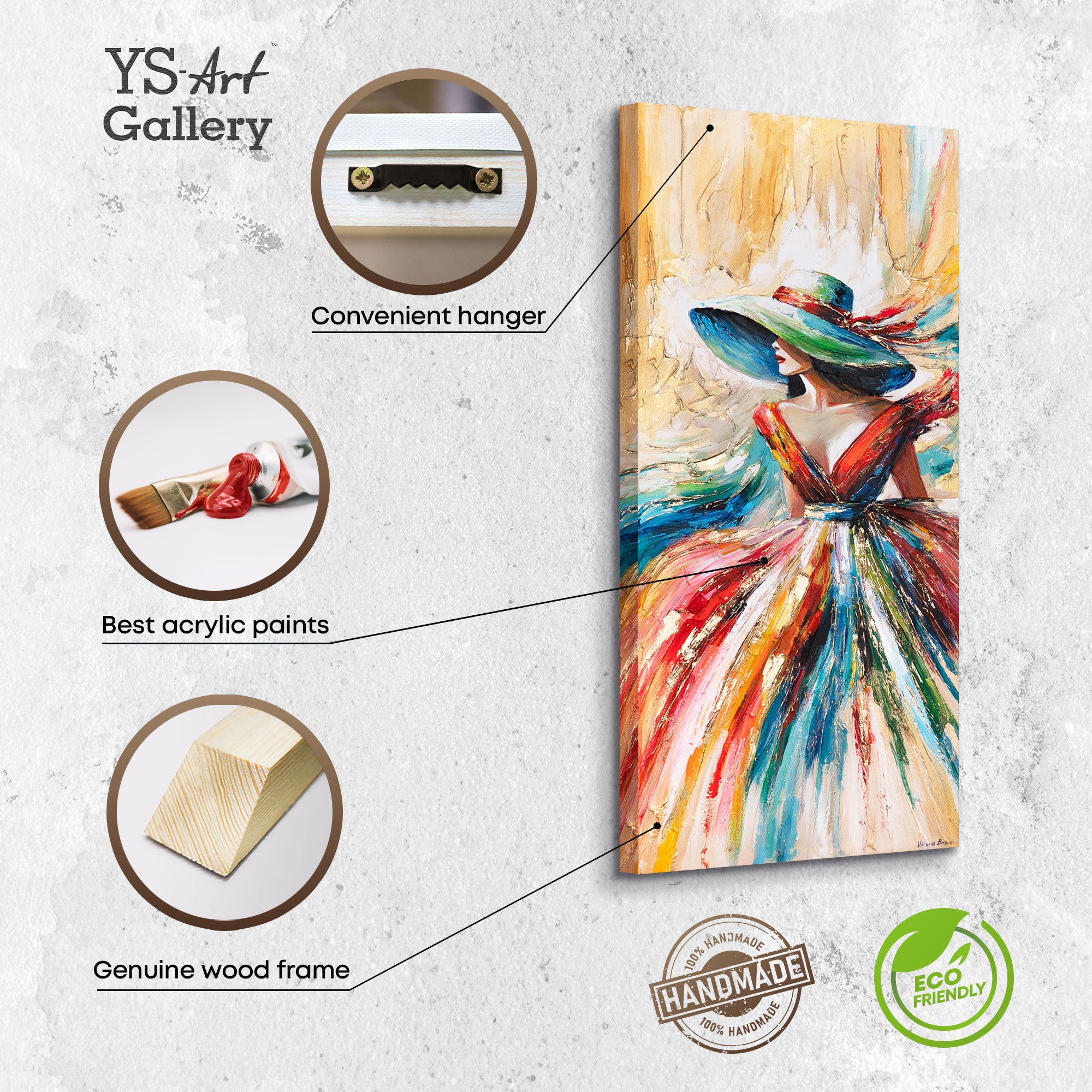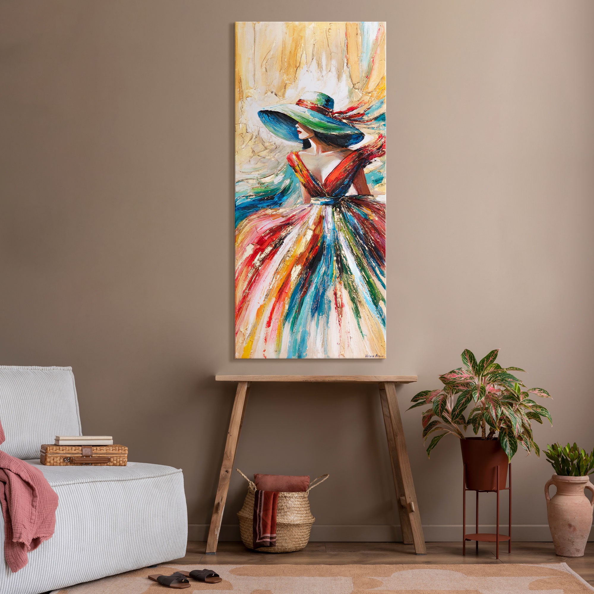 Das Kunstwerk „Strahlende Schönheit“ zeigt eine stilvolle Frauenfigur in einem fließenden, farbenfrohen Kleid mit weitem Hut. Die dynamischen Pinselstriche und strukturierte Oberfläche bringen Bewegung und Eleganz auf die Leinwand.