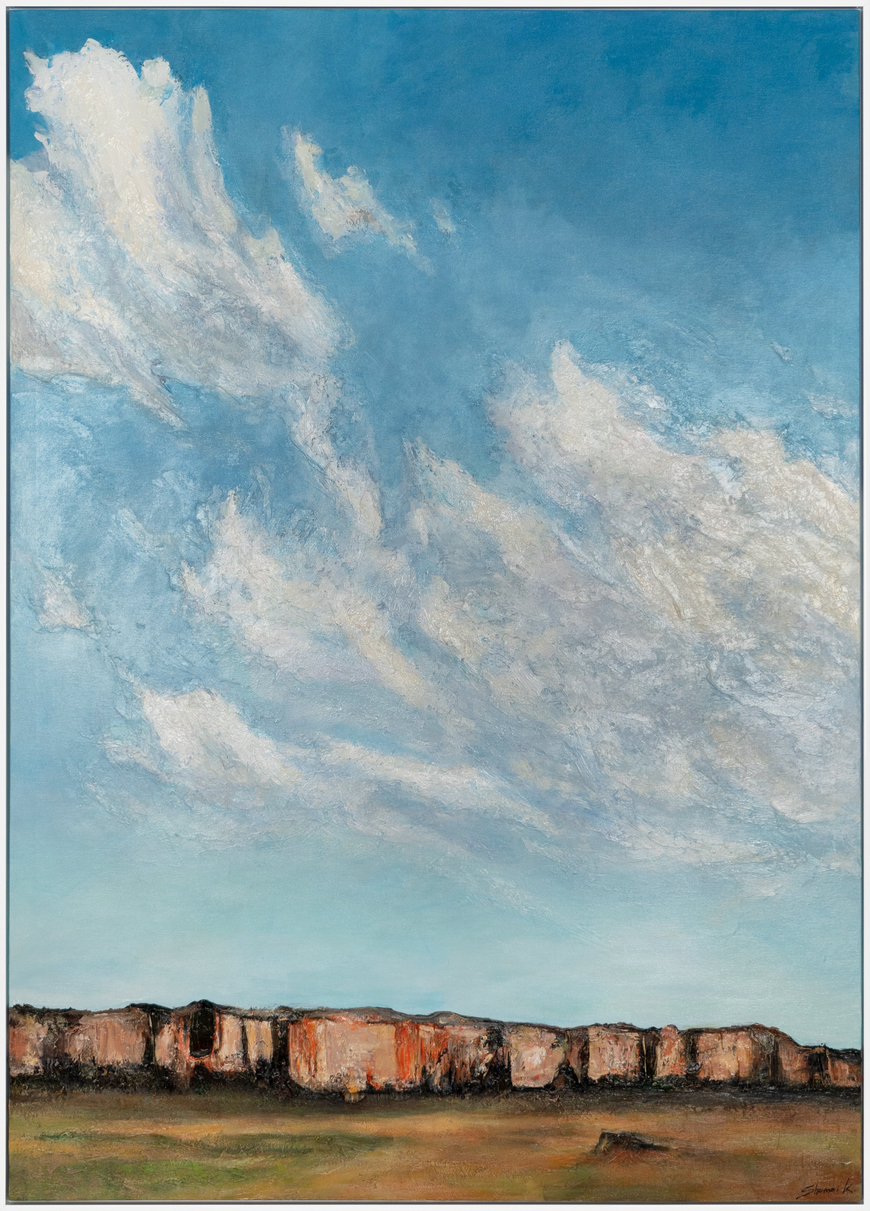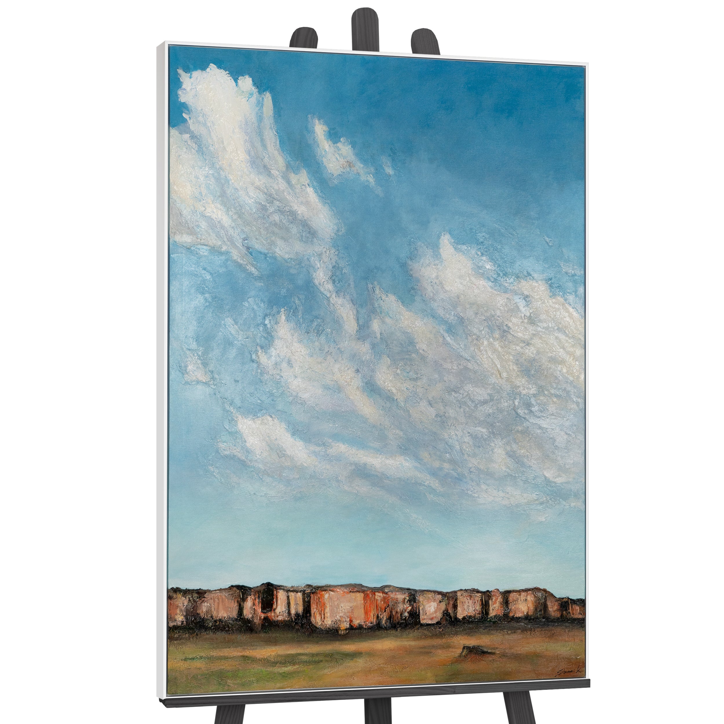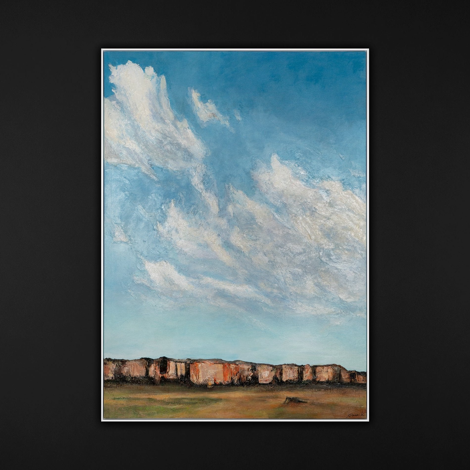 Dieses beeindruckende Acrylgemälde fängt die Weite des Himmels und die Ruhe der Natur in einer einzigartigen, handgemalten Darstellung ein. Der dramatische Himmel, der sich über die weitläufige Ebene erstreckt, schafft eine friedliche und dennoch kraftvolle Atmosphäre.
