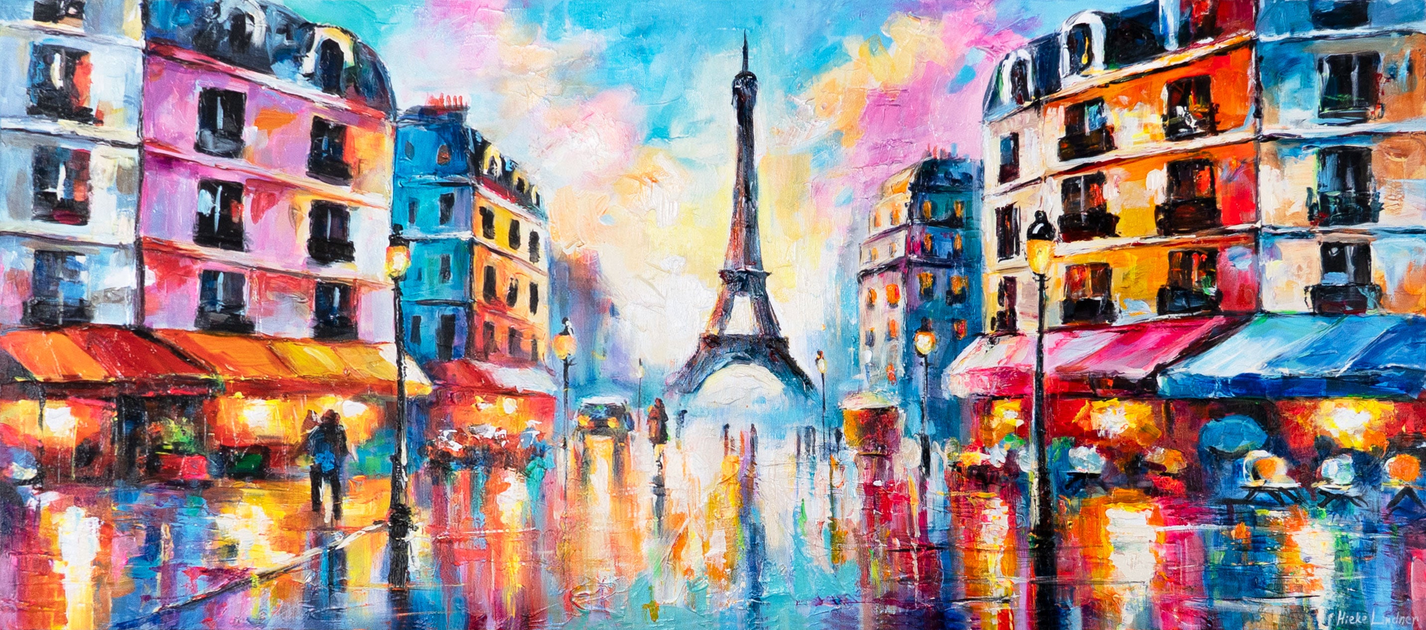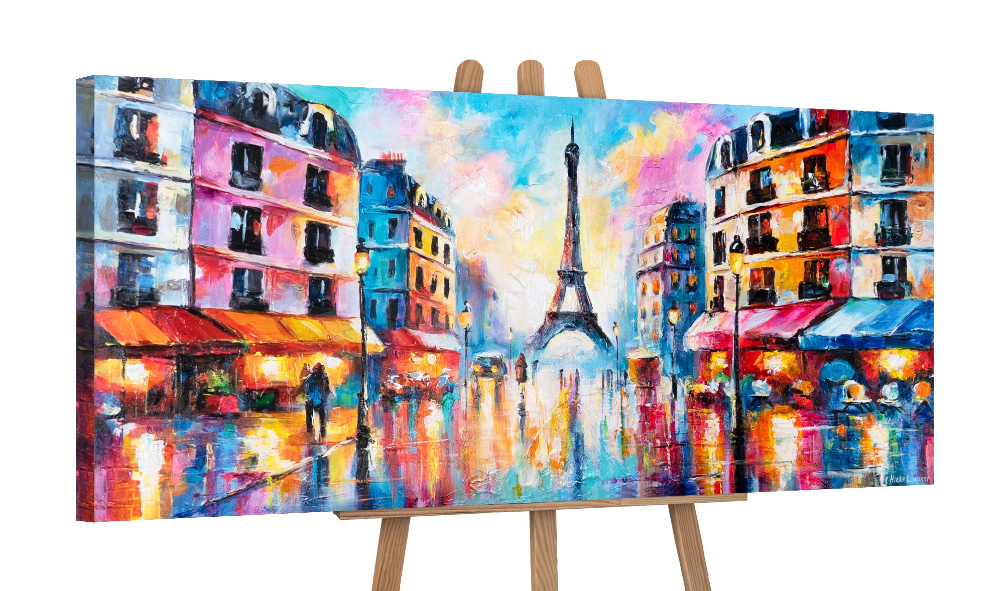 Das Gemälde „Pariser Lichter“ zeigt eine impressionistische Stadtansicht mit dem Eiffelturm im Hintergrund. Kräftige Farben, Lichterreflexionen und lebendige Pinselstriche verleihen der Szene eine besondere Atmosphäre zwischen Romantik und Großstadtflair.
