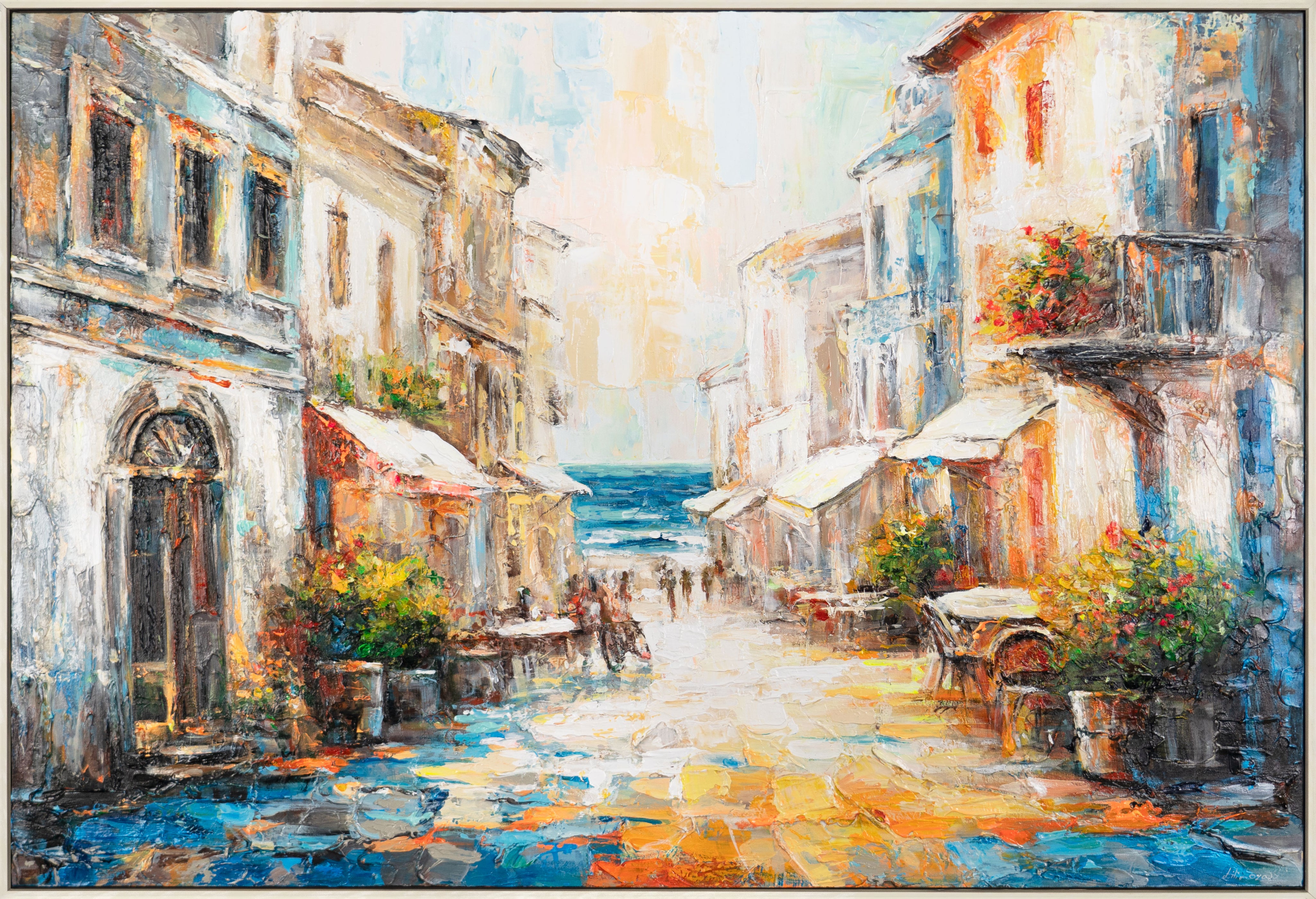 Das handgemalte Leinwandbild „Warme Brise“ fängt die lebendige Stimmung eines sonnigen Küstenortes mit seiner harmonischen Farbkomposition aus warmen und kühlen Tönen ein. Die kräftigen Pinselstriche und die feine Struktur der Oberfläche verleihen dem Bild Tiefe und Lebendigkeit, die jeden Raum bereichern. Sanfte Gelb- und Blautöne mischen sich mit leuchtendem Orange und Erdtönen und erzeugen so ein inspirierendes und zugleich beruhigendes Ambiente.