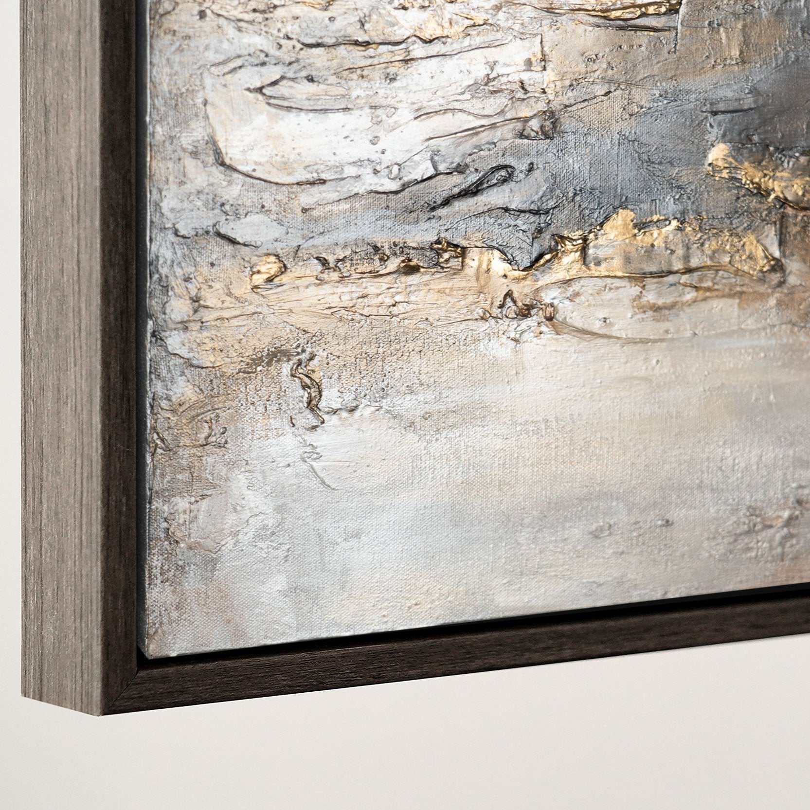 • Nahaufnahme eines handgemalten abstrakten Kunstwerks mit goldenen und grauen Texturen, moderne Wanddekoration