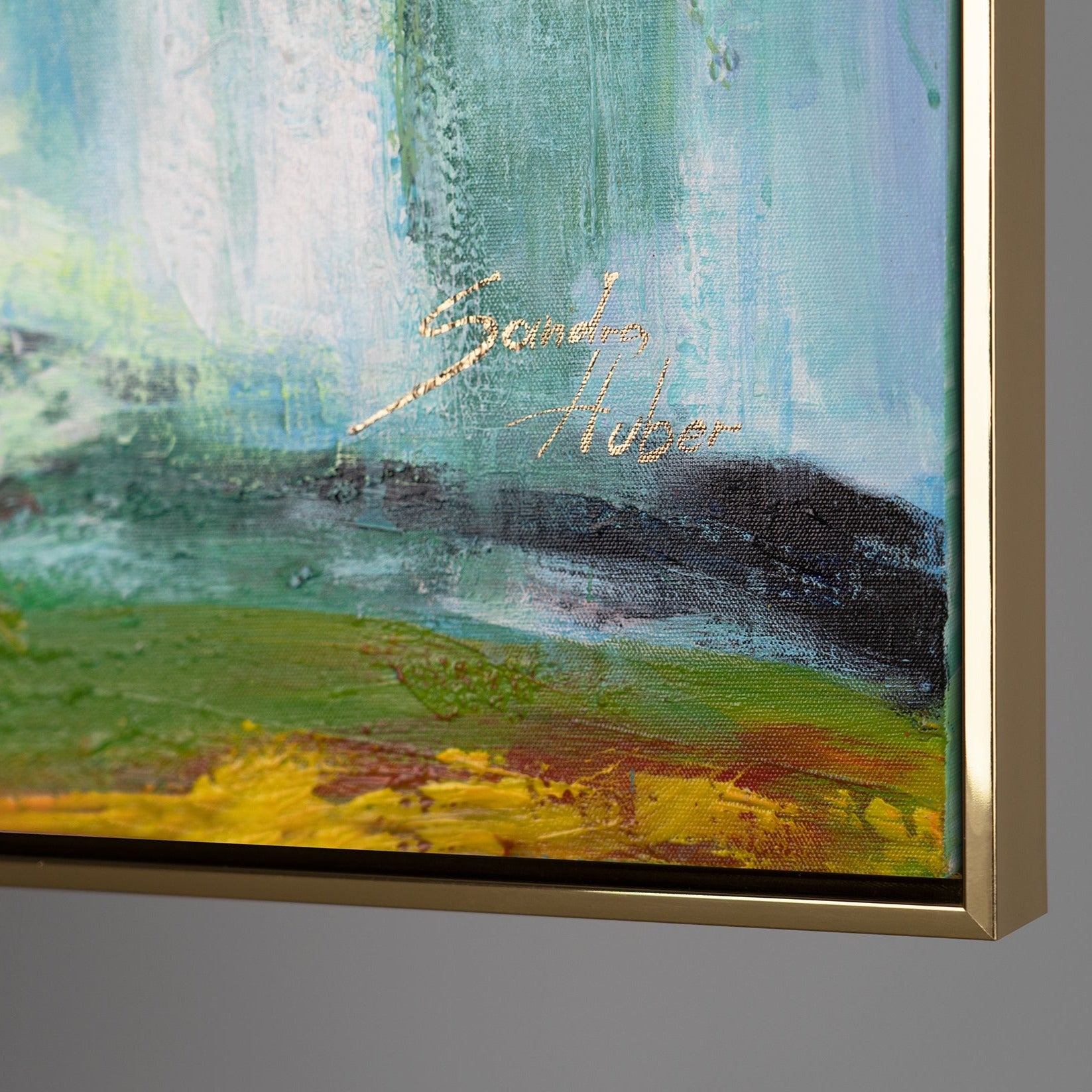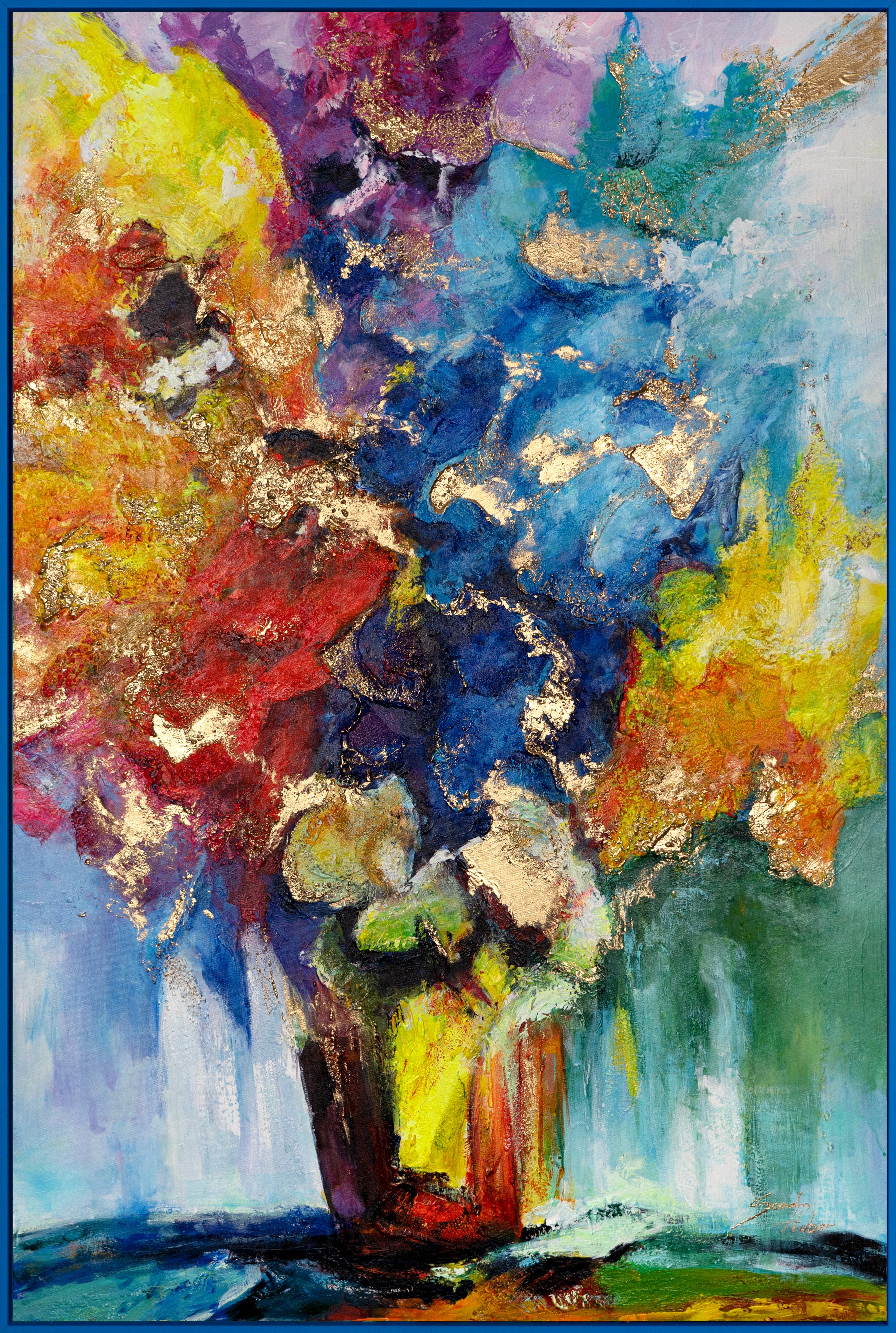 Enriquece tu hogar u oficina con esta colorida obra de arte abstracta que representa un ramo de flores lleno de vida y color. La pintura destaca por sus contrastes intensos y sus pinceladas expresivas. Está 100% pintada a mano y realzada con un marco dorado elegante que aporta un toque sofisticado y moderno.