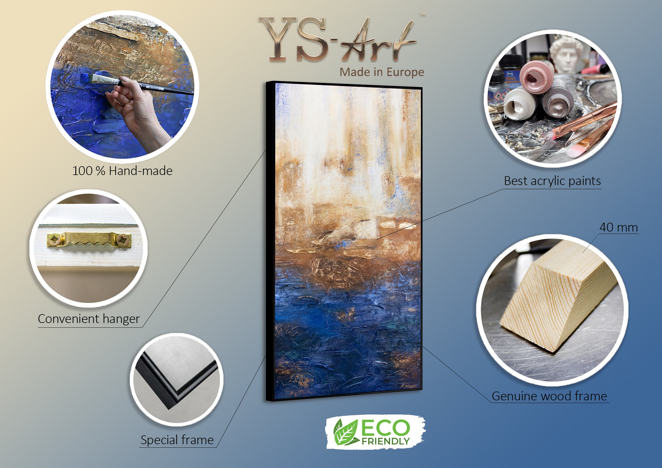 • Disponible en 1 tamaño: 90x90 cm. Bajo pedido, el cuadro también puede ser pintado en otros tamaños.