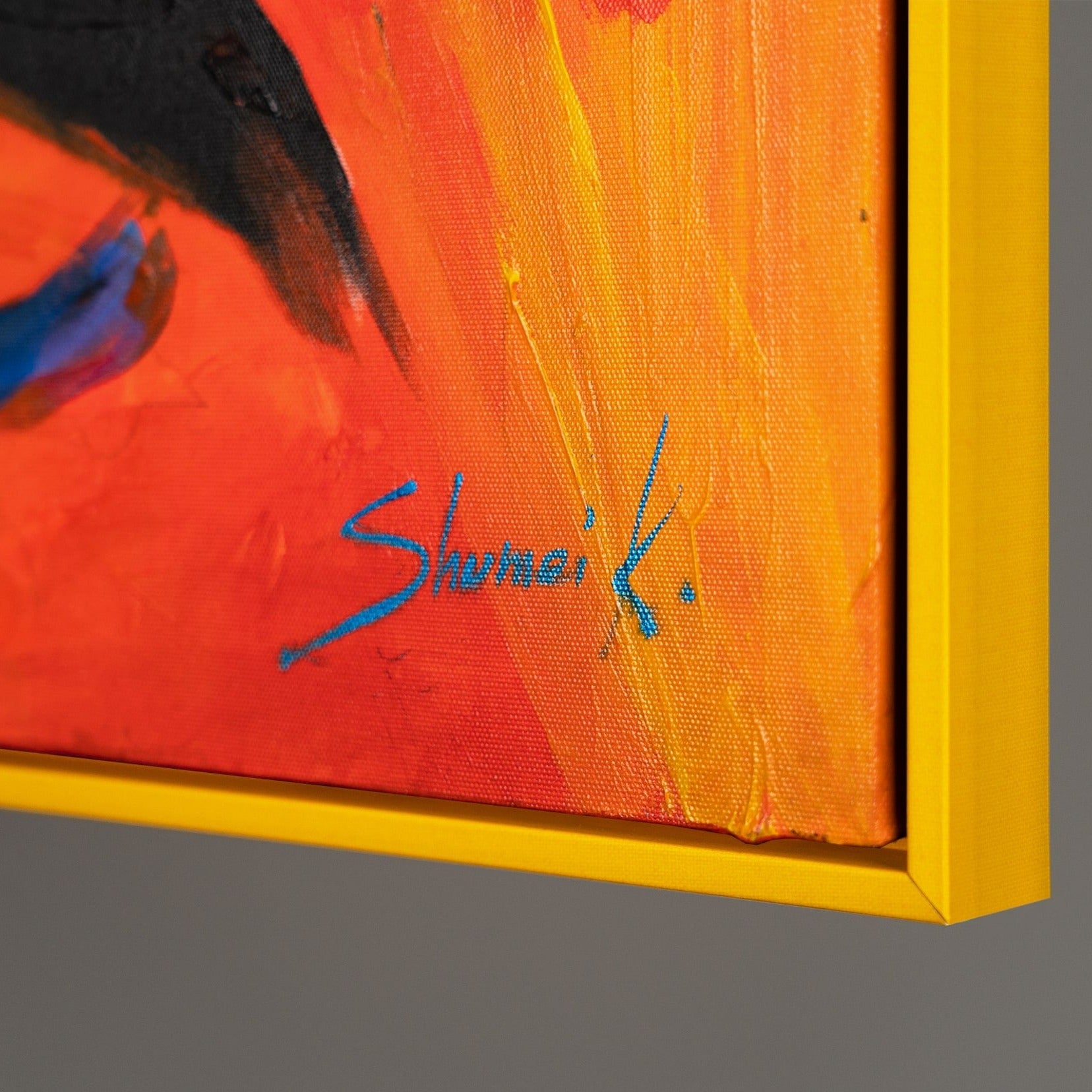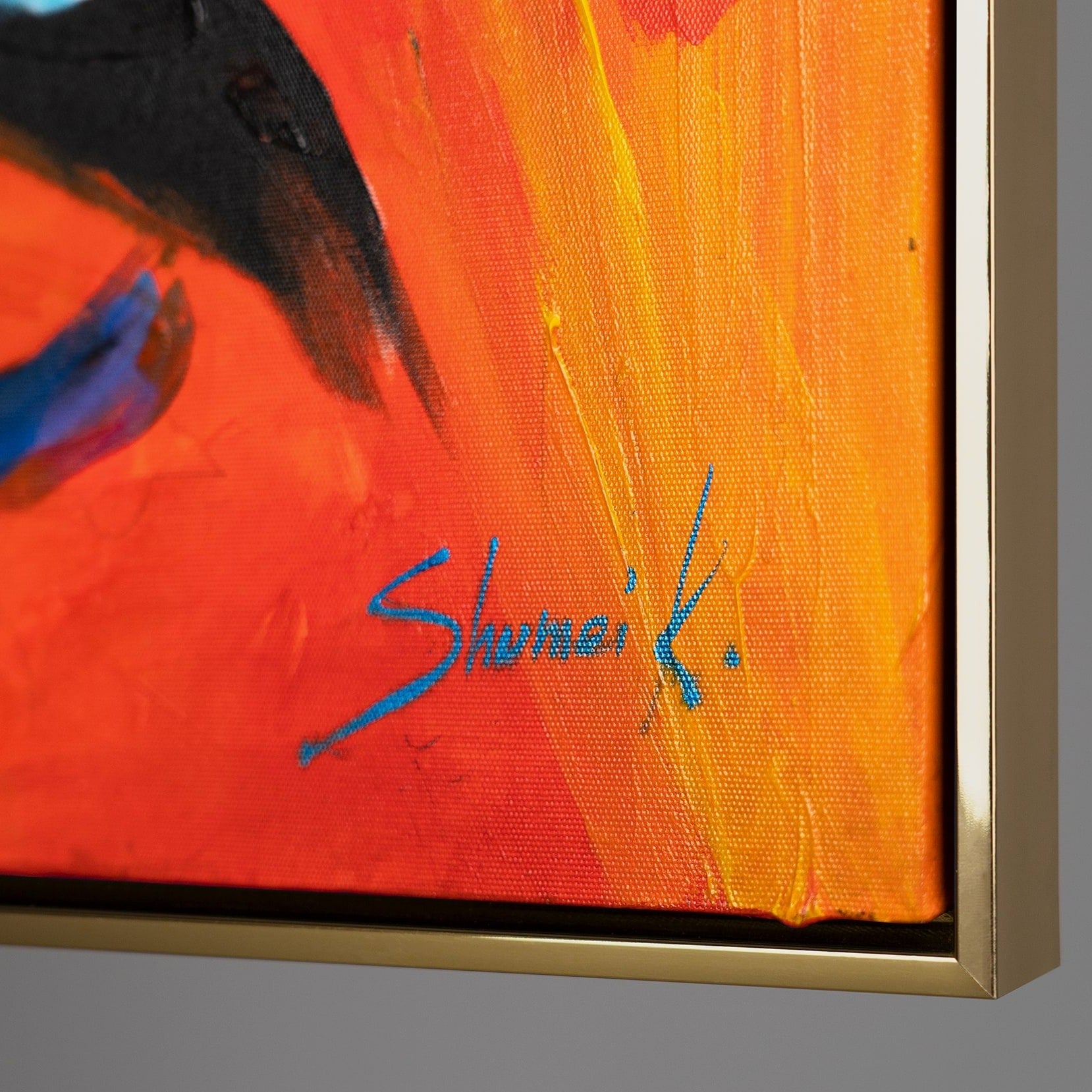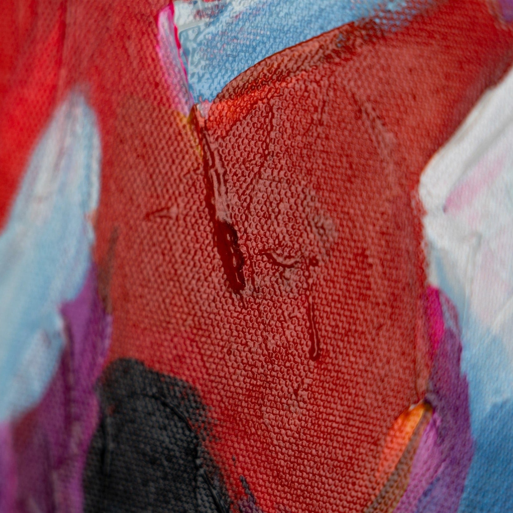 Enriquezca su hogar con esta pintura abstracta y colorida que representa las emociones y rostros de dos personas en tonos vibrantes. El cuadro destaca por sus colores intensos y pinceladas dinámicas. Está 100% pintado a mano y realzado con un elegante marco azul moderno.
