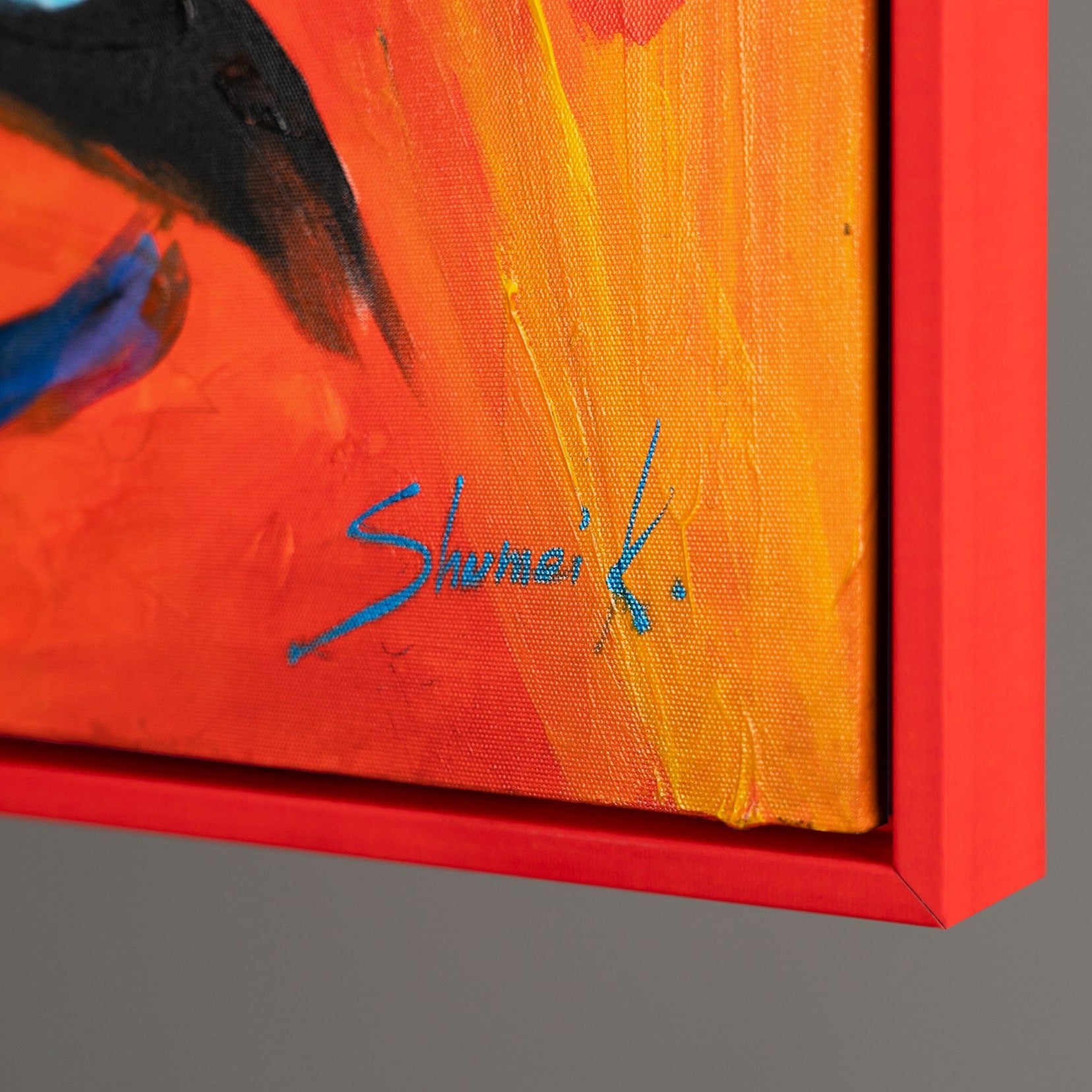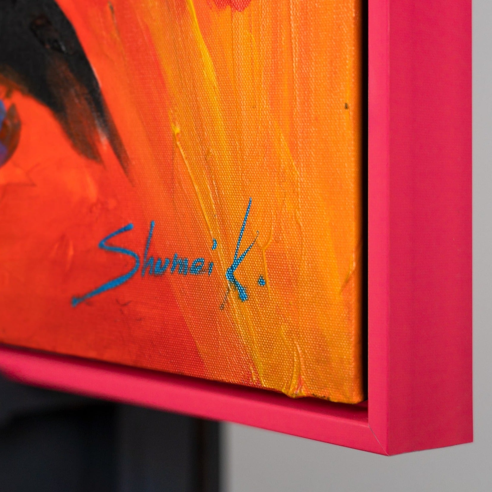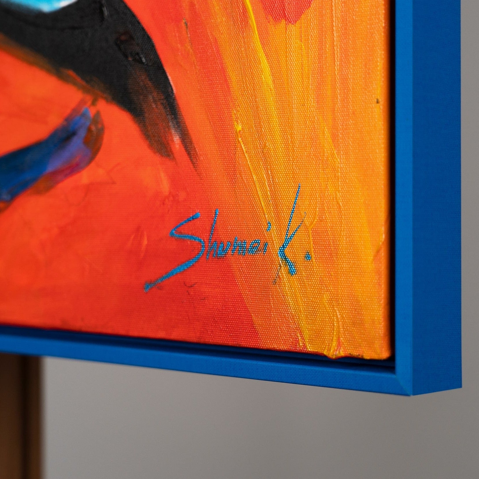 Enriquezca su hogar con esta pintura abstracta y colorida que representa las emociones y rostros de dos personas en tonos vibrantes. El cuadro destaca por sus colores intensos y pinceladas dinámicas. Está 100% pintado a mano y realzado con un elegante marco azul moderno.