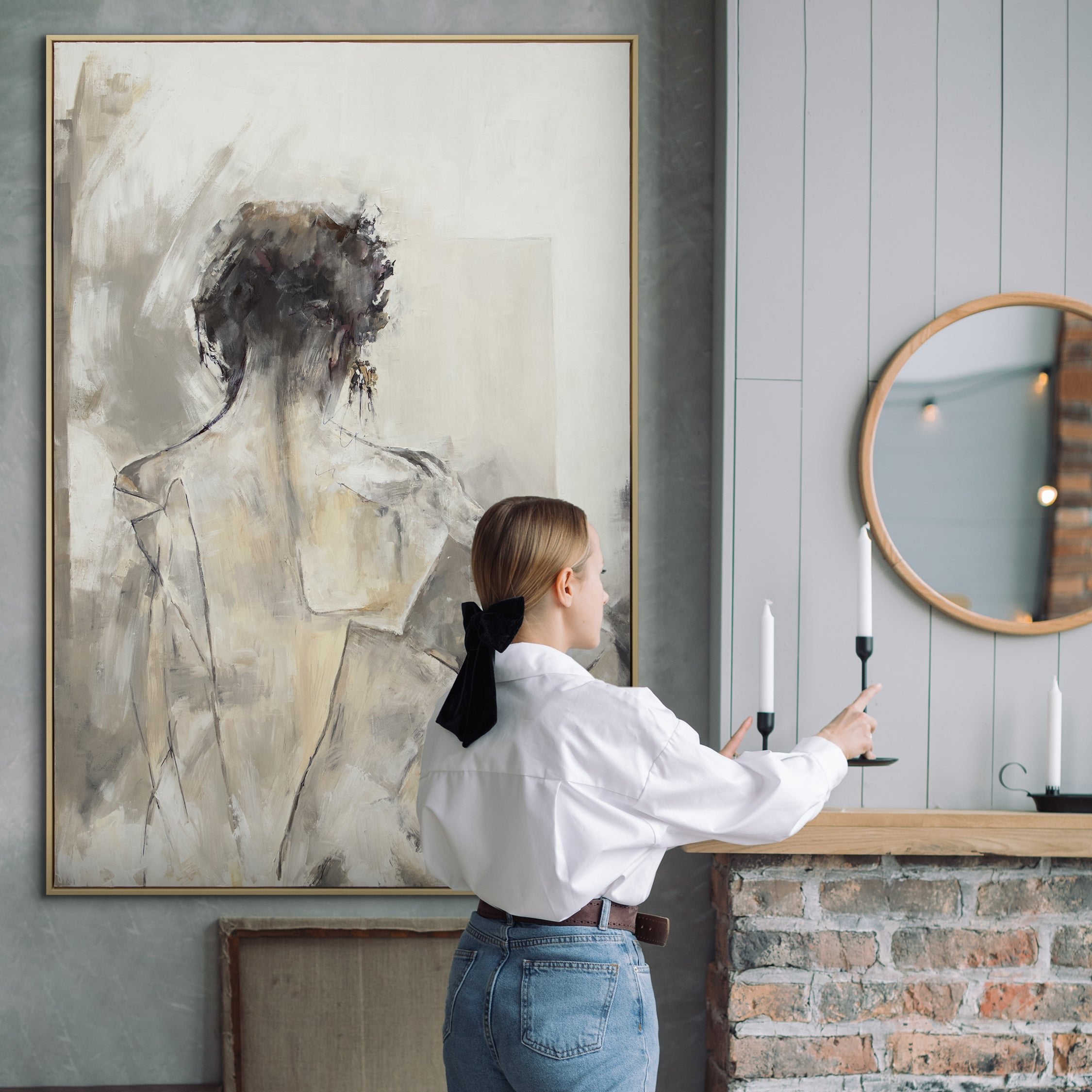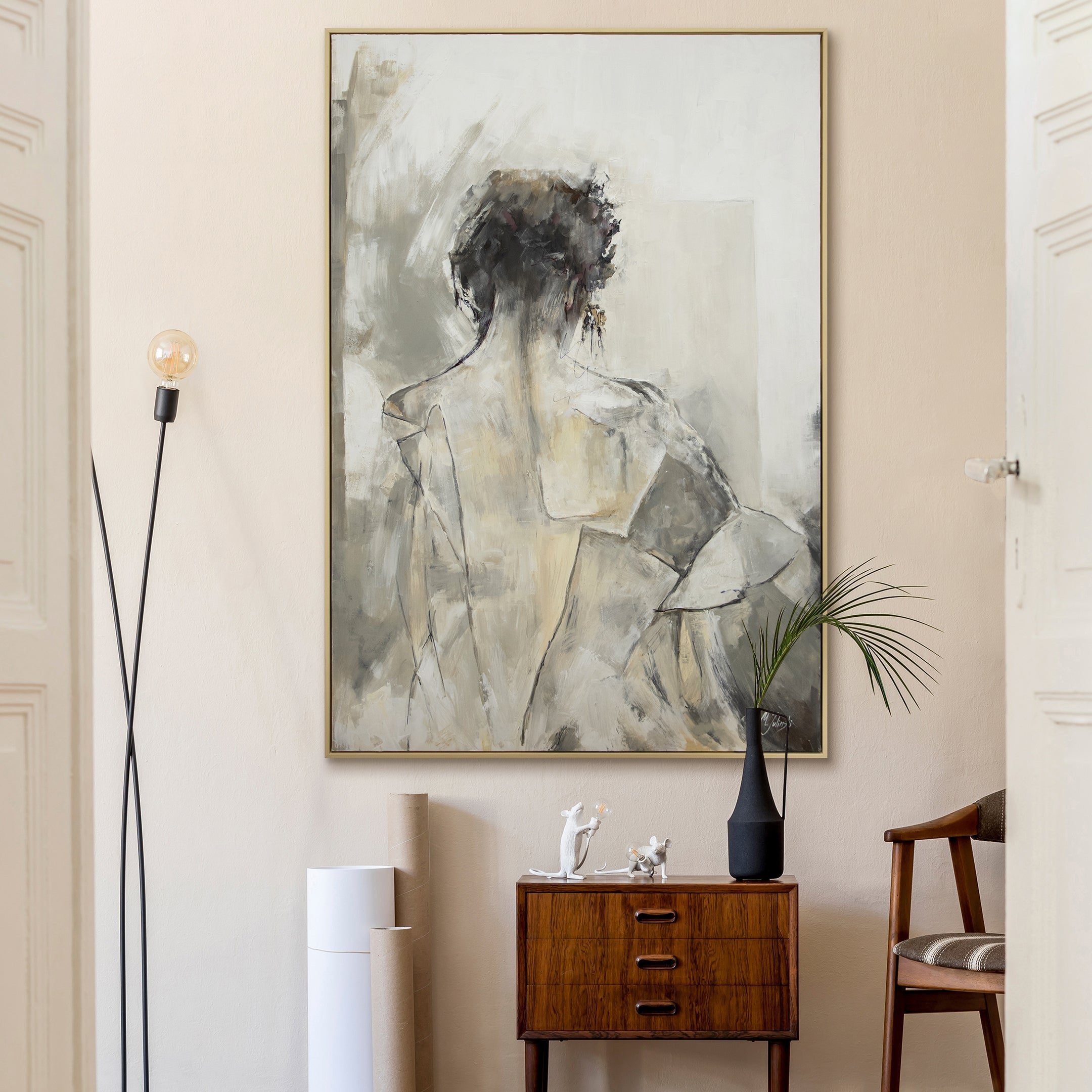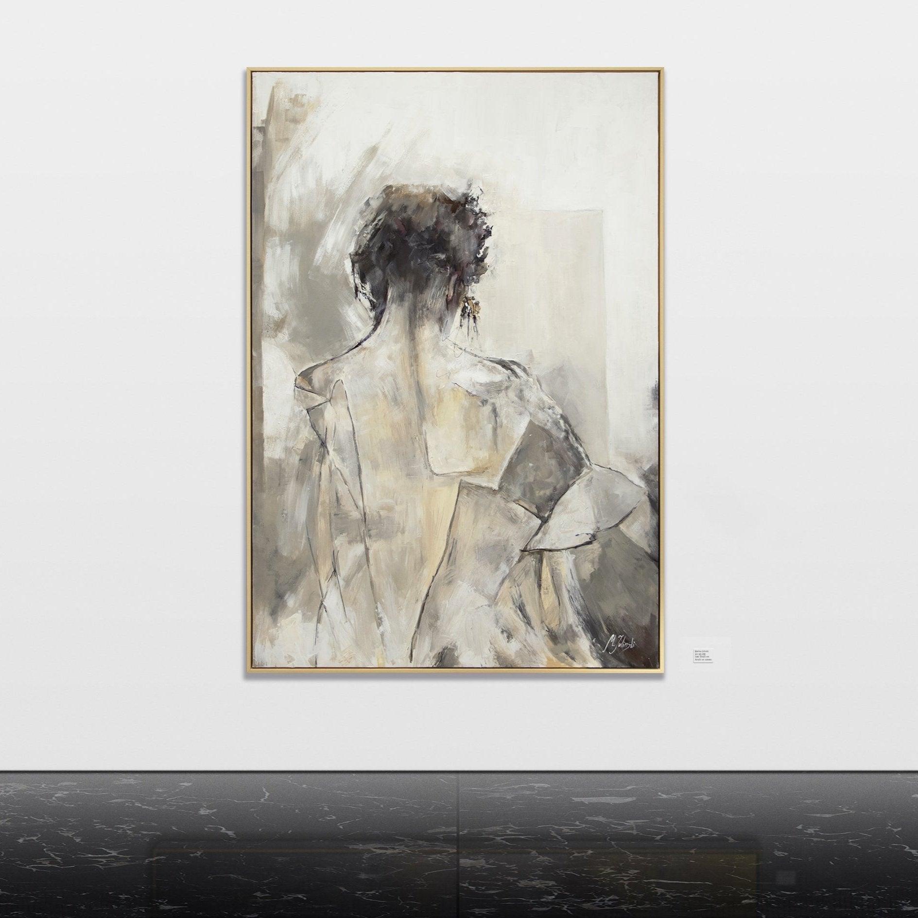 Esta impresionante pintura abstracta muestra la vista trasera de una figura femenina, representada con suaves tonos y pinceladas expresivas. La armoniosa combinación de grises, beige y negro confiere a la obra una estética elegante y atemporal.