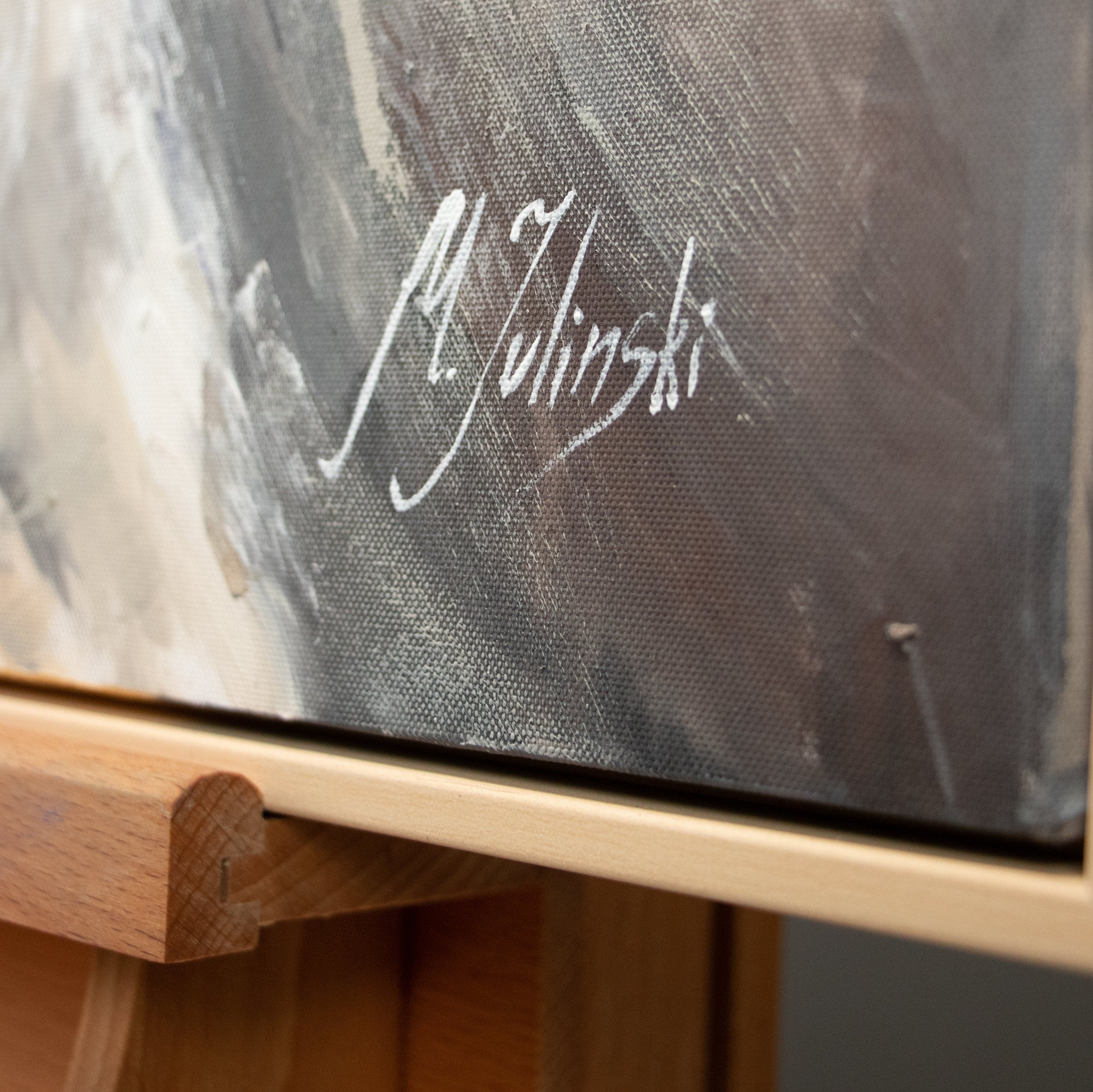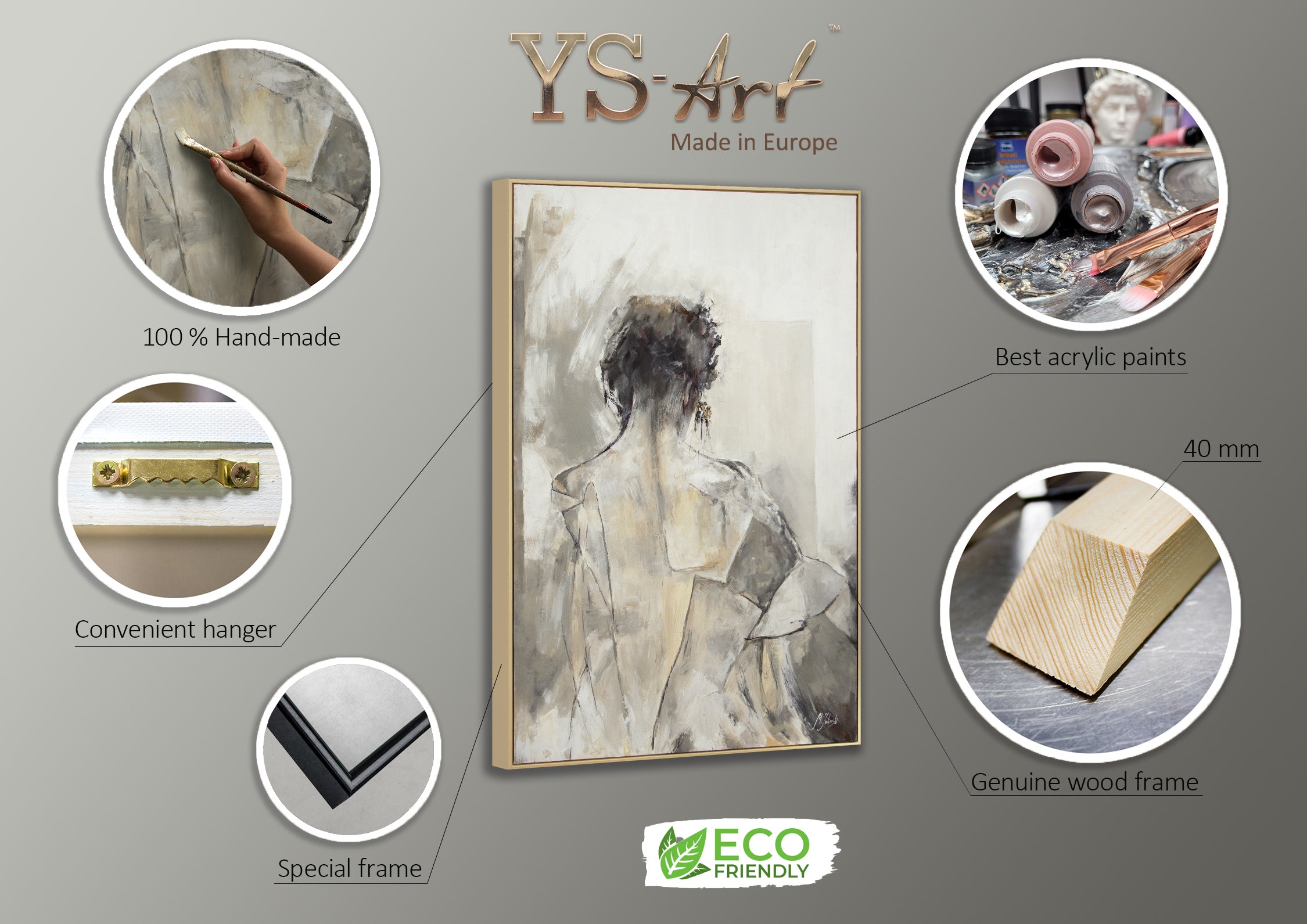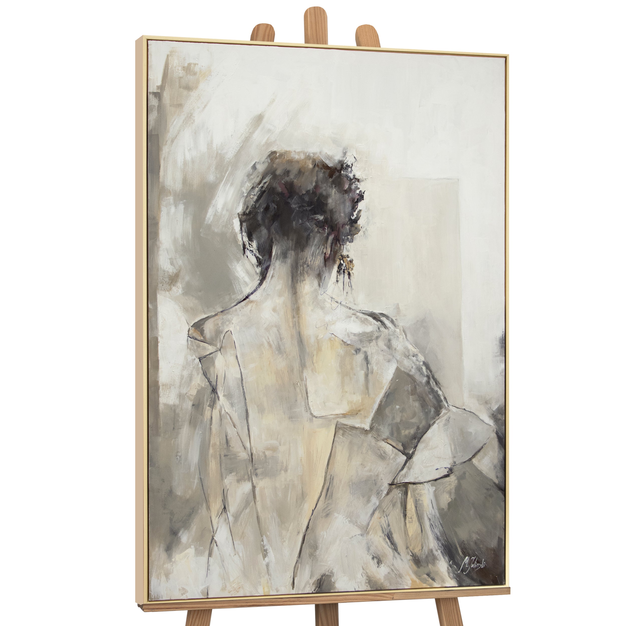Esta impresionante pintura abstracta muestra la vista trasera de una figura femenina, representada con suaves tonos y pinceladas expresivas. La armoniosa combinación de grises, beige y negro confiere a la obra una estética elegante y atemporal.