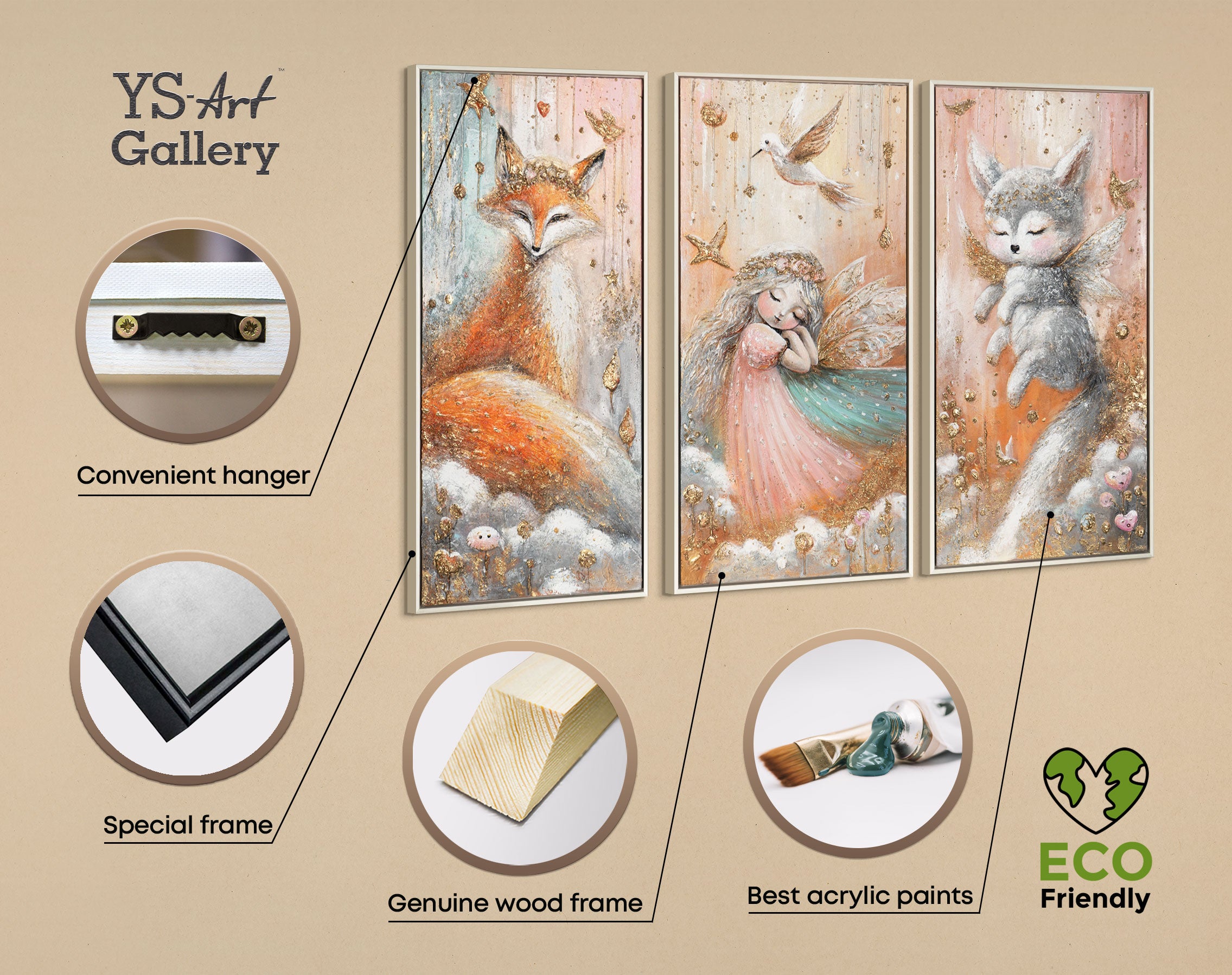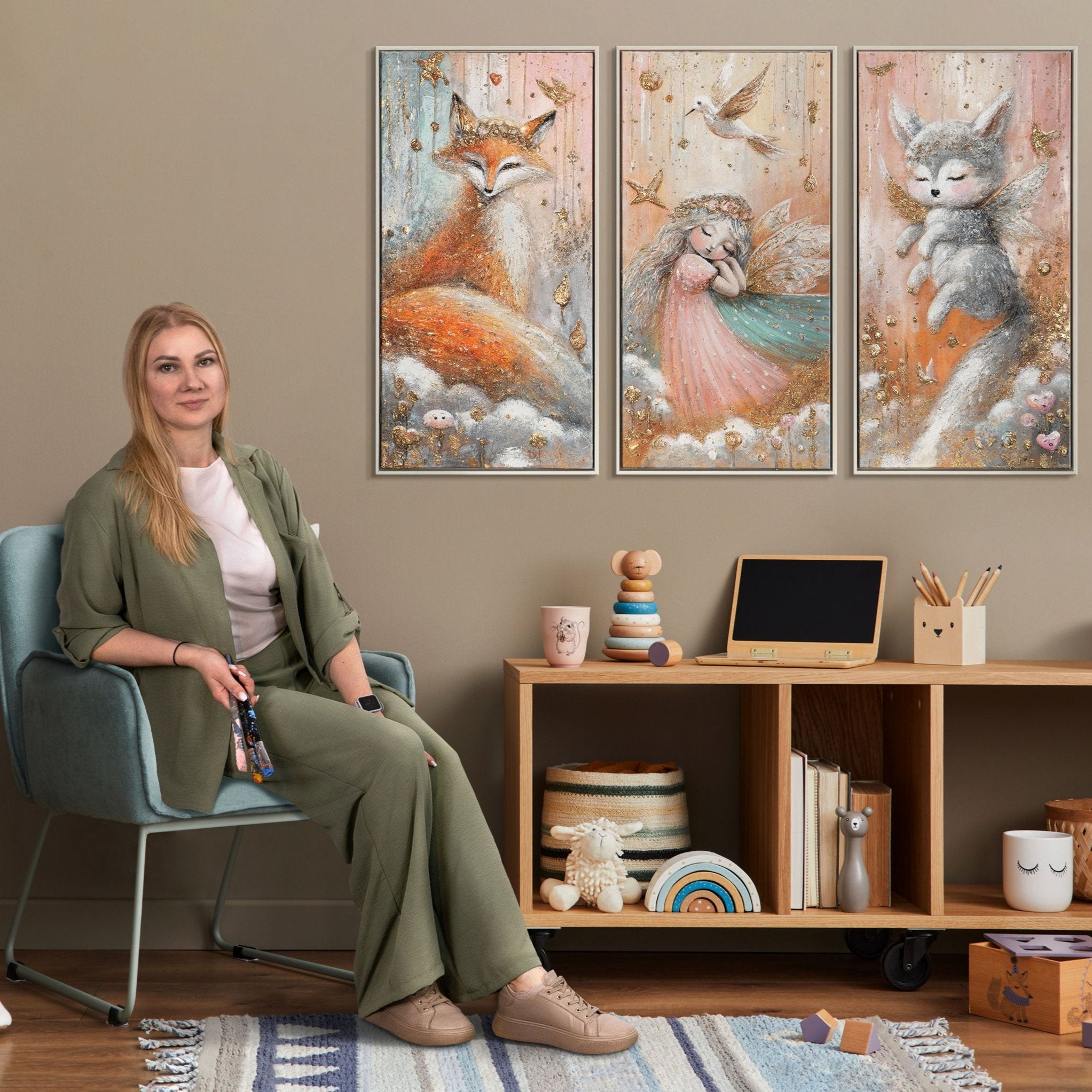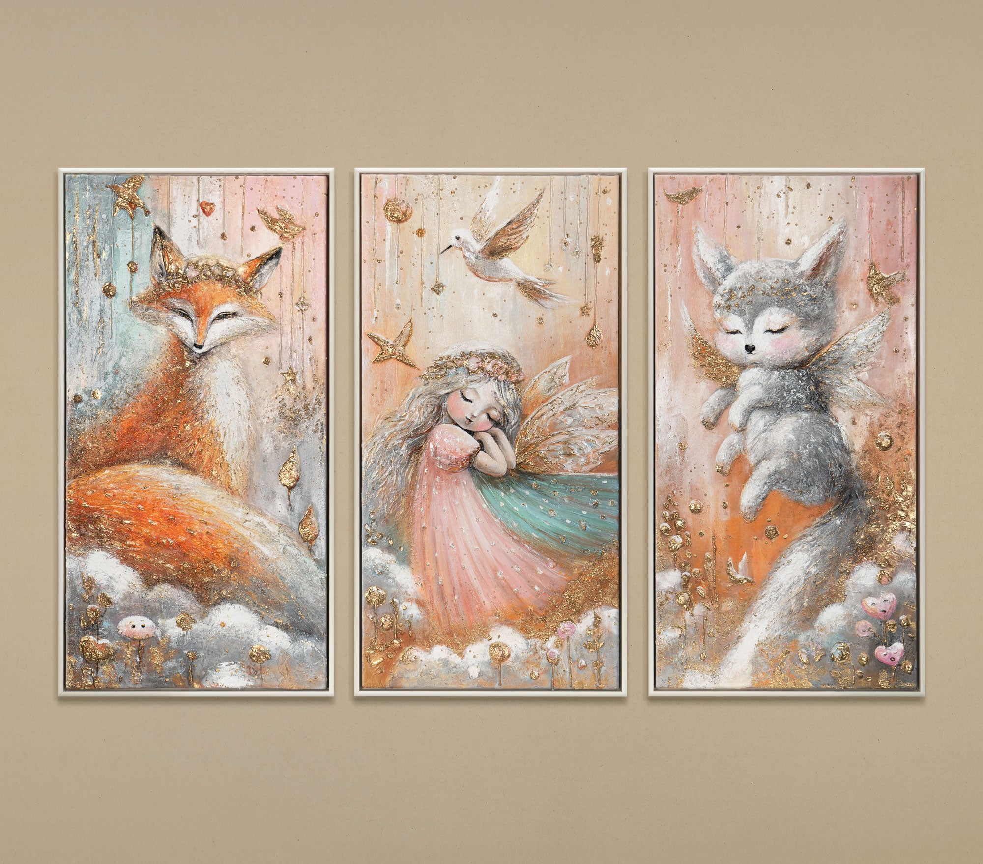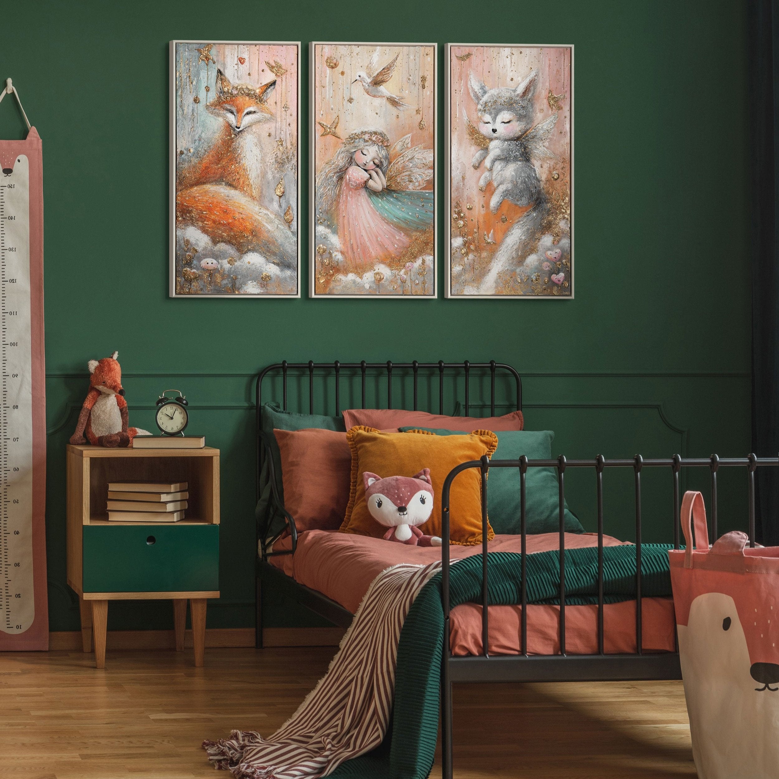 Verzaubern Sie das Kinderzimmer mit dieser einzigartigen Wanddekoration für Kinderzimmer. Dieses handgemalte Triptychon zeigt eine traumhafte Waldszene mit einem niedlichen Fuchs, einer kleinen Elfe und einem geflügelten Wolf, die sich in einem schimmernden Märchenwald befinden. Perfekt als Kinderzimmerdeko und geeignet für eine gemütliche Atmosphäre im Babyzimmer.