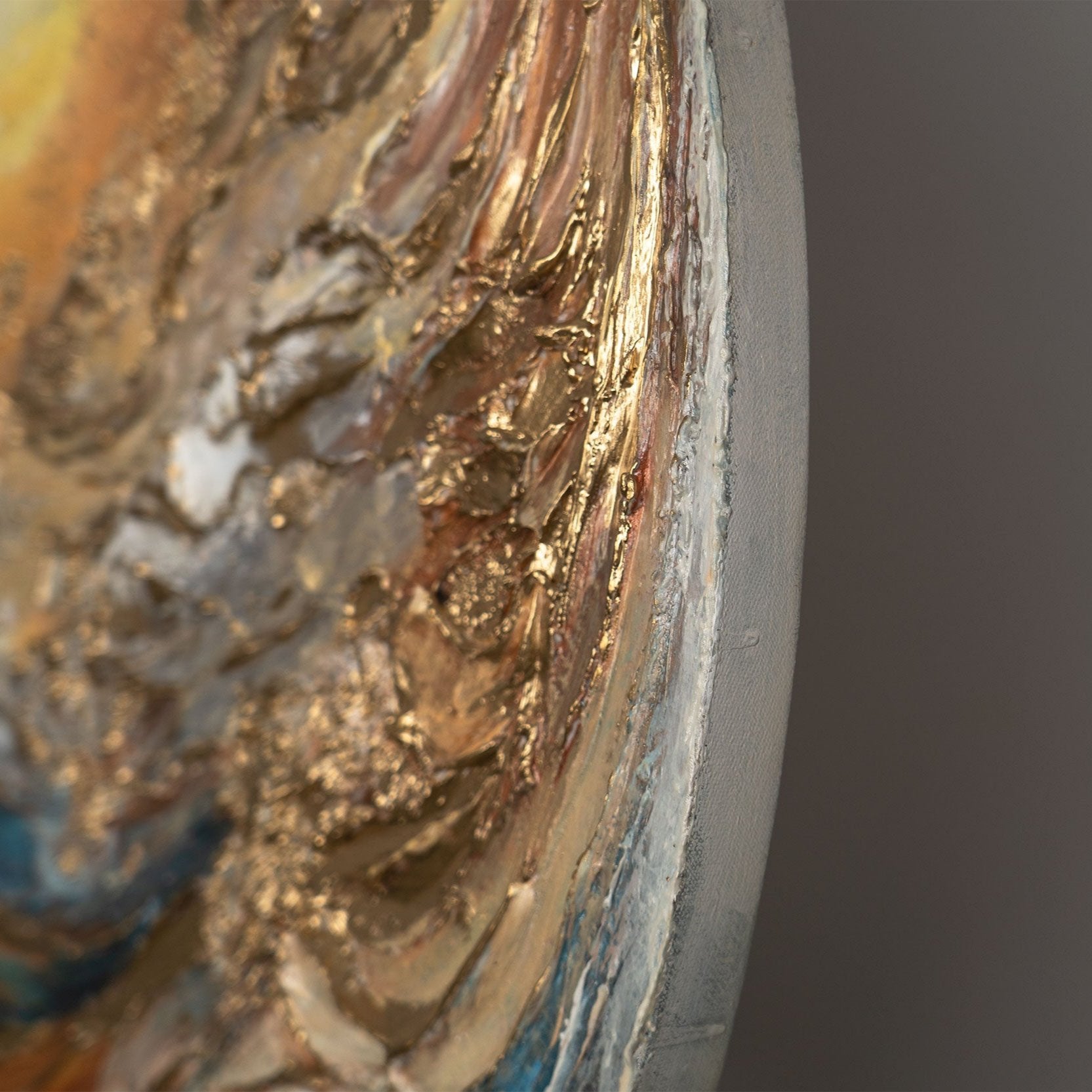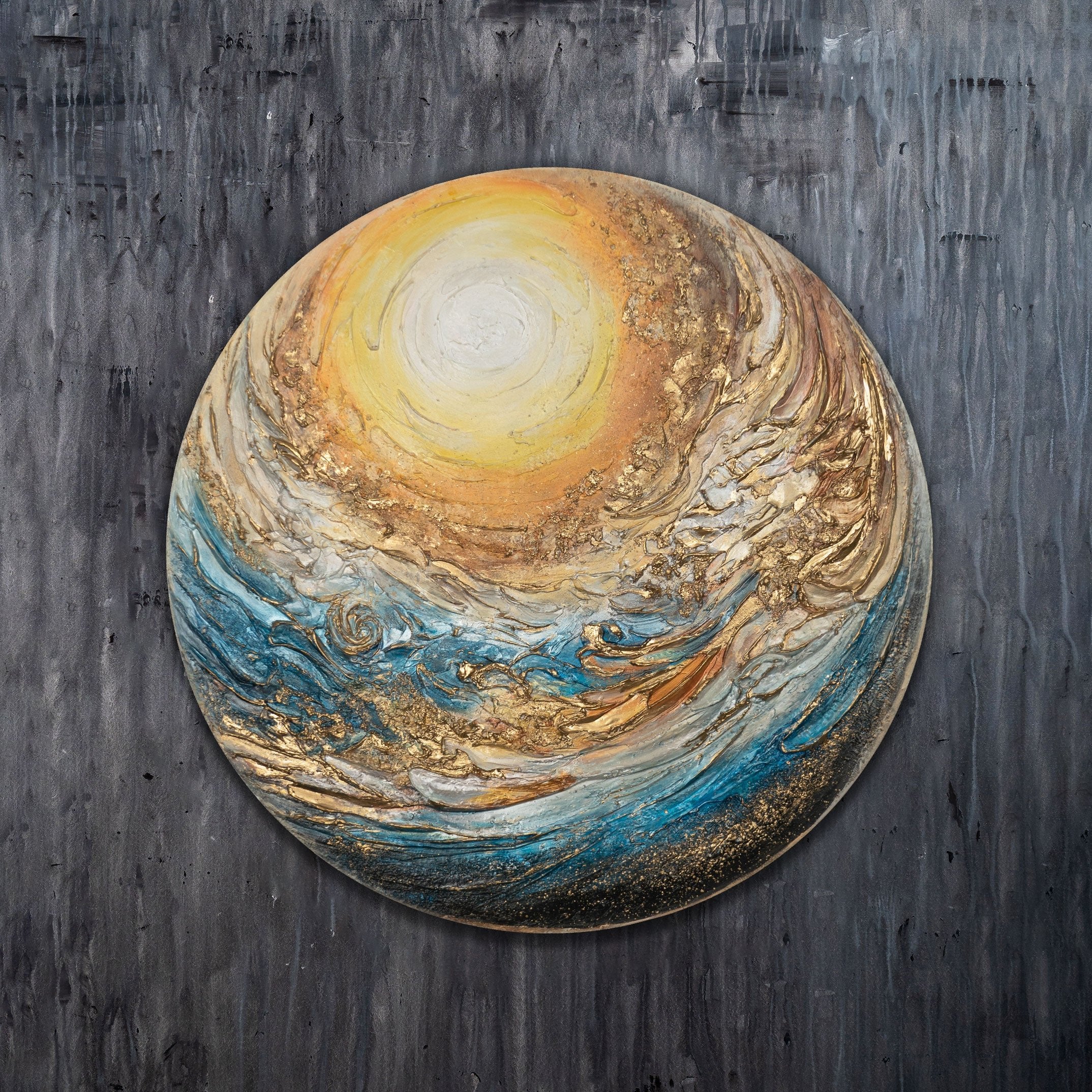 Verschönern Sie Ihr Wohnzimmer oder Büro mit dem exquisiten Gemälde „Goldsphere“, einem runden Acrylkunstwerk, das dank seiner speziellen Leuchtfarbe im Dunkeln leuchtet. Dieses einzigartige Stück zeichnet sich durch eine harmonische Mischung aus weißen, braunen und goldenen Texturen aus, die an ein planetarisches Design erinnern und jedem Raum Wärme und Eleganz verleihen. Handbemalt und präzise gerahmt ist es die perfekte Wahl für alle, die eine moderne Wanddekoration suchen.