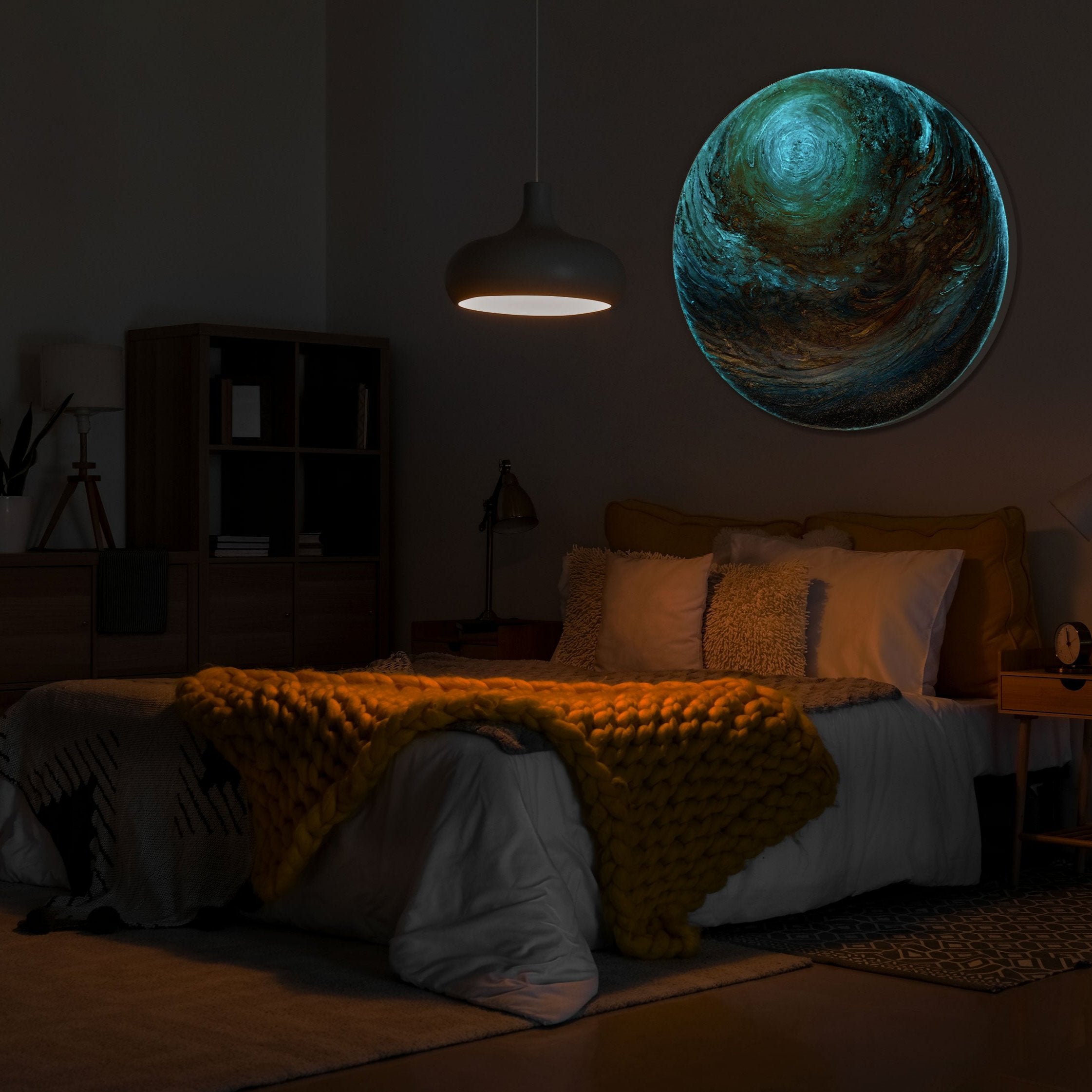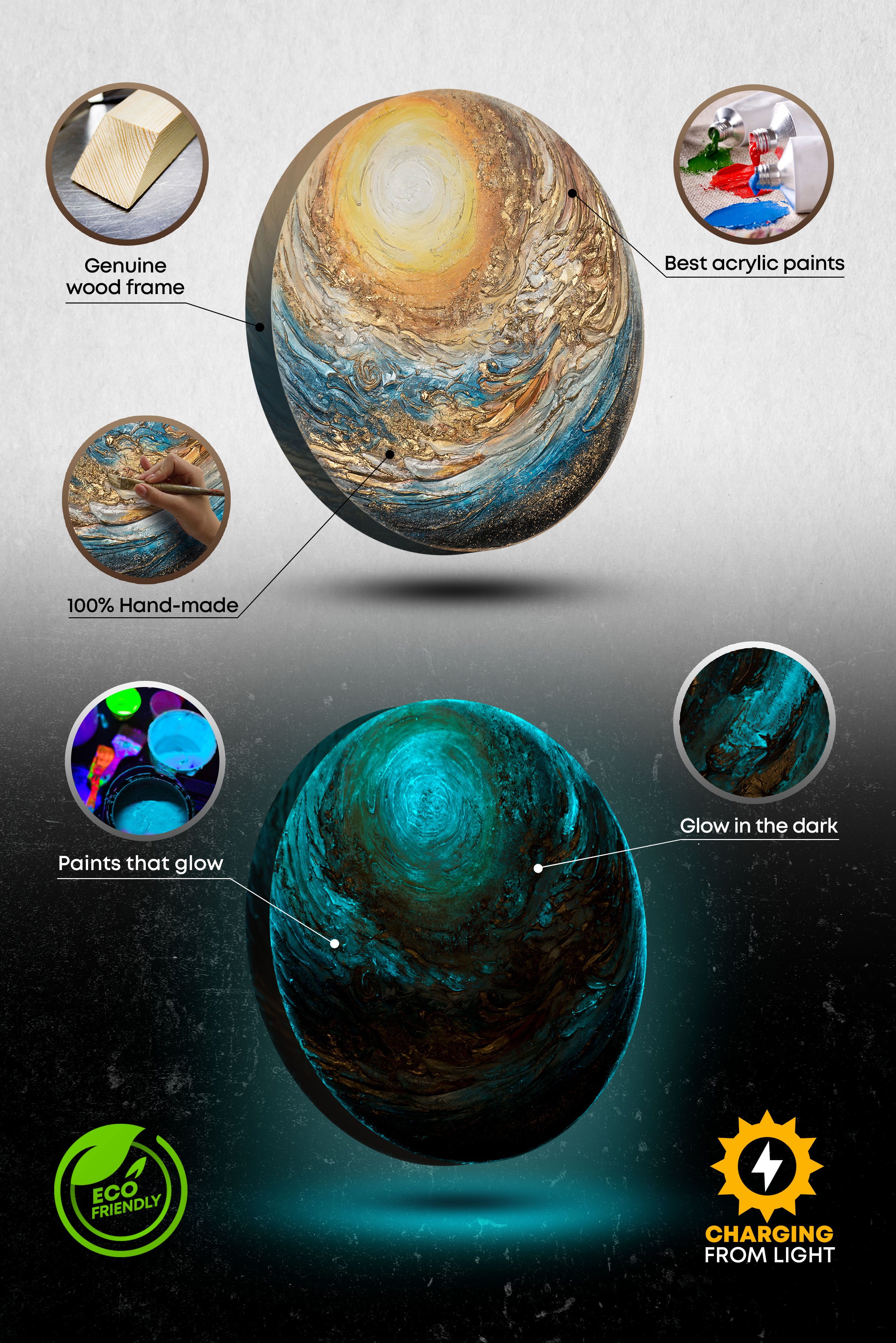 Genießen Sie kostenlosen Versand und verschönern Sie Ihr Zuhause oder Büro mit diesem faszinierenden Kunstwerk, das im Dunkeln leuchtet. „Goldsphere“ ist perfekt für die Schaffung einer inspirierenden Atmosphäre in Ihrem Schlafzimmer oder Wohnbereich geeignet und verbindet modernes Design mit zeitlosem Charme.