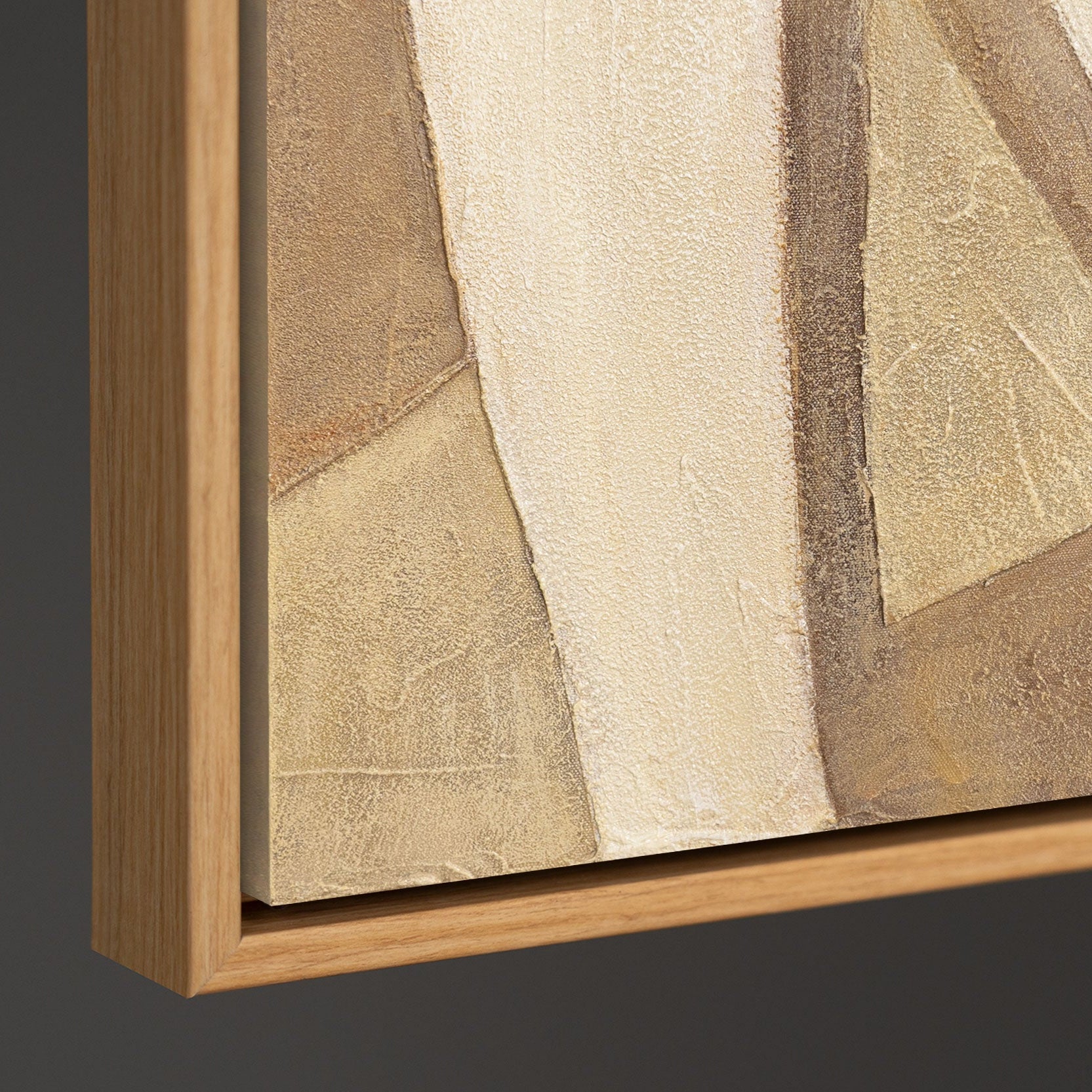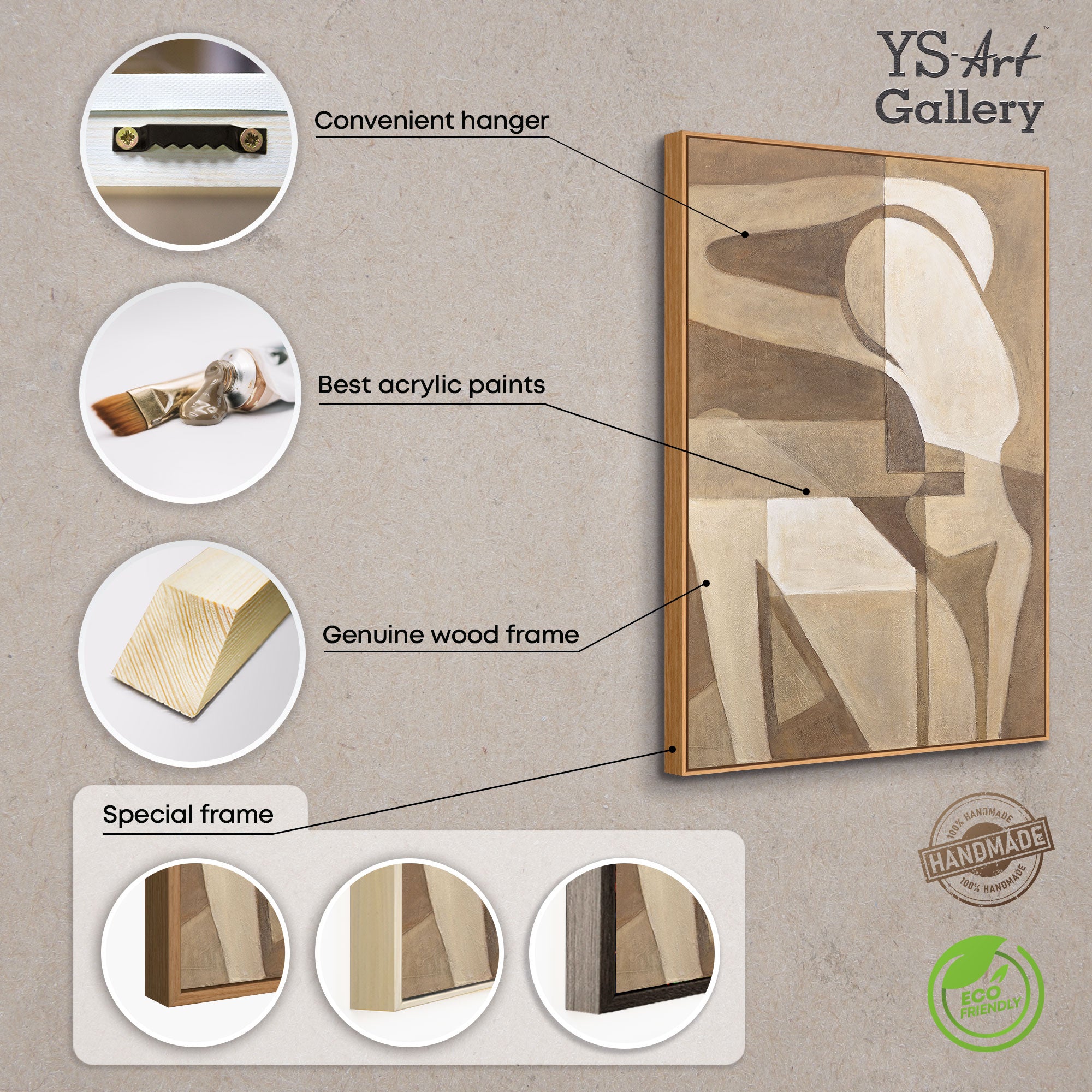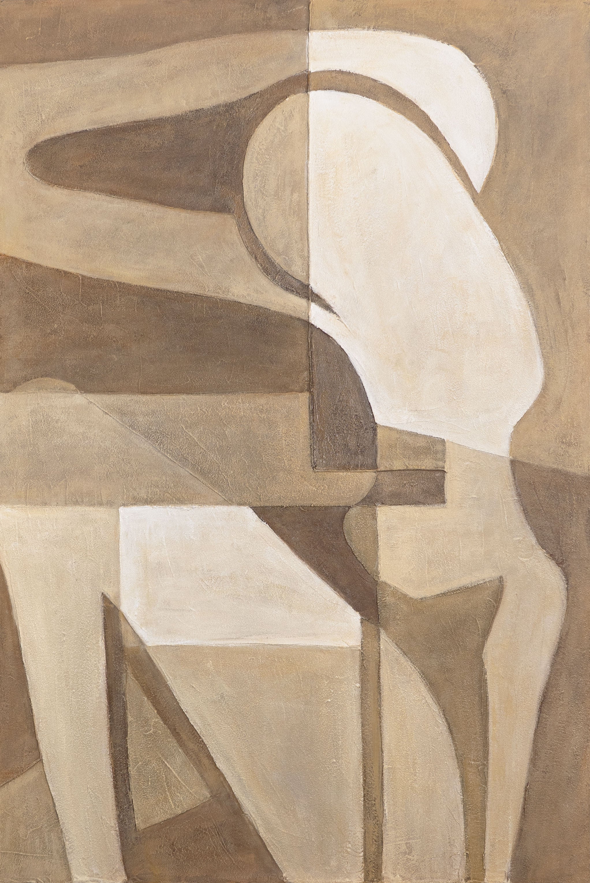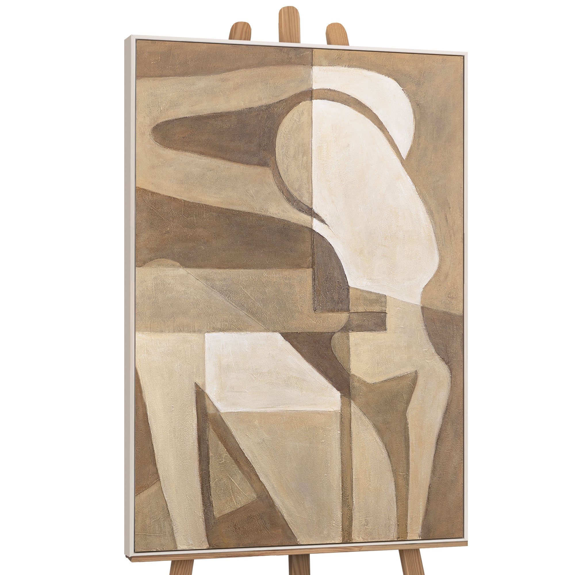 "Ternura Abstracta" fusiona formas geométricas y un movimiento delicado en una composición poética. La figura, casi como esbozada en el pensamiento, se presenta reducida a una escala, inmersa en cálidos y armoniosos tonos marrones y superficies de textura suave.