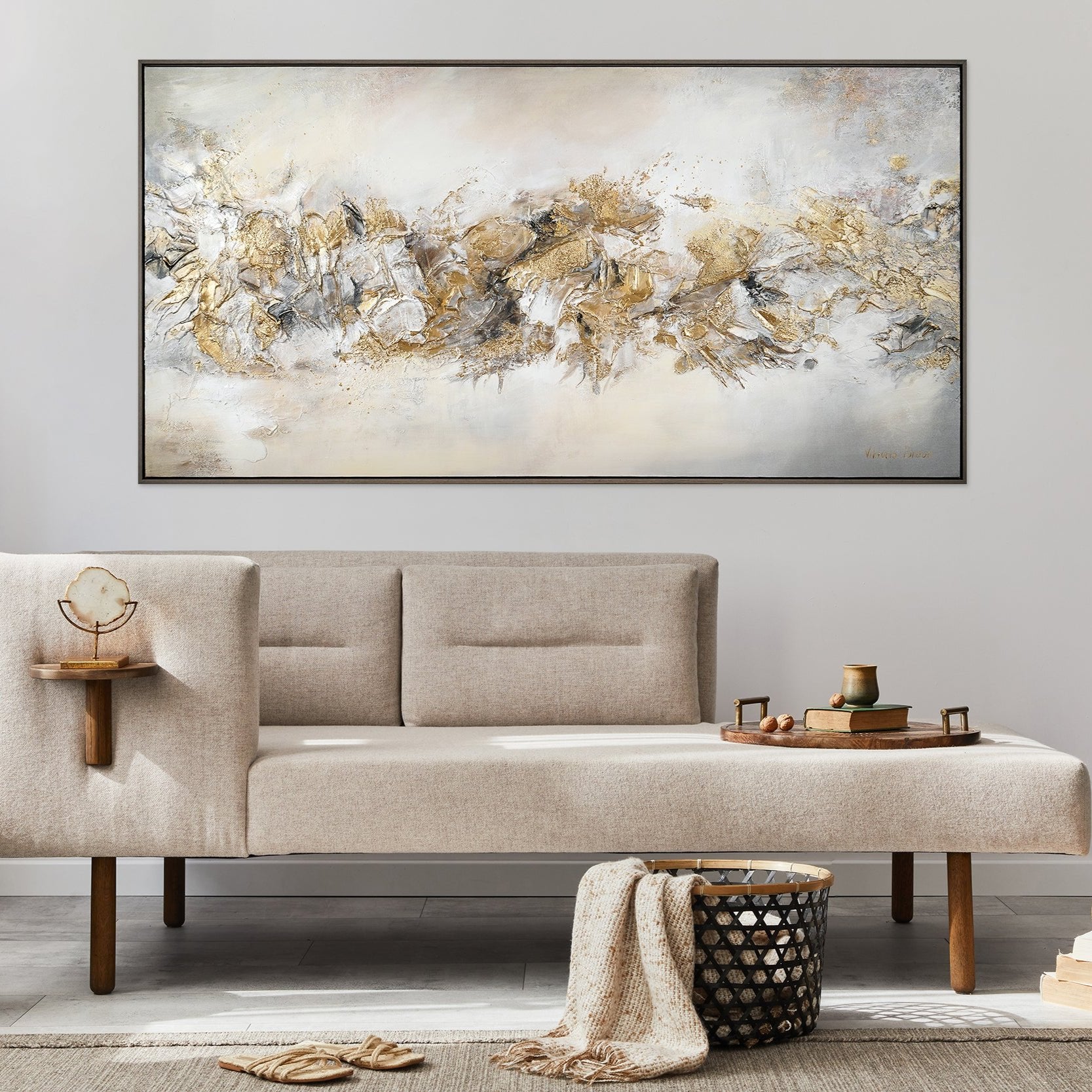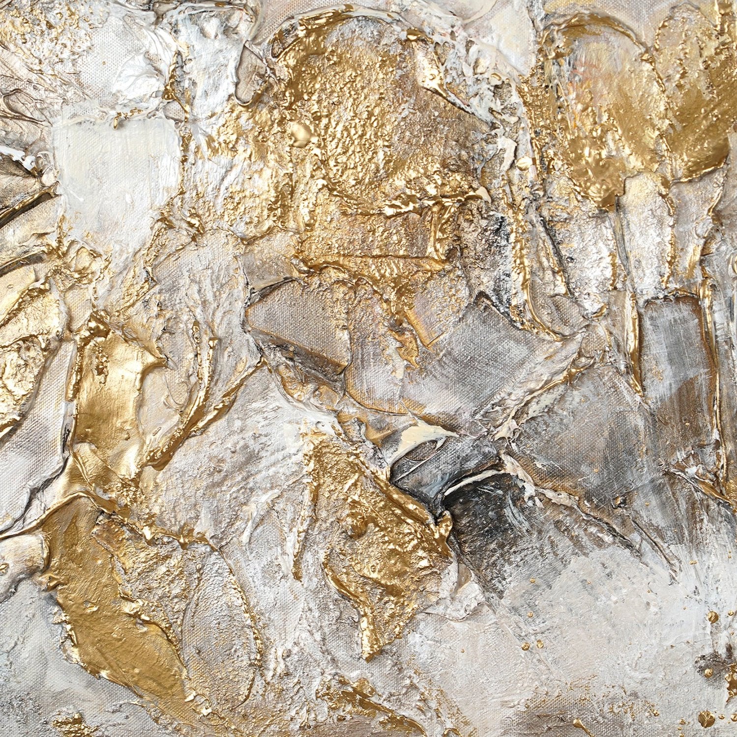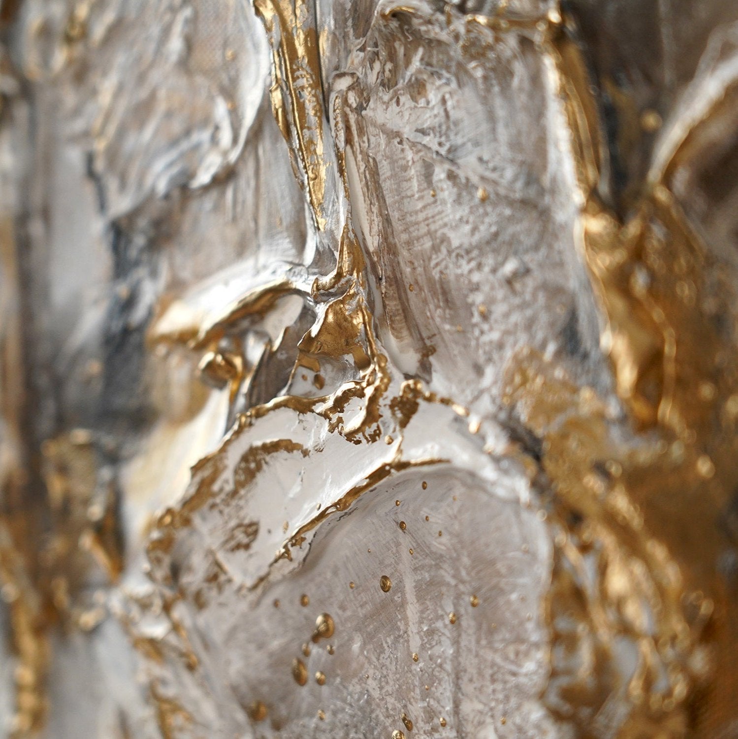 Experimenta la perfecta combinación entre arte moderno y elegancia contemporánea con esta pintura abstracta hecha a mano sobre lienzo. La obra destaca por sus texturas dinámicas y sus brillantes acentos dorados, que aportan un toque de lujo y sofisticación a cualquier estancia.