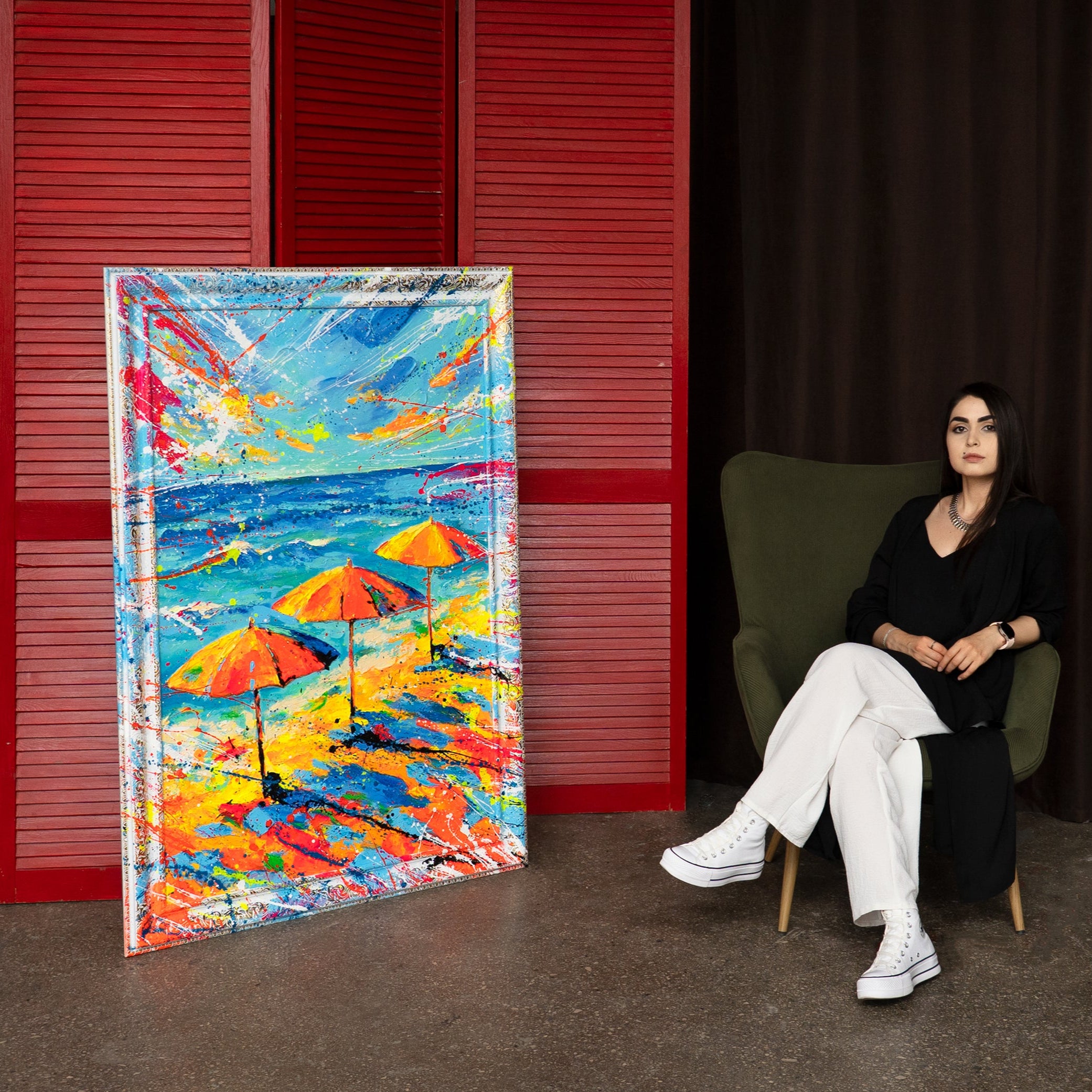 „Auf den Spuren der Sonne“ zeigt eine leuchtende Strandszene mit drei orangefarbenen Sonnenschirmen, die sich im Rhythmus des Meeres in die Landschaft einfügen. Der Himmel und die Wellen sind voller Bewegung, während kräftige Farbexplosionen in Rot, Blau, Gelb und Grün die gesamte Leinwand durchziehen. Das Werk strahlt Sommer, Freiheit und mediterrane Leichtigkeit aus.