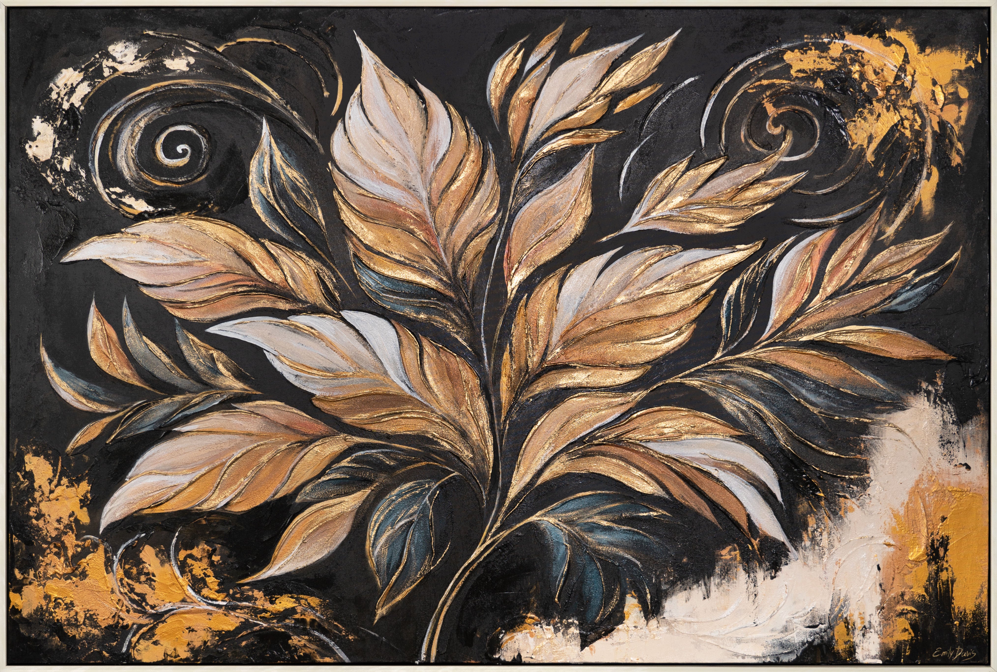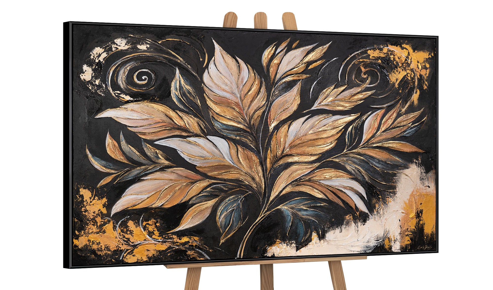 • Acrylbild Blätter – Leinwand in Schwarz-Gold mit Beigerahmen