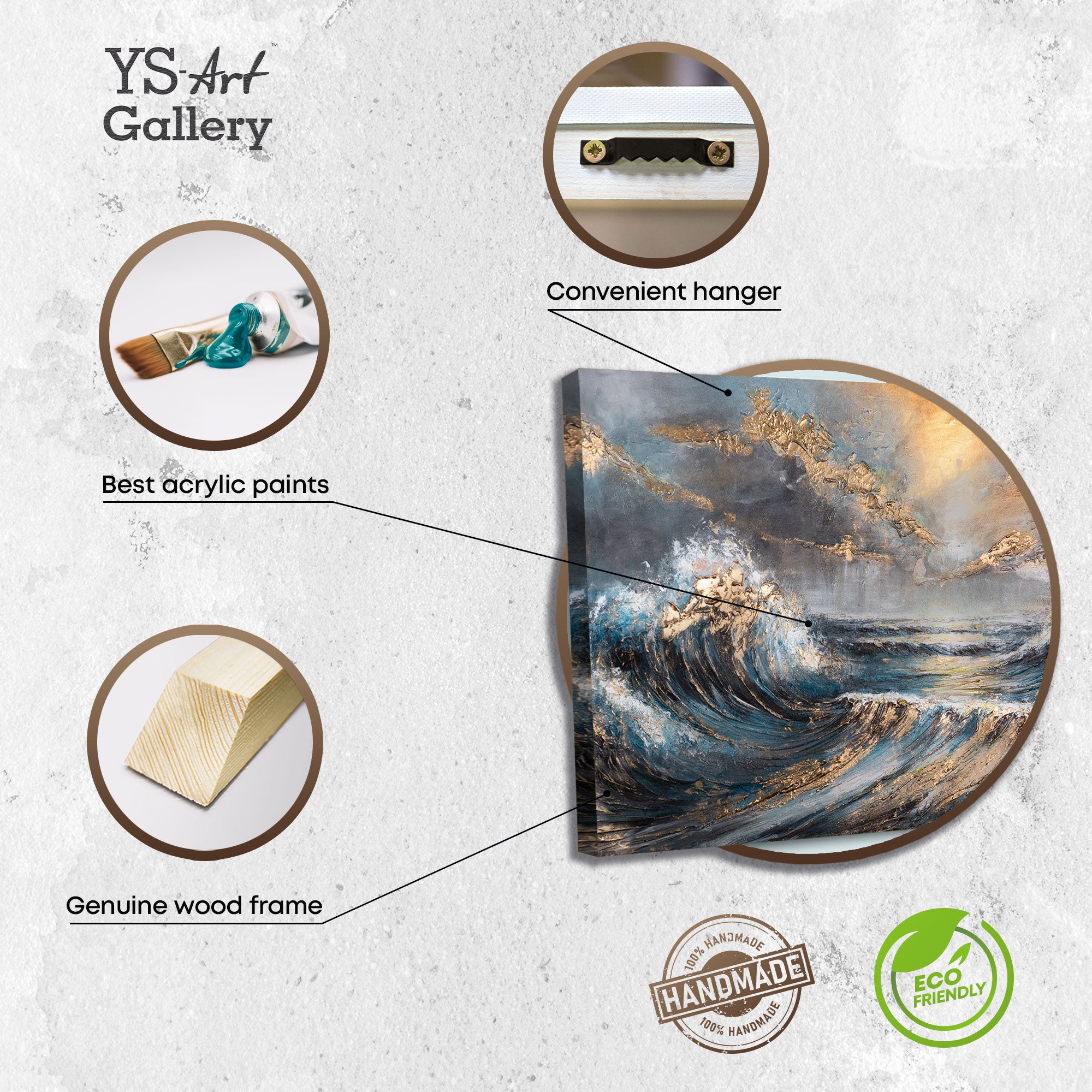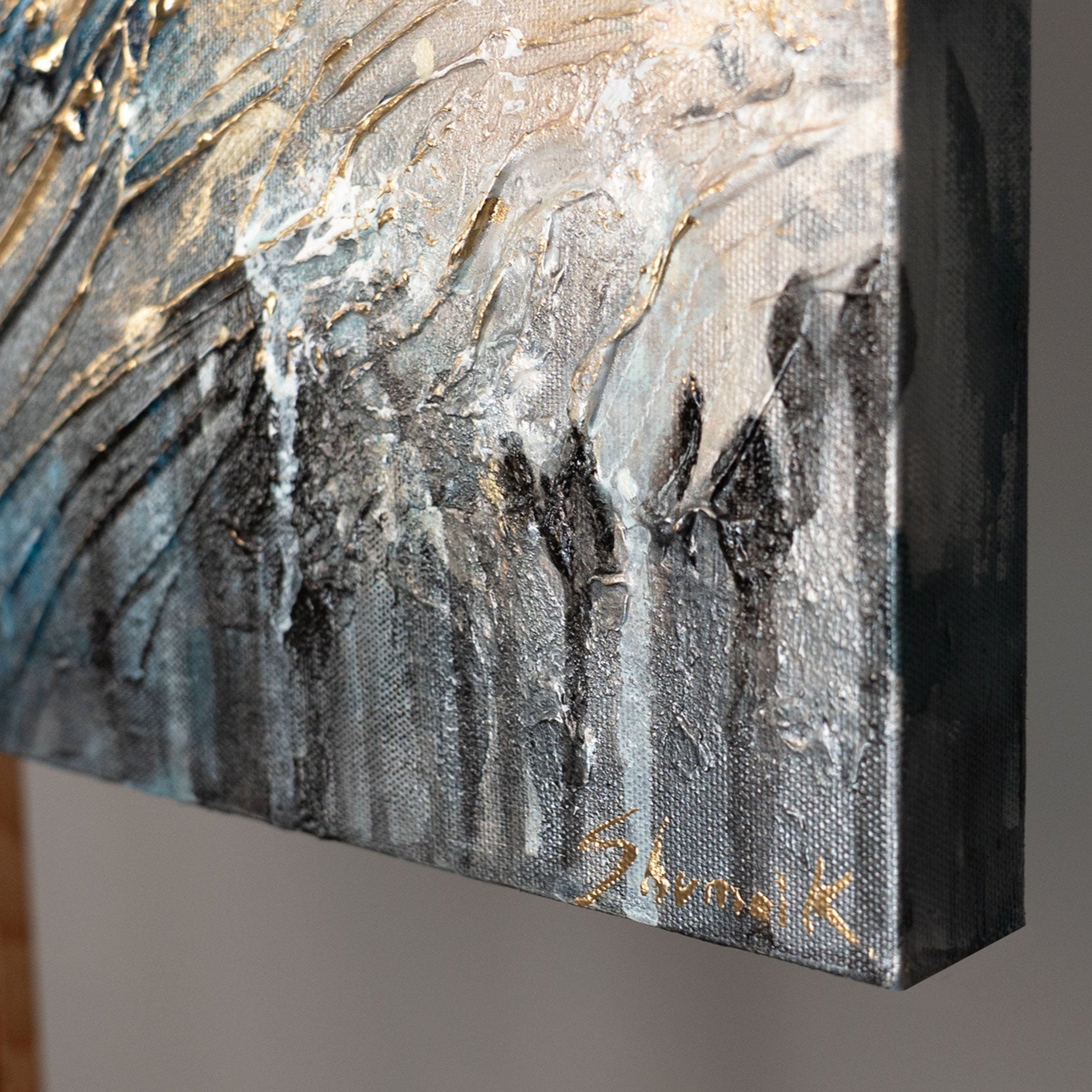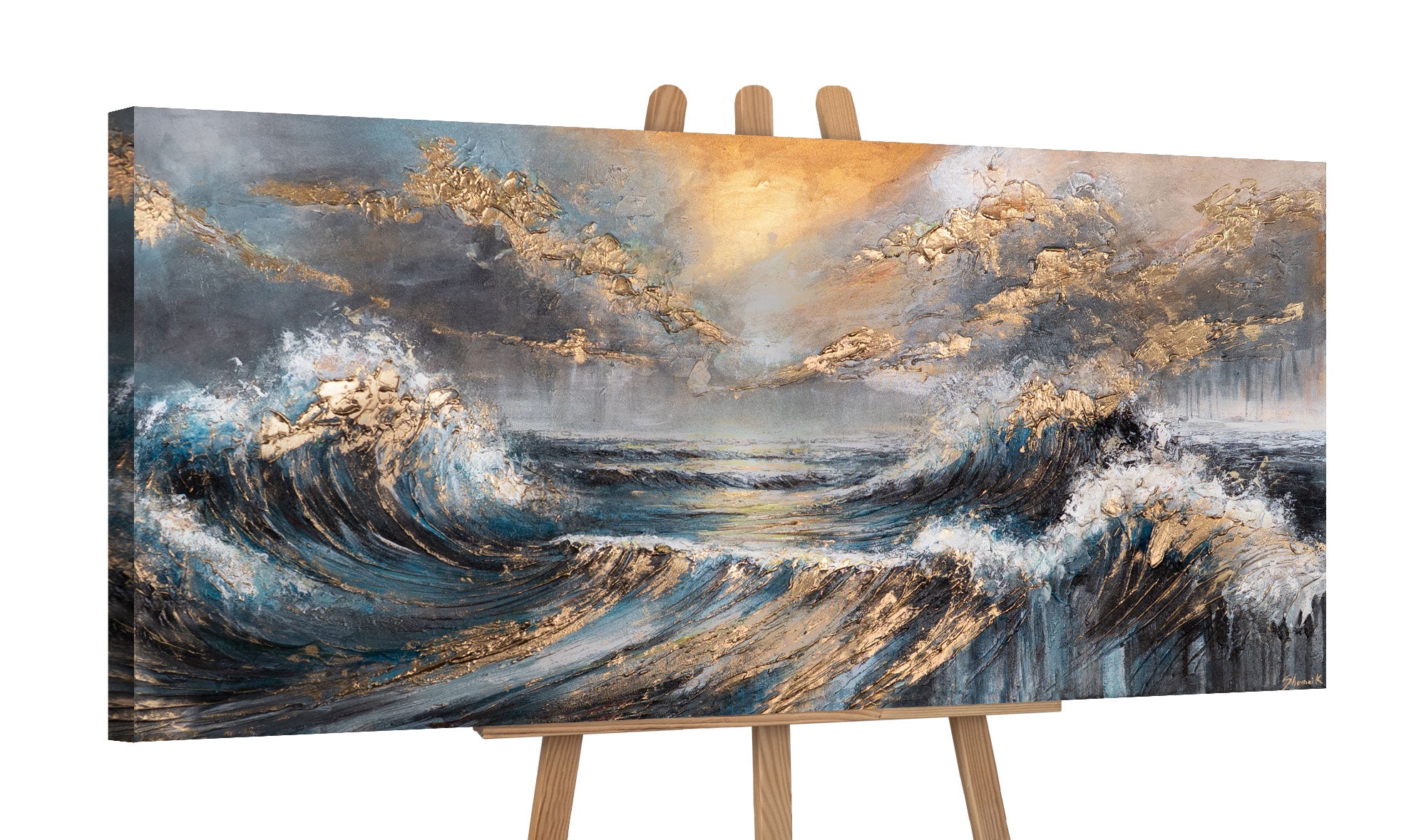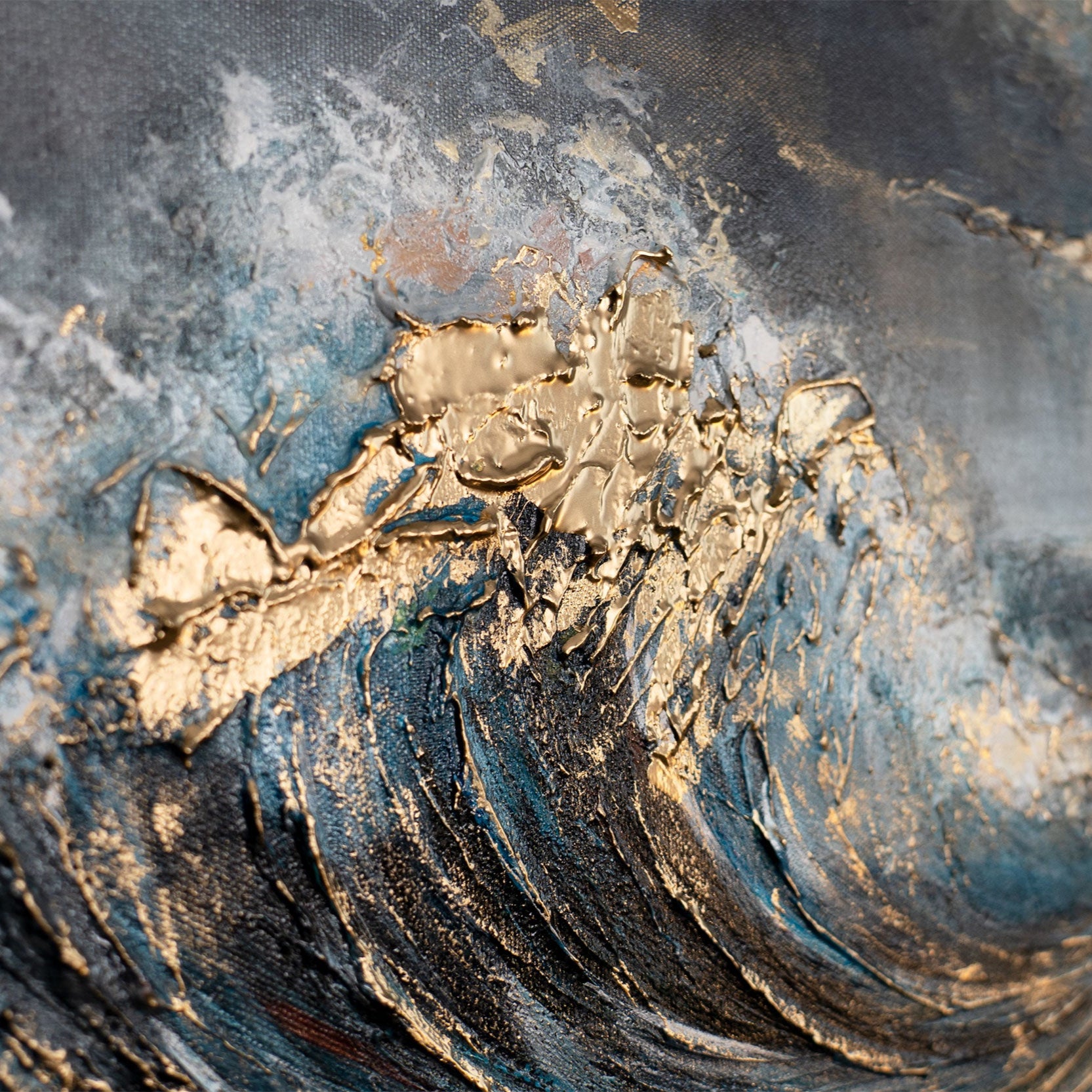 "Shining Waves" zeigt die faszinierende Dynamik des Meeres in einer luxuriösen Farbkomposition aus Blau, Gold und dunklem Grau. Die strukturierte Oberfläche und die expressiven Pinselstriche lassen das Wasser lebendig wirken – fast spürt man die Energie der Wellen.
