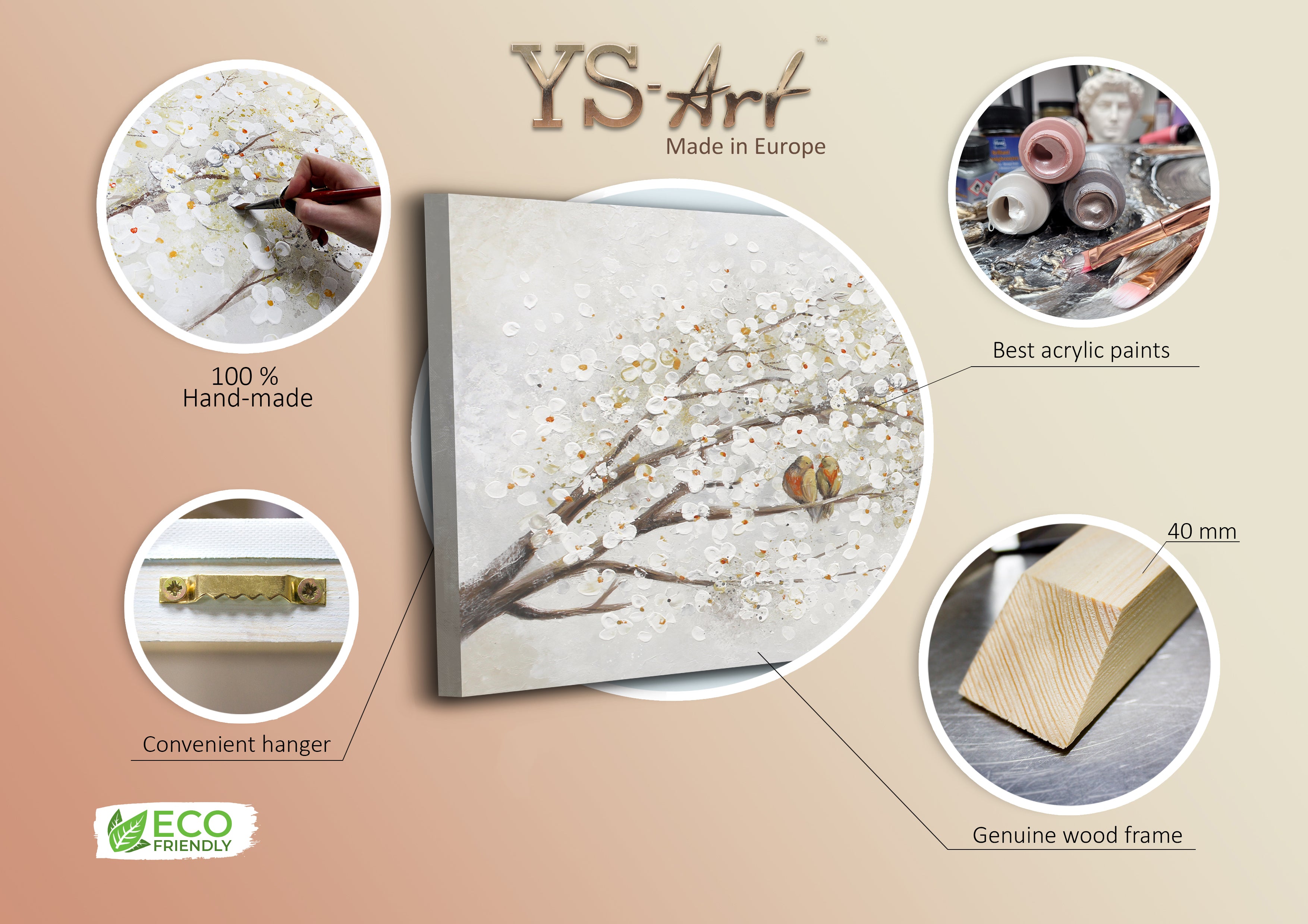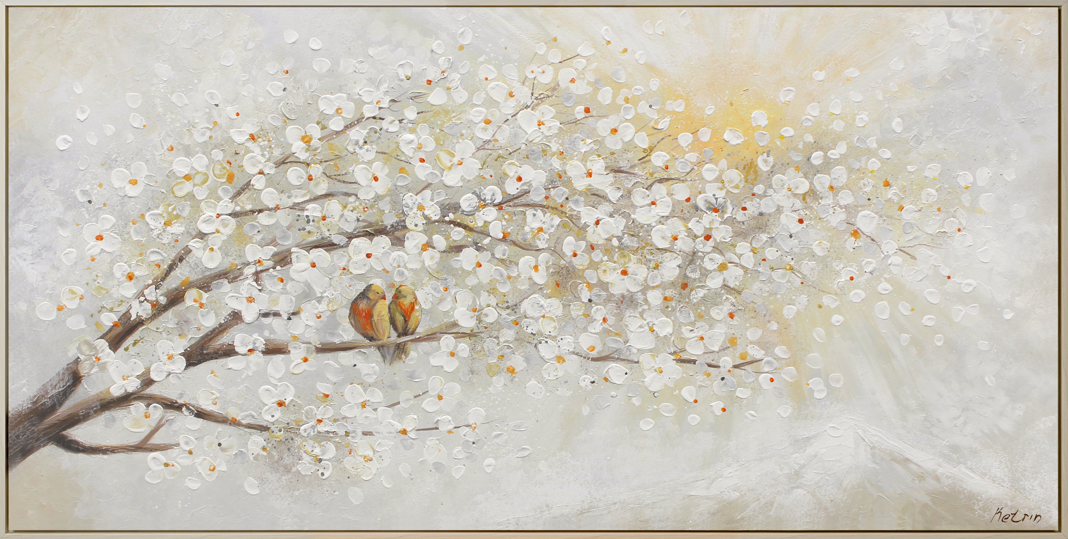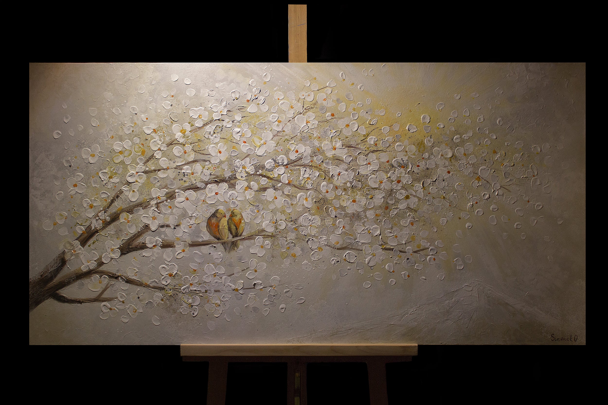 Arte moderno – Cuadro pintado a mano con flores y aves sobre lienzo