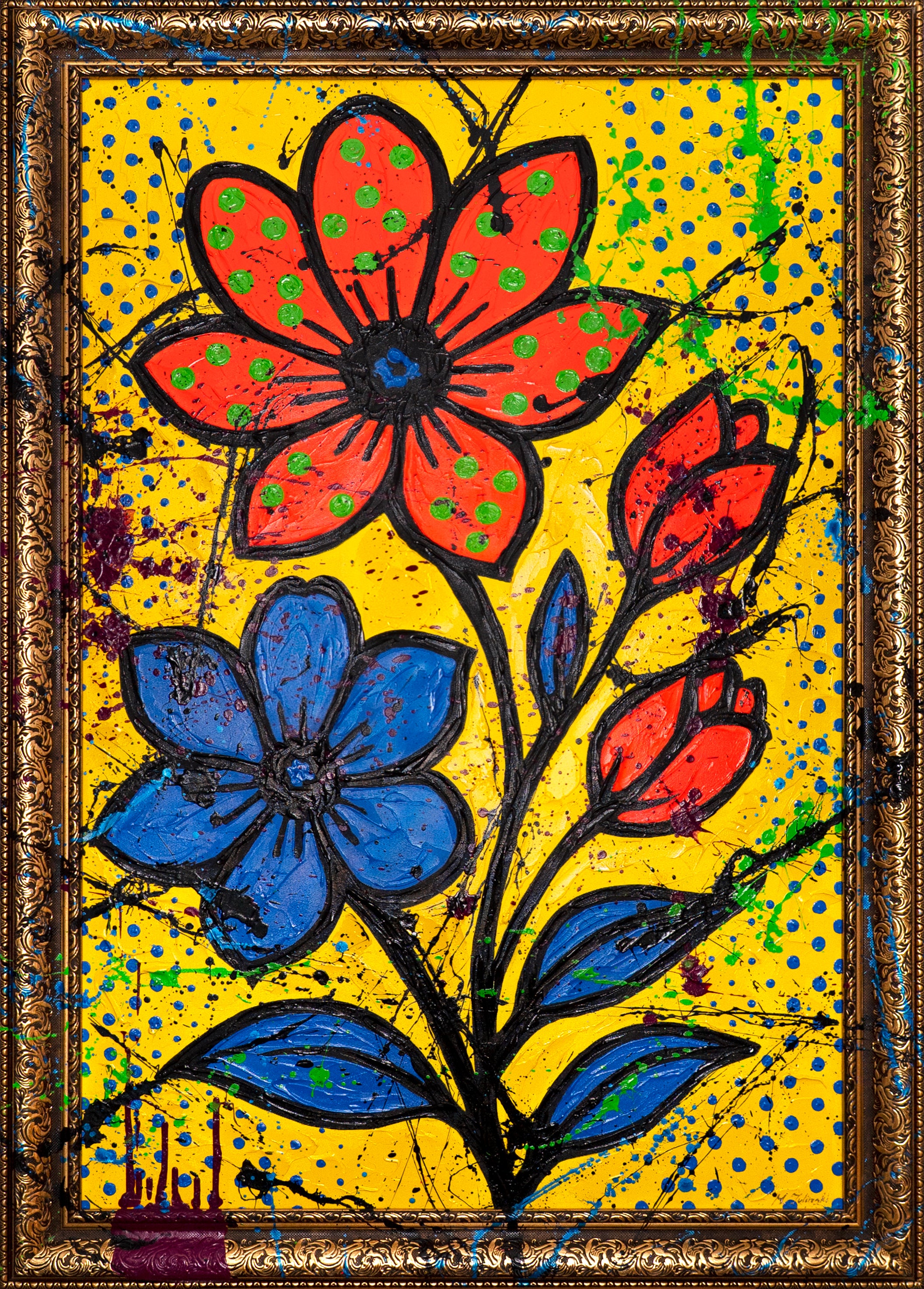 „Blütenrausch“ ist ein farbintensives Pop-Art Blumenbild, das Energie und Lebensfreude ausstrahlt. Der leuchtend gelbe Hintergrund, die roten und blauen Blüten mit grünen Akzenten und die dynamischen Farbspritzer machen dieses Werk zu einem expressiven Statement moderner Kunst. Jedes Detail ist handgemalt und einzigartig.