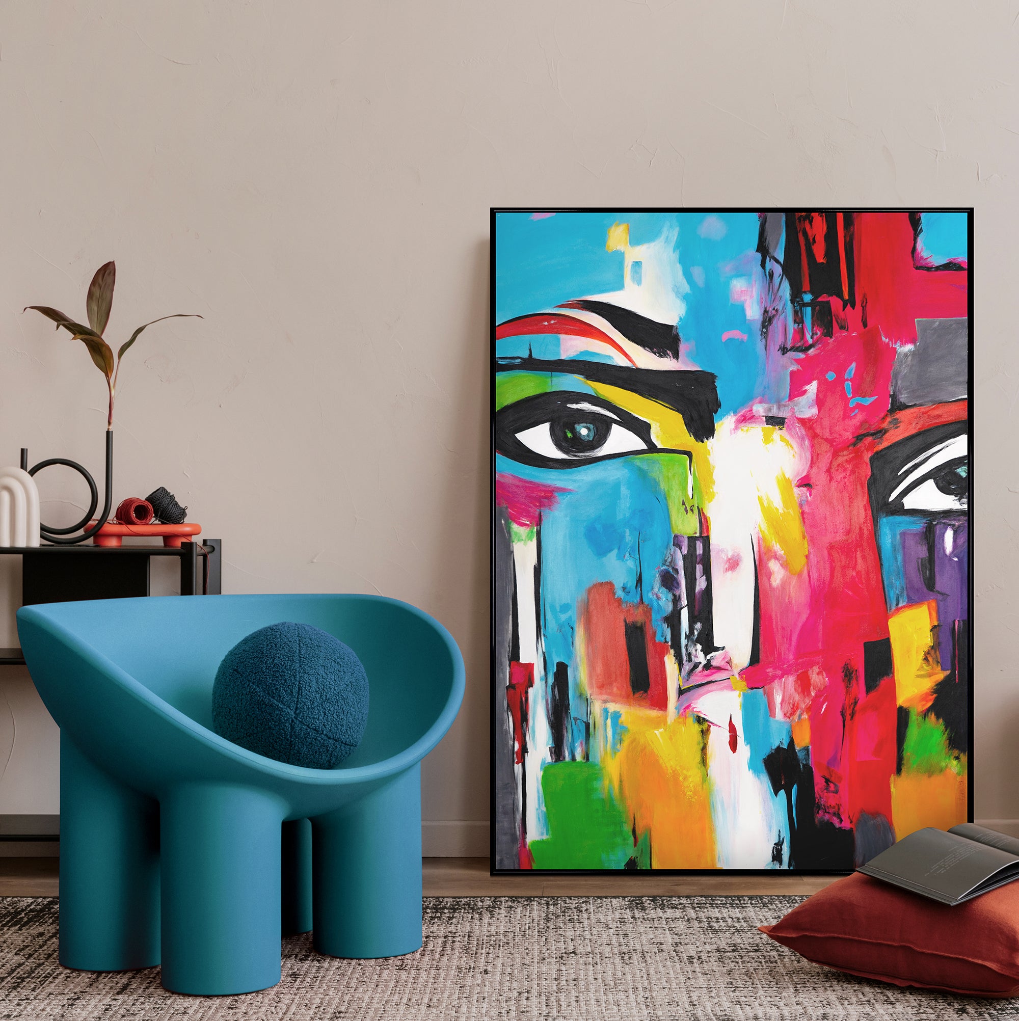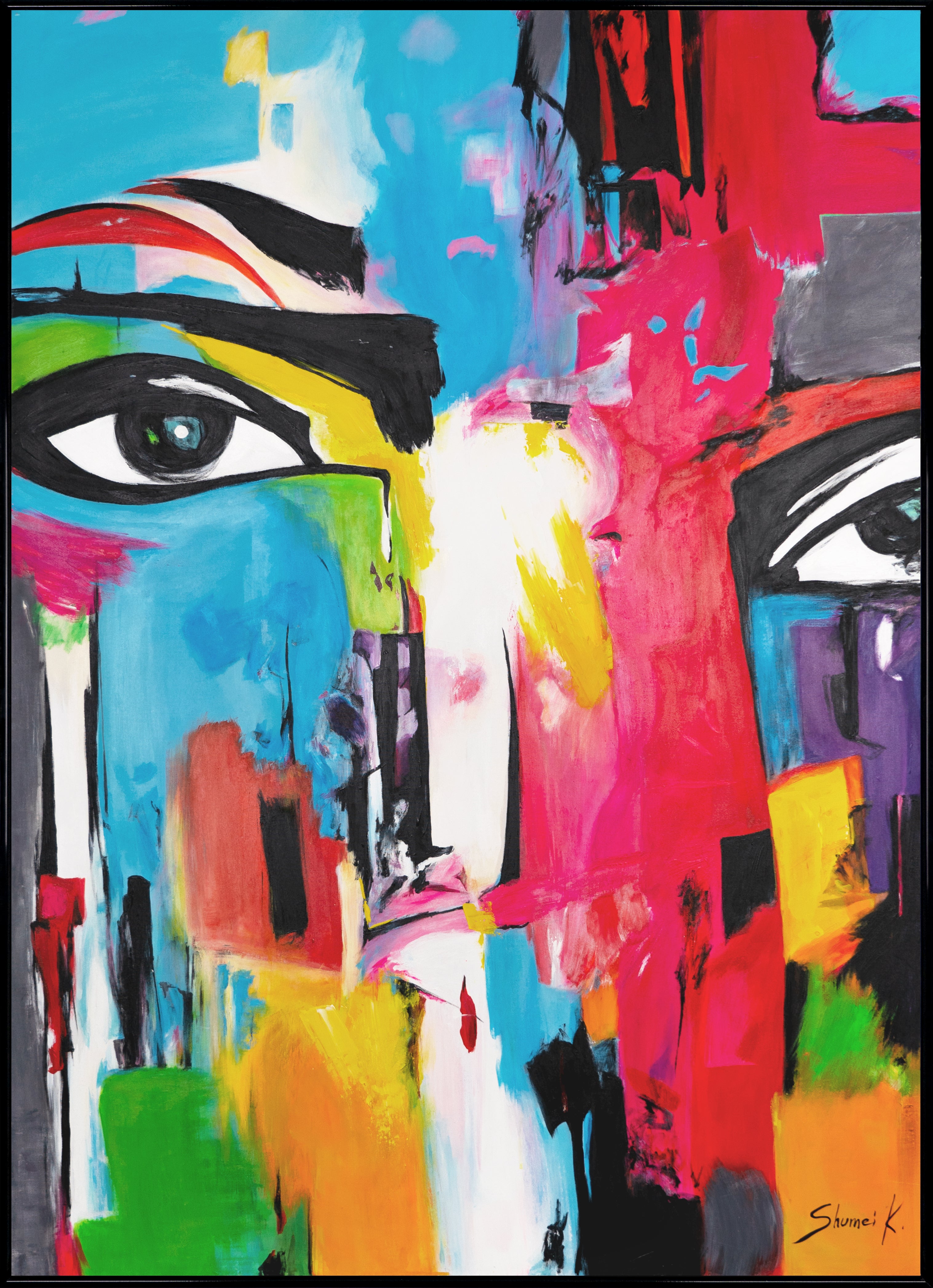 Ein ausdrucksstarkes Leinwandbild, das farbgewaltige Emotionen mit moderner Abstraktion verbindet: „Verglaste Betrachtung“ zeigt ein fragmentiertes Gesicht in leuchtenden Rot-, Blau-, Pink- und Gelbtönen – durchzogen von schwarzen Kontrasten. Die Struktur der Acrylfarben sorgt für eine fühlbare Tiefe und macht die Komposition zu einem intensiven Blickfang mit urbanem Flair.