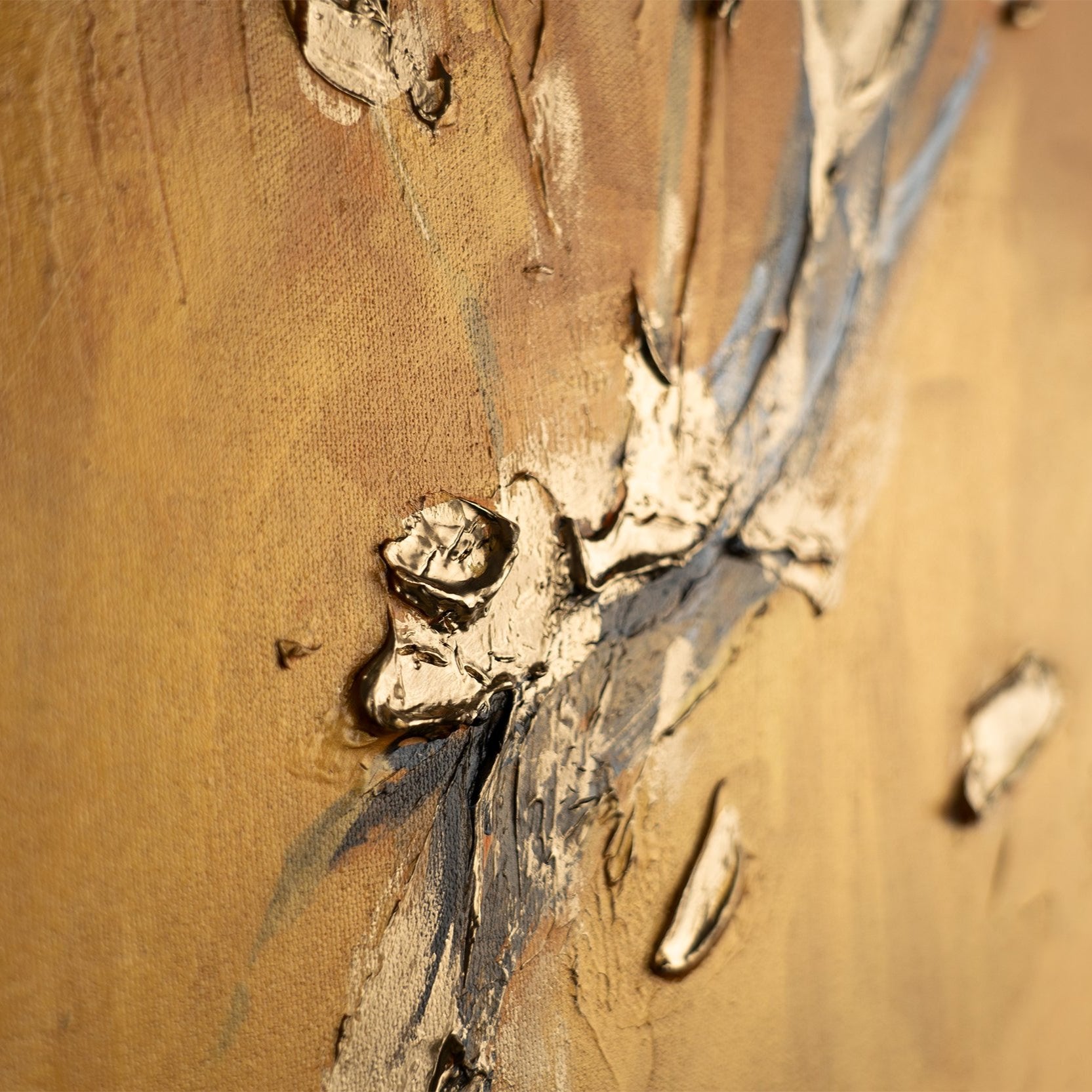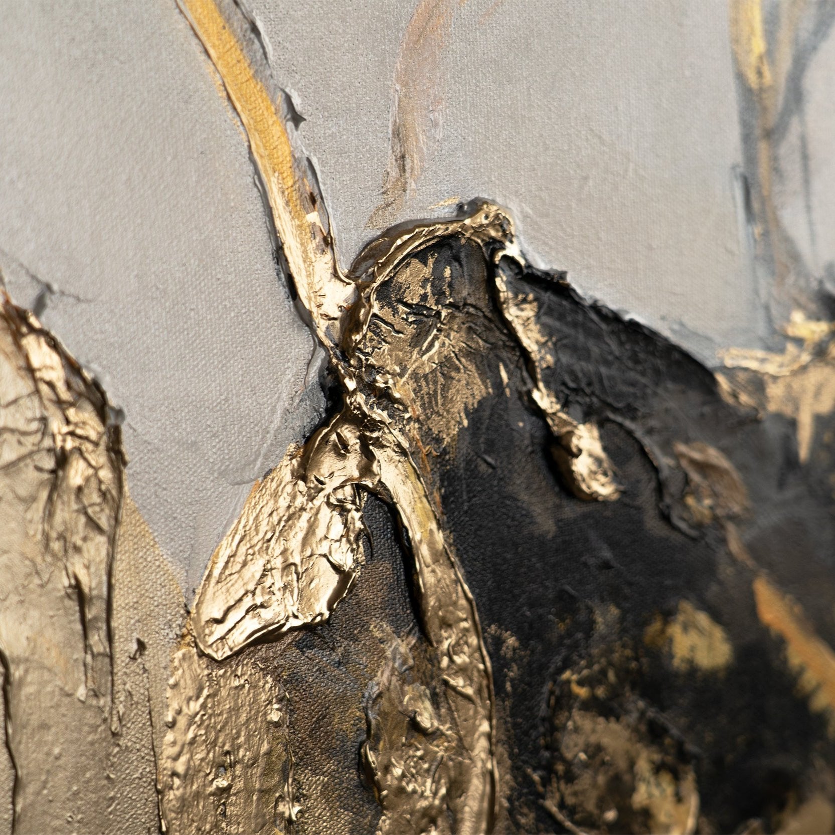Das handgemalte Leinwandbild „Goldener Rhythmus“ fasziniert mit seiner harmonischen Komposition aus Gold-, Schwarz- und Grautönen. Die abstrakte Struktur wird durch edle Goldakzente lebendig, die dem Bild eine luxuriöse Tiefe und einen modernen Charakter verleihen. Die fein ausgearbeitete Textur und die starke Farbwirkung erzeugen ein kunstvolles Spiel von Licht und Schatten, das jeden Raum stilvoll bereichert.