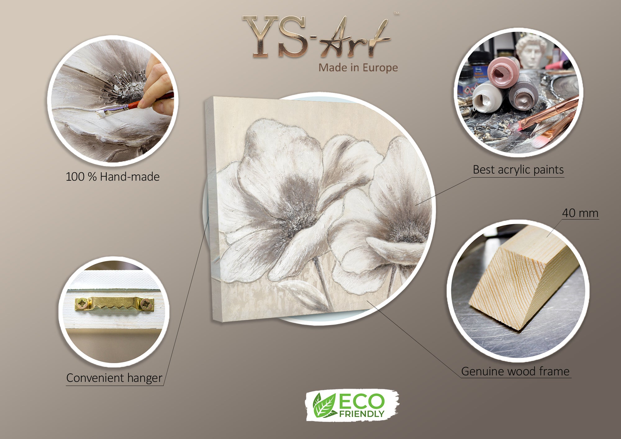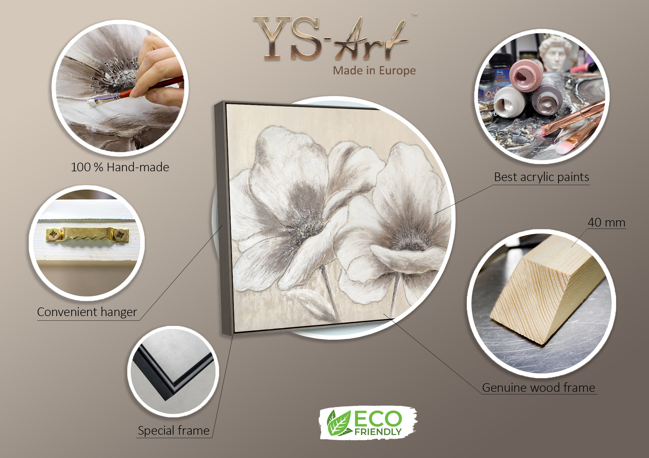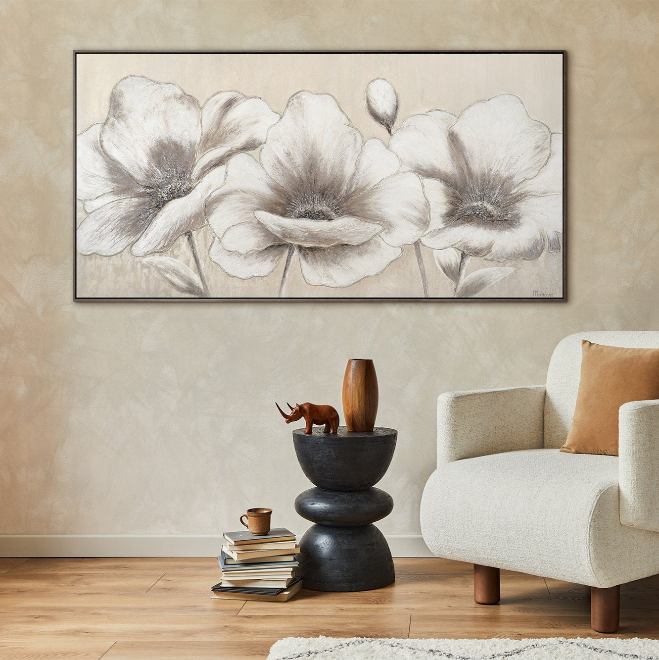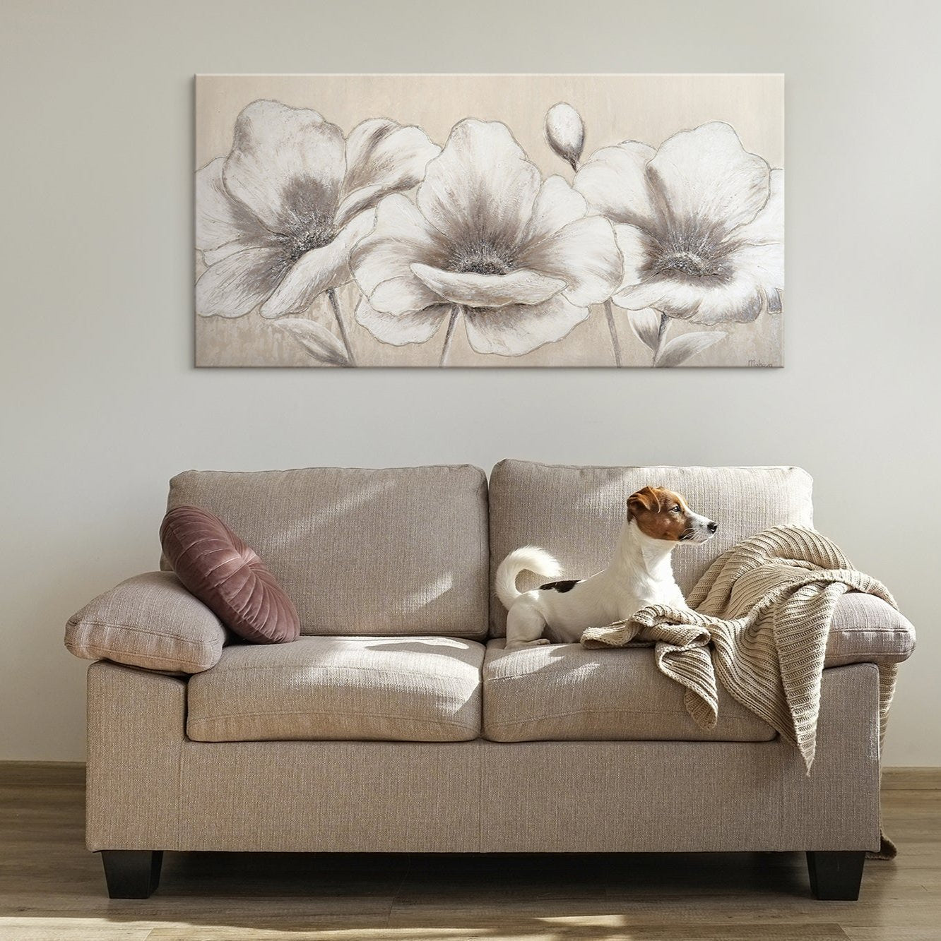 This modern acrylic painting captivates with its elegant floral motifs, which have been brought to the canvas in soft and harmonious colors. The detailed depiction of the flowers conveys a timeless beauty that fits perfectly into any living space. The subtle color scheme ensures that the painting blends seamlessly into any interior and creates a calming atmosphere.