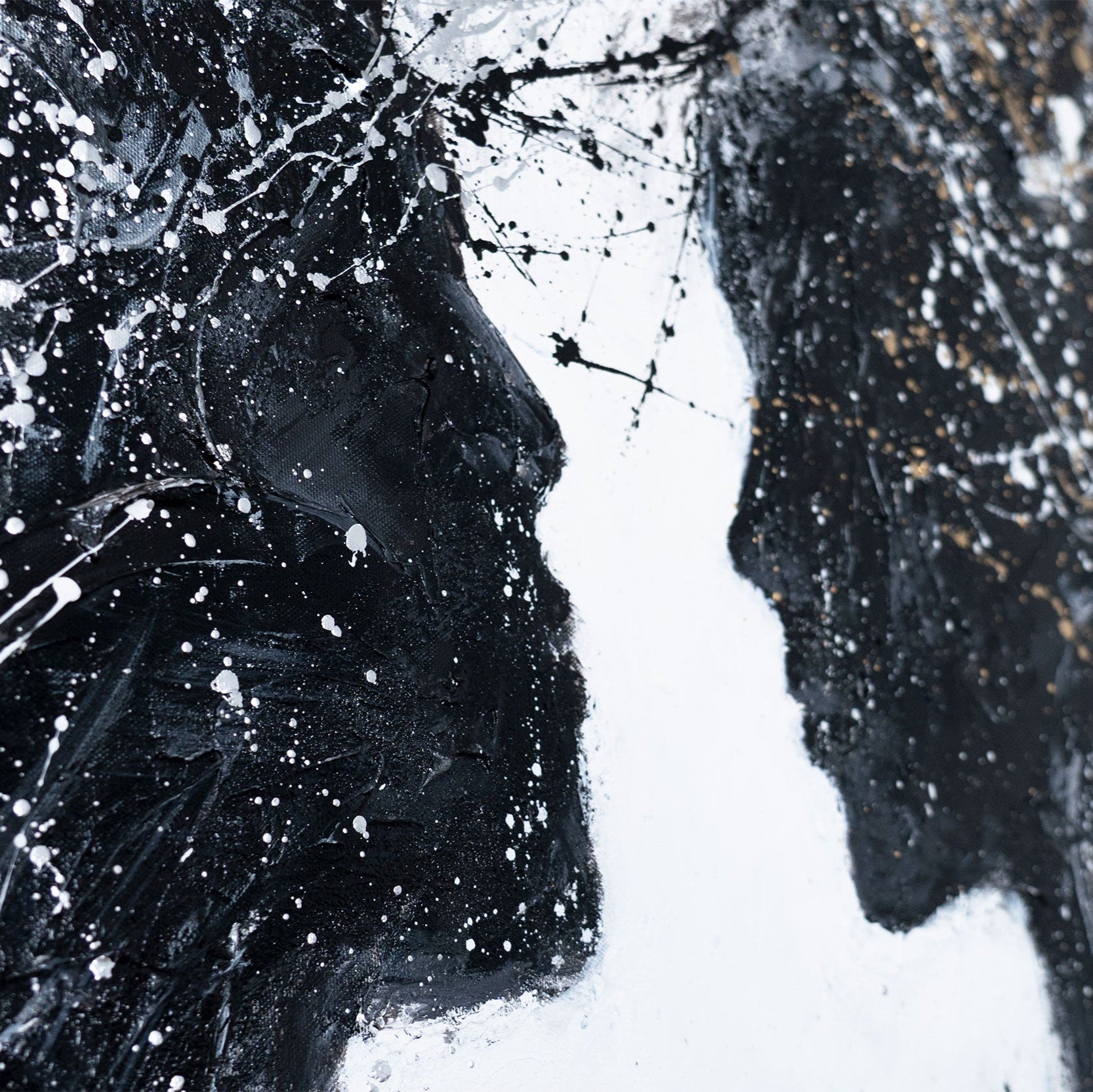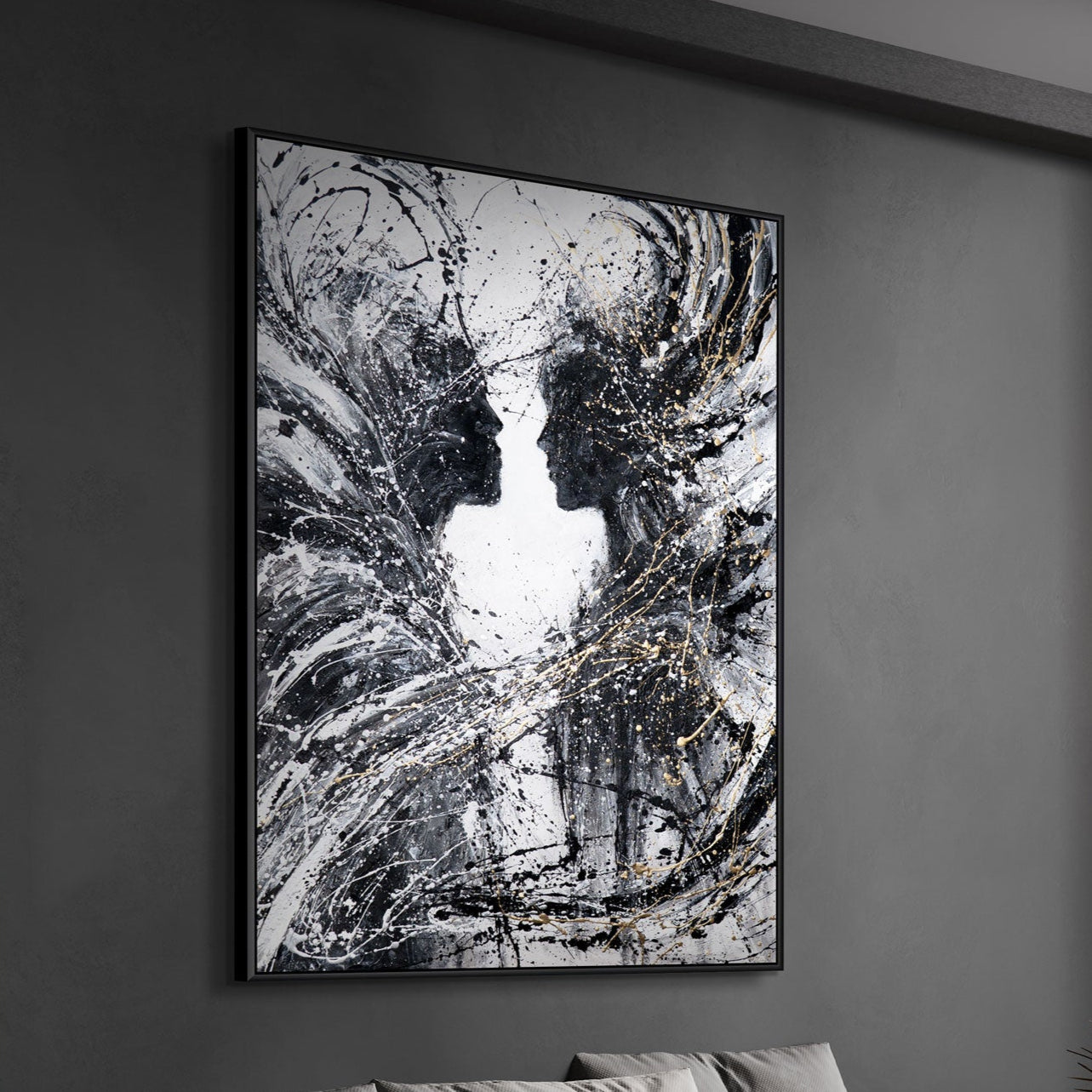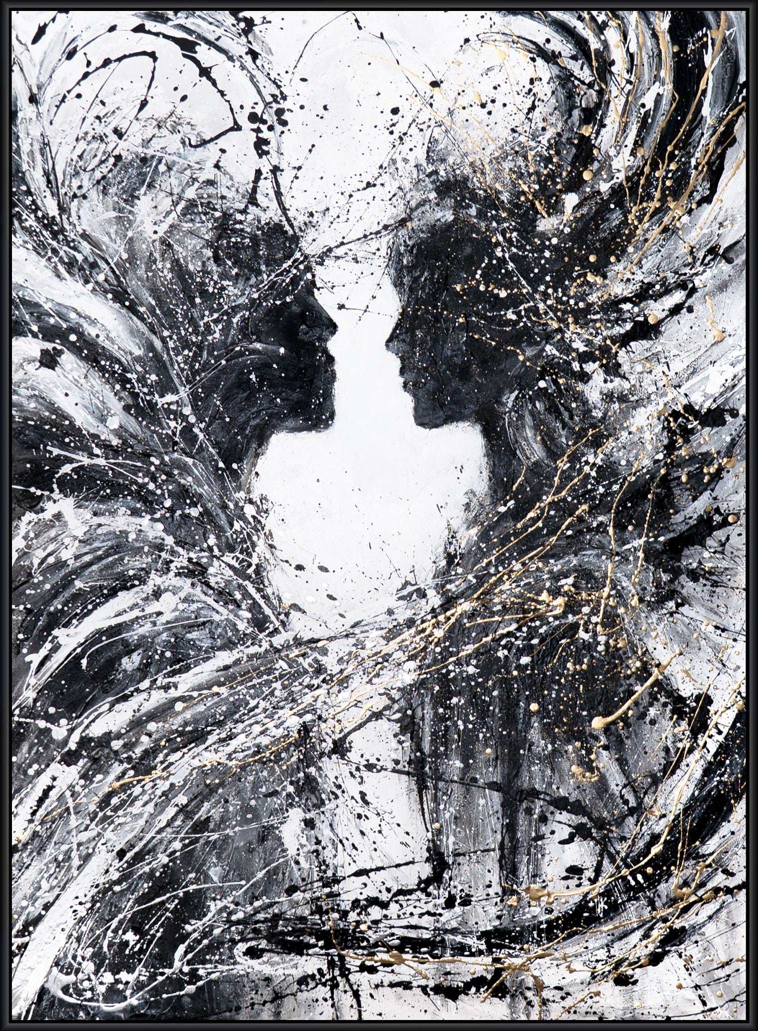 Zwei einander zugewandte Silhouetten scheinen inmitten eines abstrakten Strudels aus Schwarz, Weiß und Gold zu verschmelzen. Die dynamischen Pinselbewegungen und gesprenkelten Linien erschaffen ein Gefühl innerer Verbundenheit, eines emotionalen Gesprächs ohne Worte. Die kontrastreiche Darstellung vermittelt Intensität, während goldene Akzente für Eleganz und Tiefe sorgen.