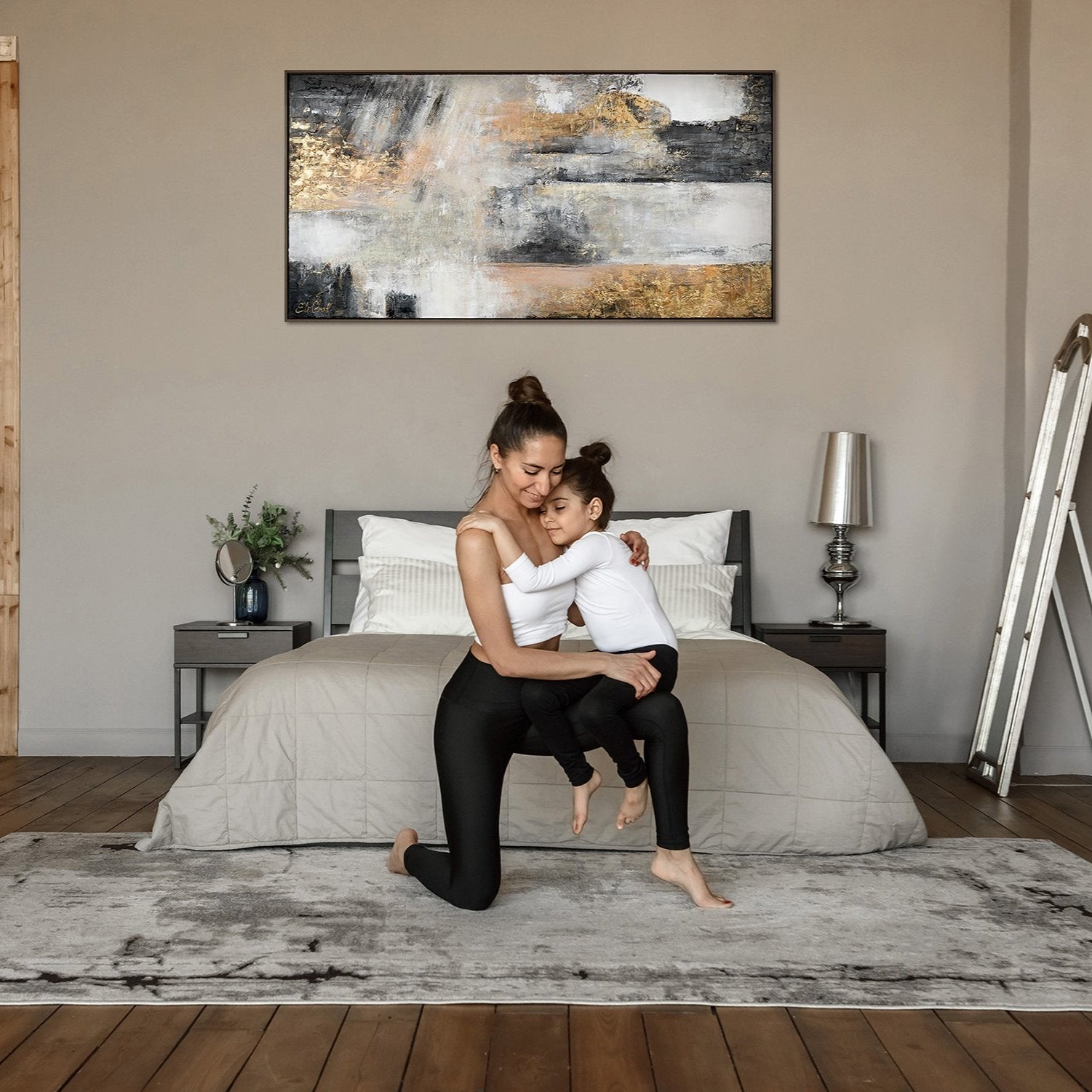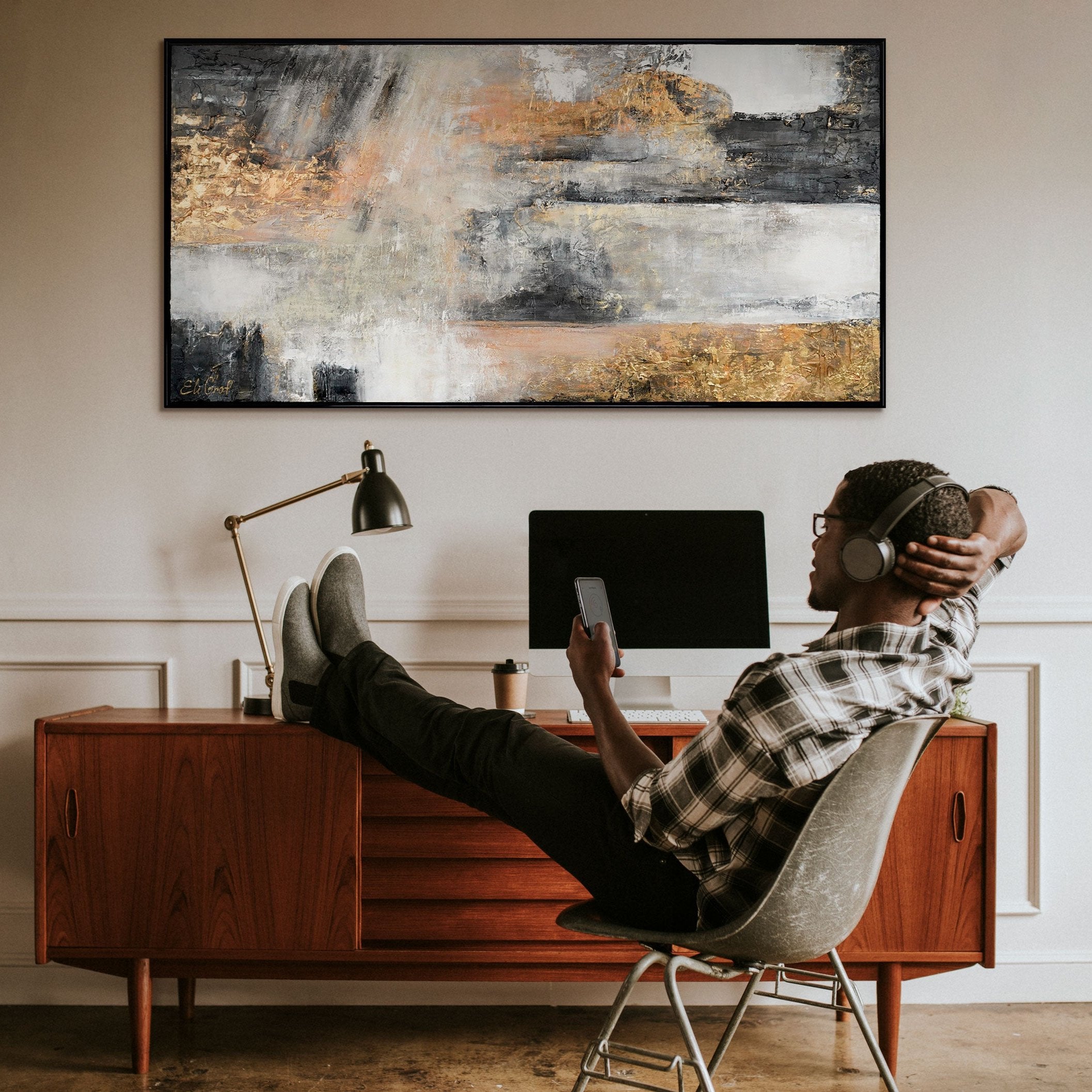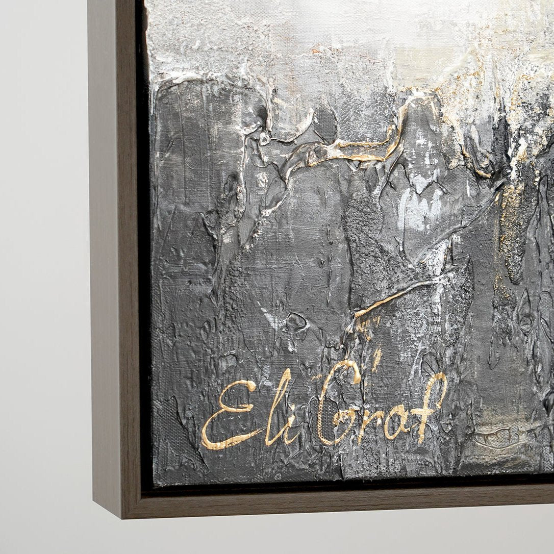 Esta obra abstracta pintada a mano combina elegantes acentos dorados con tonos grises y blancos sobre un lienzo de alta calidad. La textura profunda y el brillo metálico aportan una sensación de lujo y sofisticación, convirtiéndola en un punto focal perfecto para cualquier interior moderno.