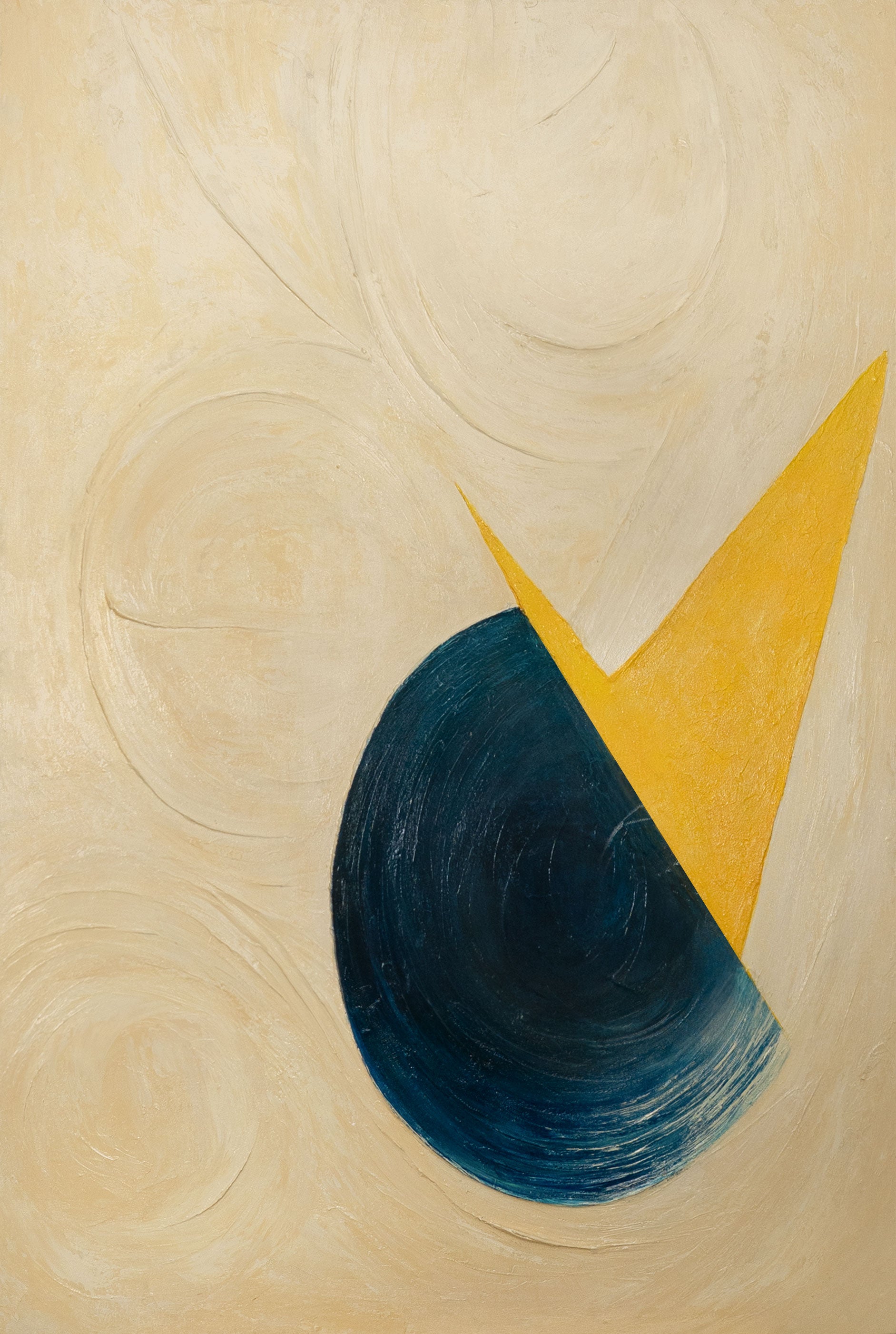 “Corte a Través del Horizonte” es una pintura acrílica pintada a mano que cautiva con sus formas geométricas claras y colores vibrantes. La composición de un círculo azul profundo y un triángulo amarillo destacado crea dinamismo y simboliza el juego entre el equilibrio y el contraste.