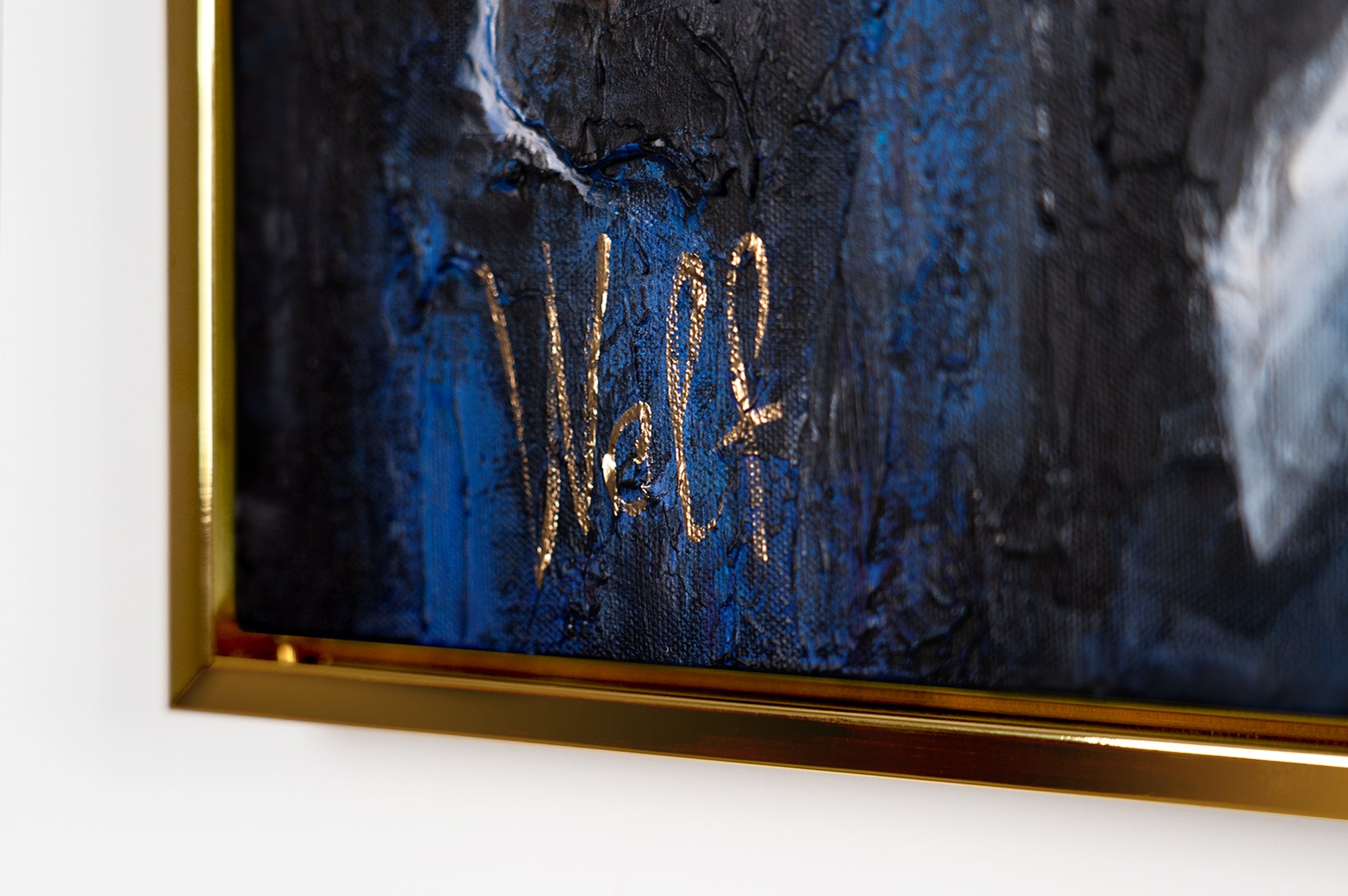 La pintura viene completamente montada en un bastidor, por lo que puede colgarla fácilmente tan pronto como la reciba. No requiere luz adicional, ya que la luz del día es suficiente para que la pintura brille suavemente.