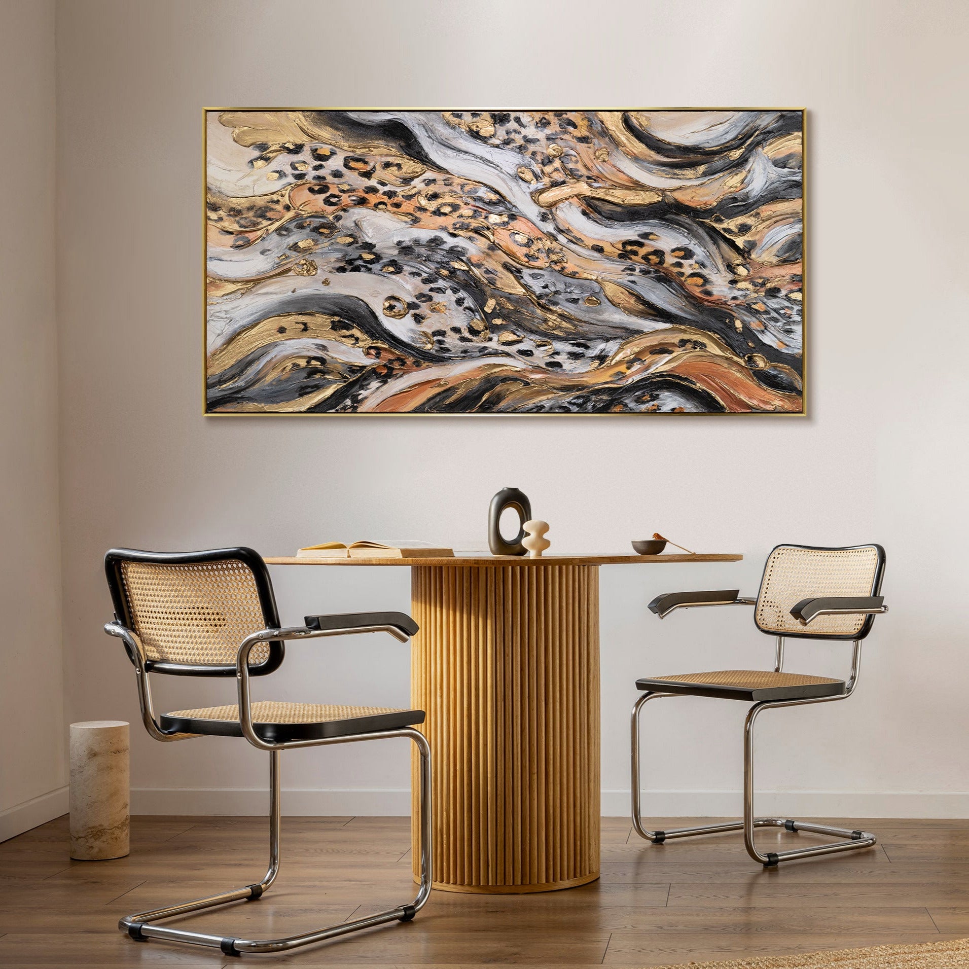 Das Leinwandbild „Wilde Energie“ besticht durch seine lebendige Kombination aus abstrakten Tiermustern und goldener Struktur. Die geschwungenen Formen und der Leopardenprint erzeugen eine dynamische und kraftvolle Wirkung, die jedem Raum eine exotische und zugleich elegante Atmosphäre verleiht. Die handbemalte Textur verleiht dem Werk eine besondere Tiefe und Haptik, die das Auge fesselt.