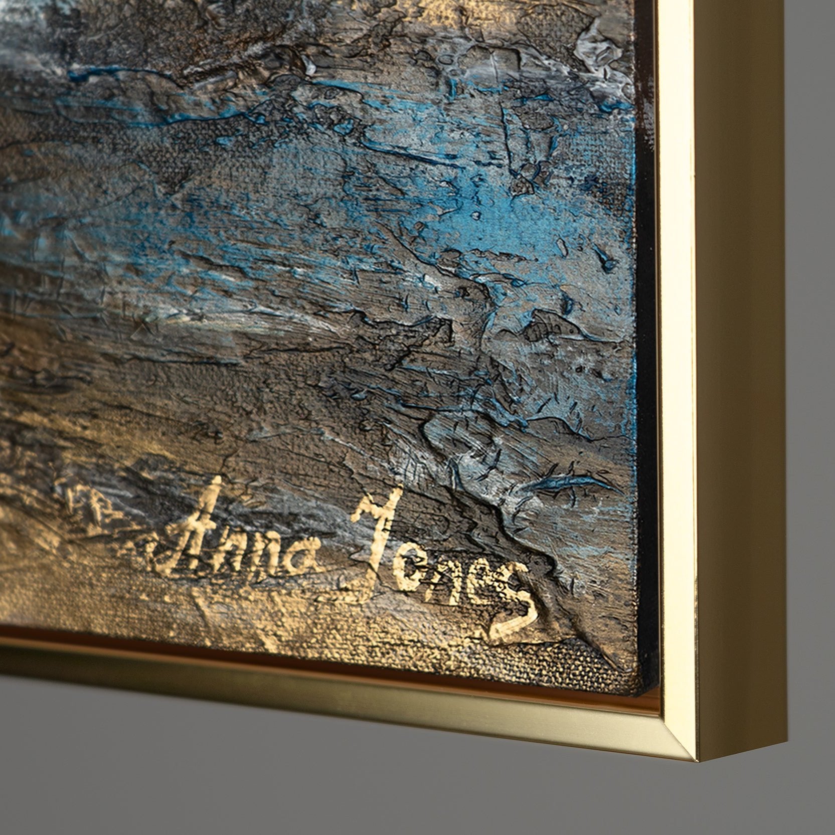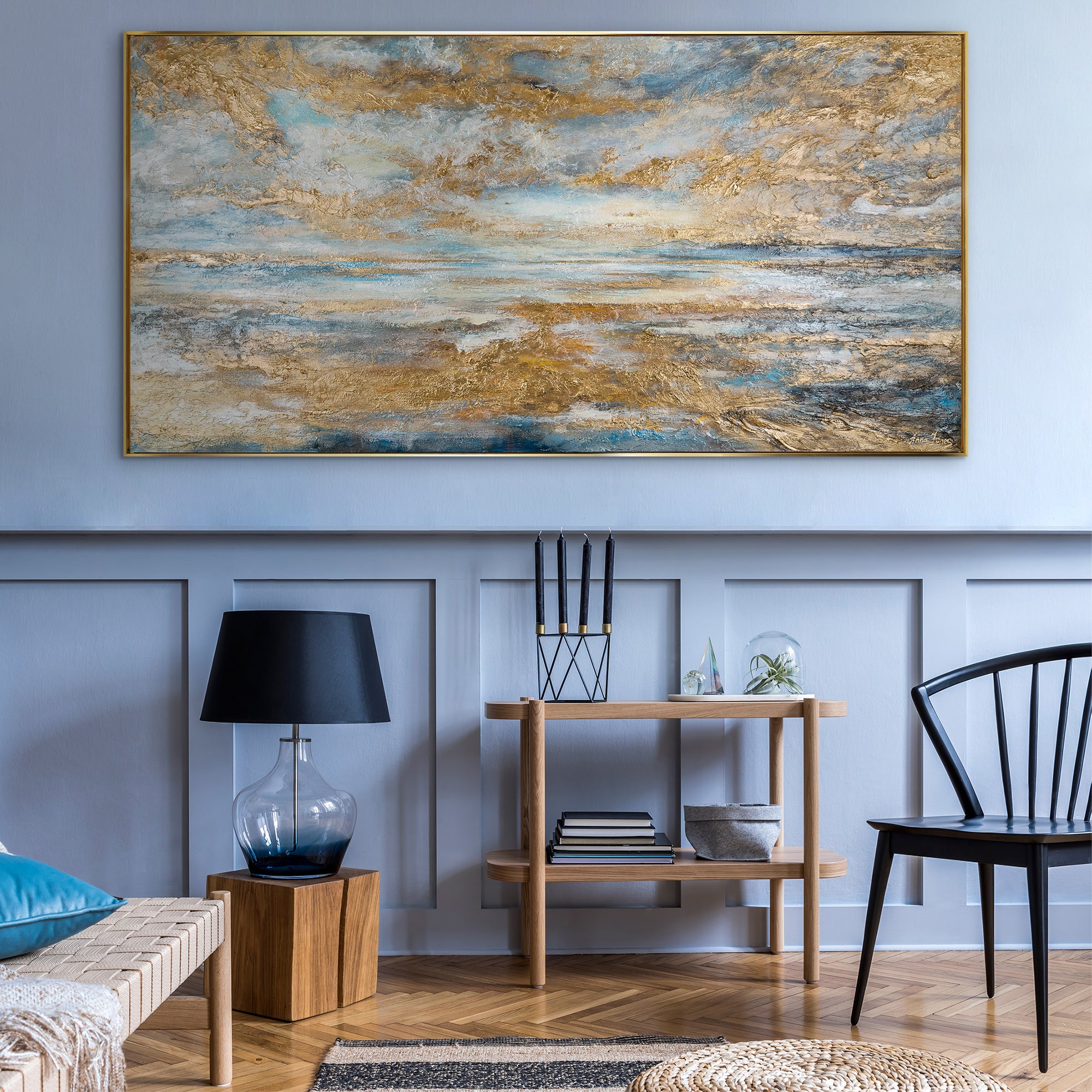 Pintura acrílica abstracta horizontal con acentos dorados y marco – “Bahía Dorada”