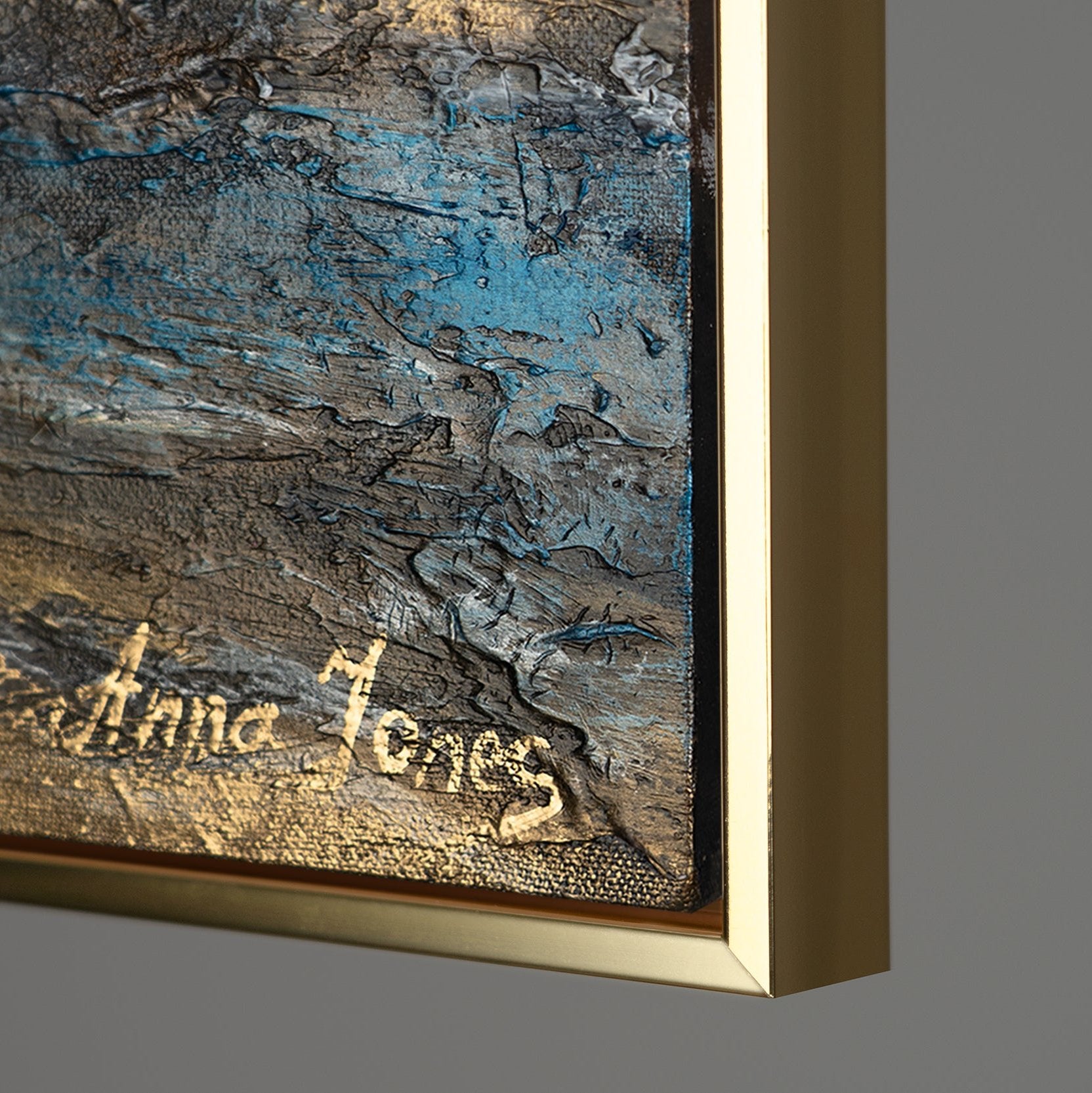 La armoniosa combinación de tonos azules y reflejos dorados convierte esta obra en una pieza única, perfecta para realzar la decoración de interiores modernos.