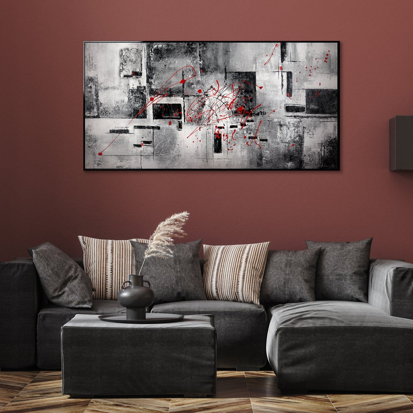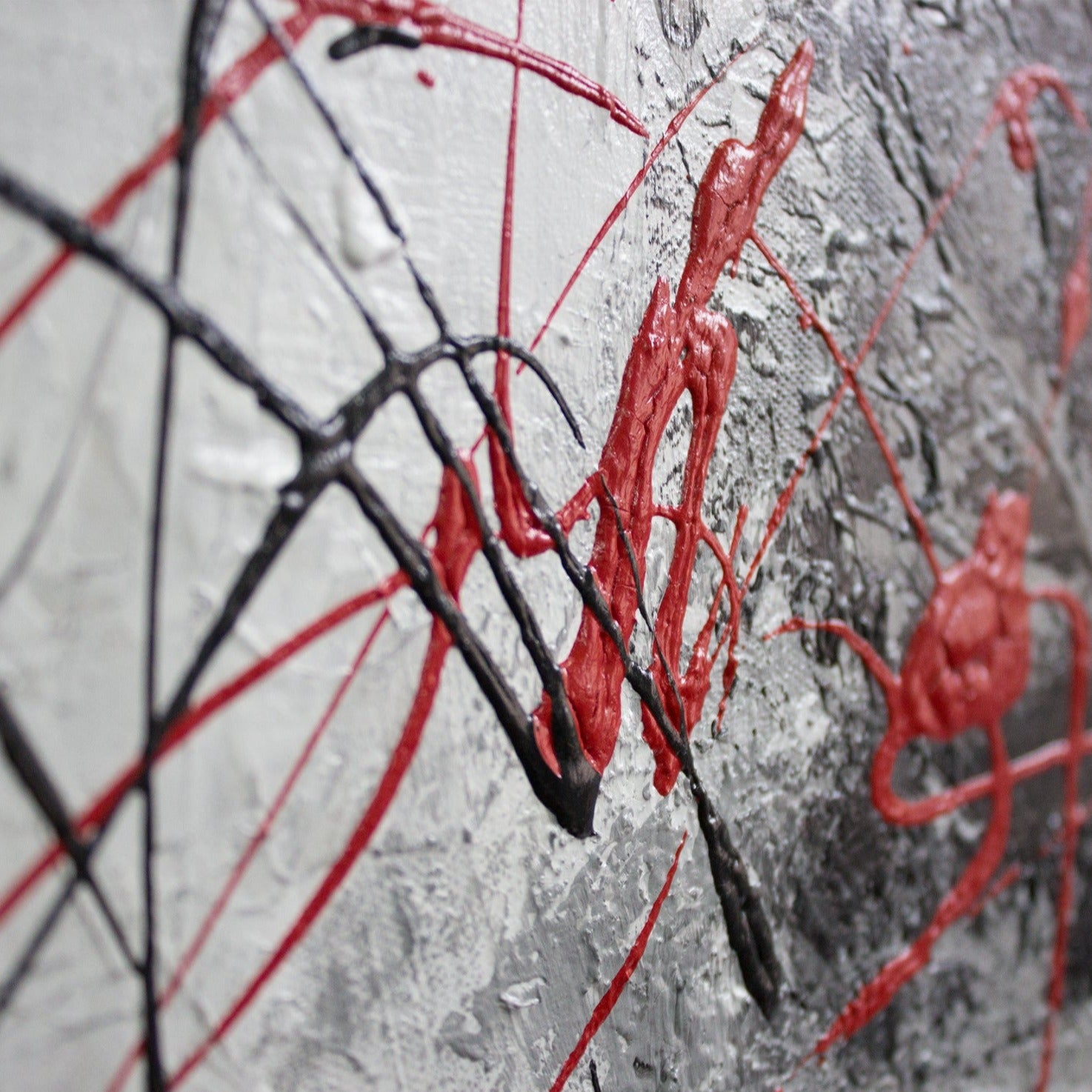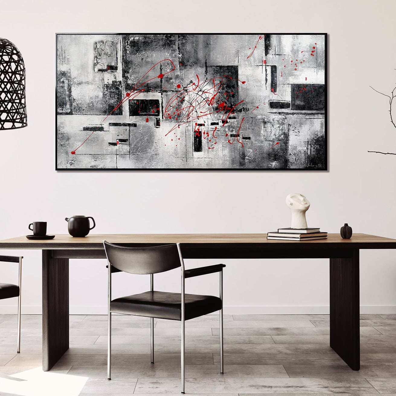 Aporta energía creativa y elegancia artística a tu hogar con esta impresionante pintura abstracta. Las líneas dinámicas y los intensos acentos rojos sobre un fondo contrastante en blanco, negro y gris hacen de esta obra una pieza única y cautivadora. Ideal para interiores modernos, oficinas y galerías.