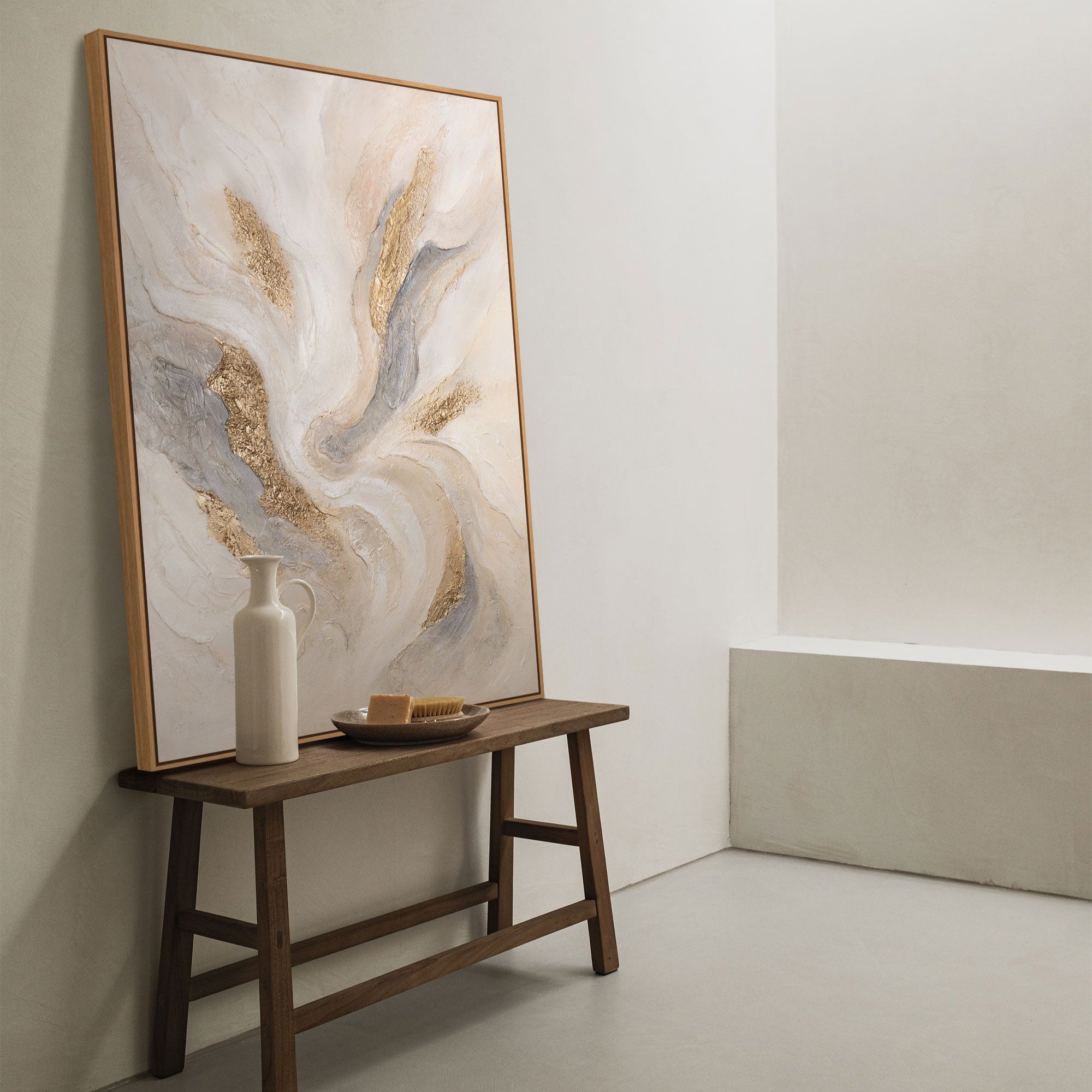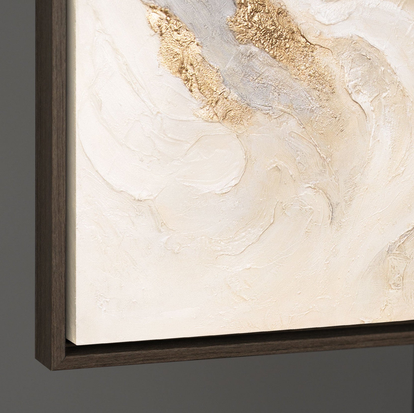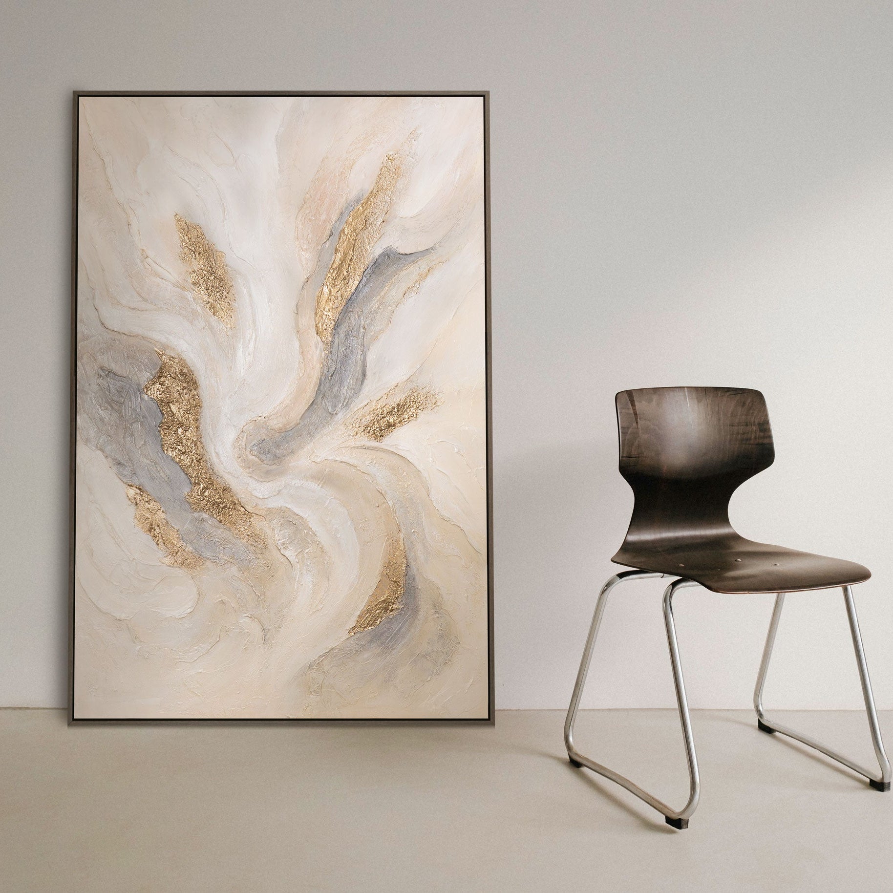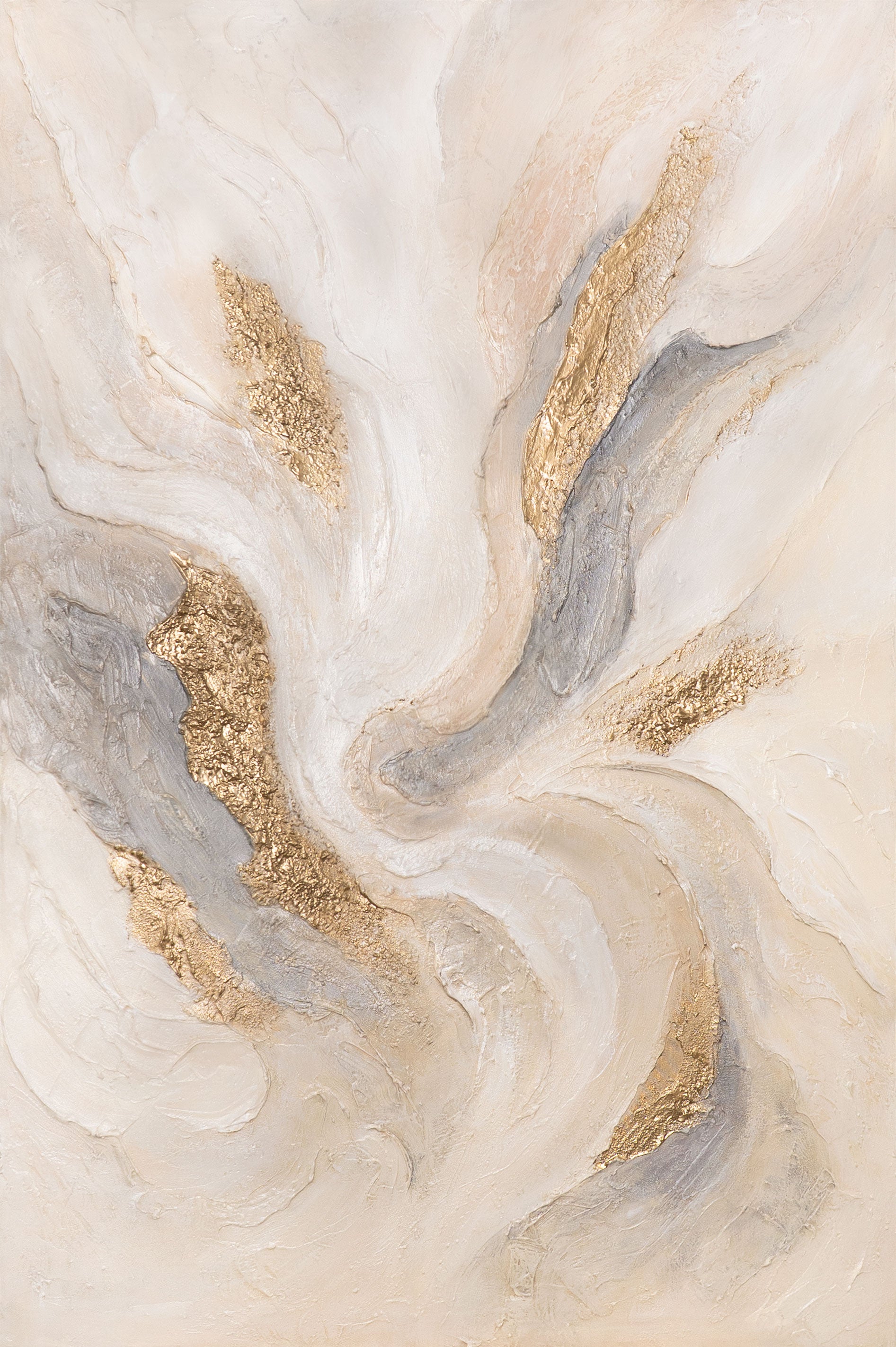 La pintura acrílica “Corrientes Radiantes” cautiva con sus dinámicos remolinos en suaves tonos beige y gris, atravesados por brillantes acentos dorados. La superficie en relieve genera profundidad y movimiento, otorgando a la obra una atmósfera lujosa y vibrante.