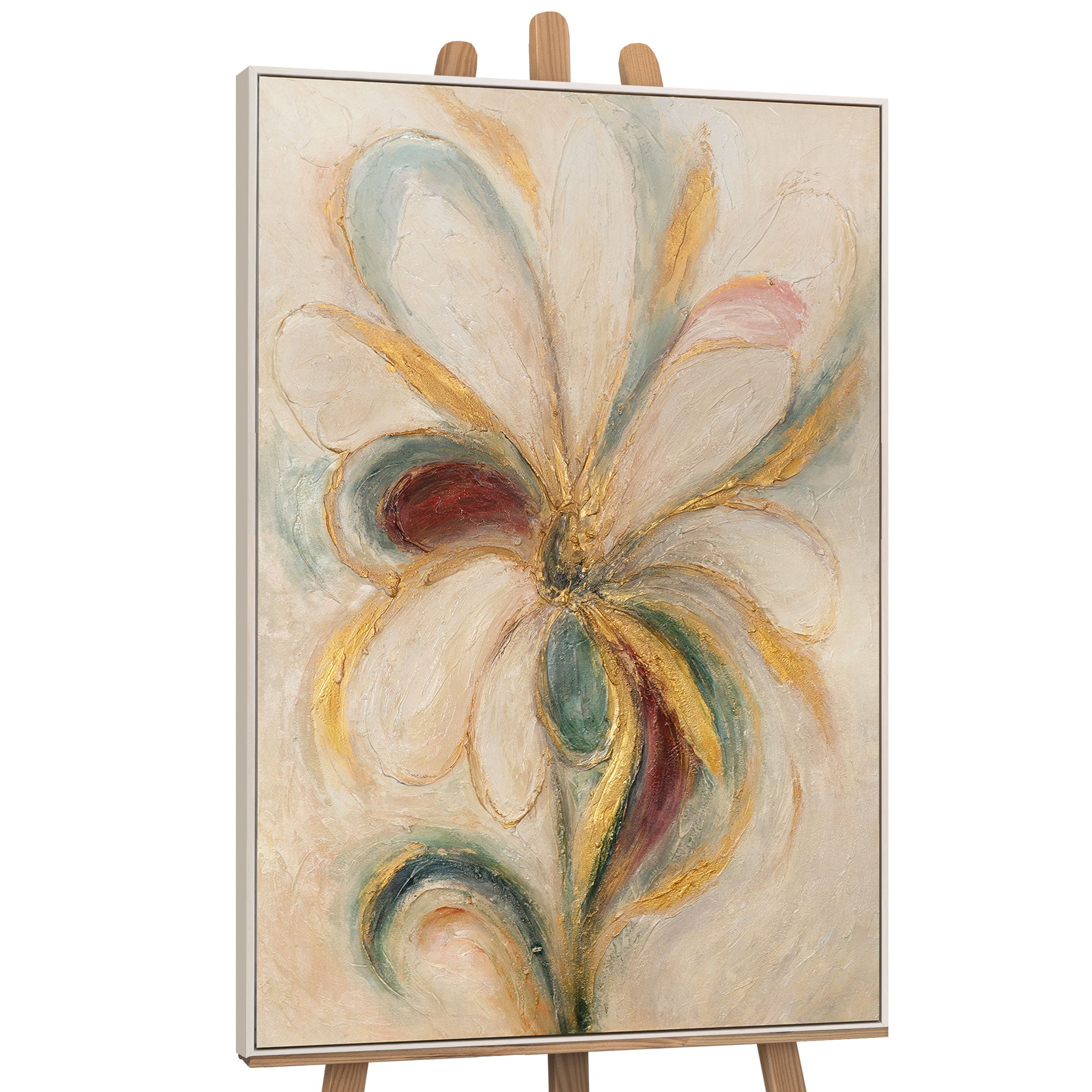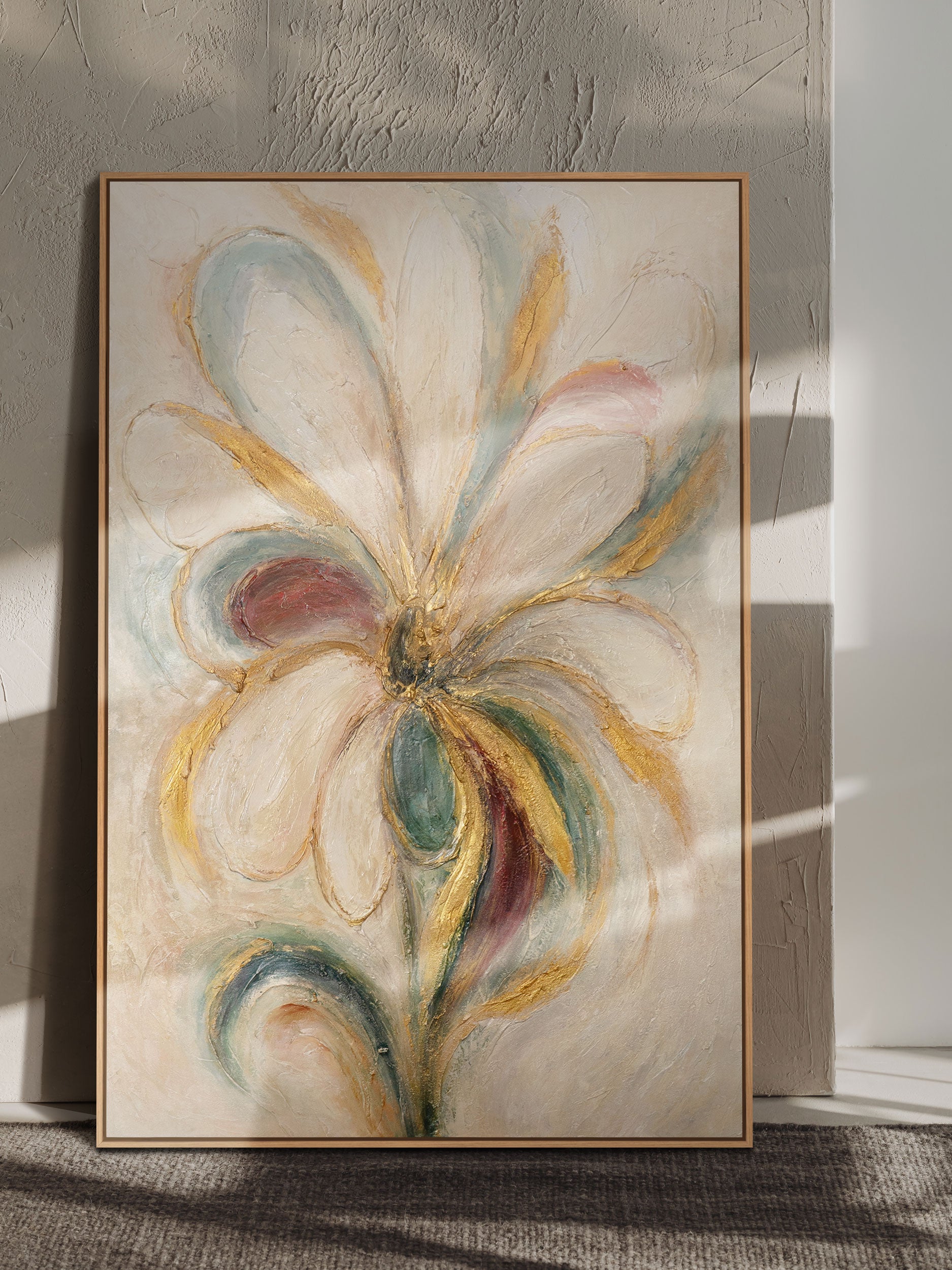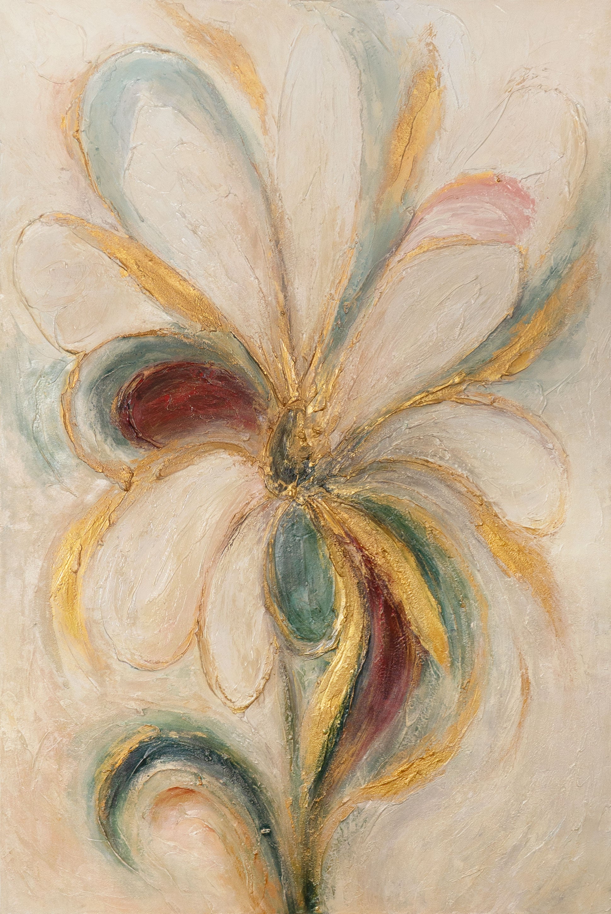 “Energía Floral” es una pintura acrílica pintada a mano sobre lienzo que despliega una dinámica floral con su poderosa intensidad cromática y sus líneas sinuosas. Los acentos brillantes en dorado, verde y rojo se combinan con suaves tonos crema y beige, creando una obra armónica y al mismo tiempo vibrante. La estructura en relieve otorga profundidad y movimiento a la obra, evocando una flor estilizada al viento.