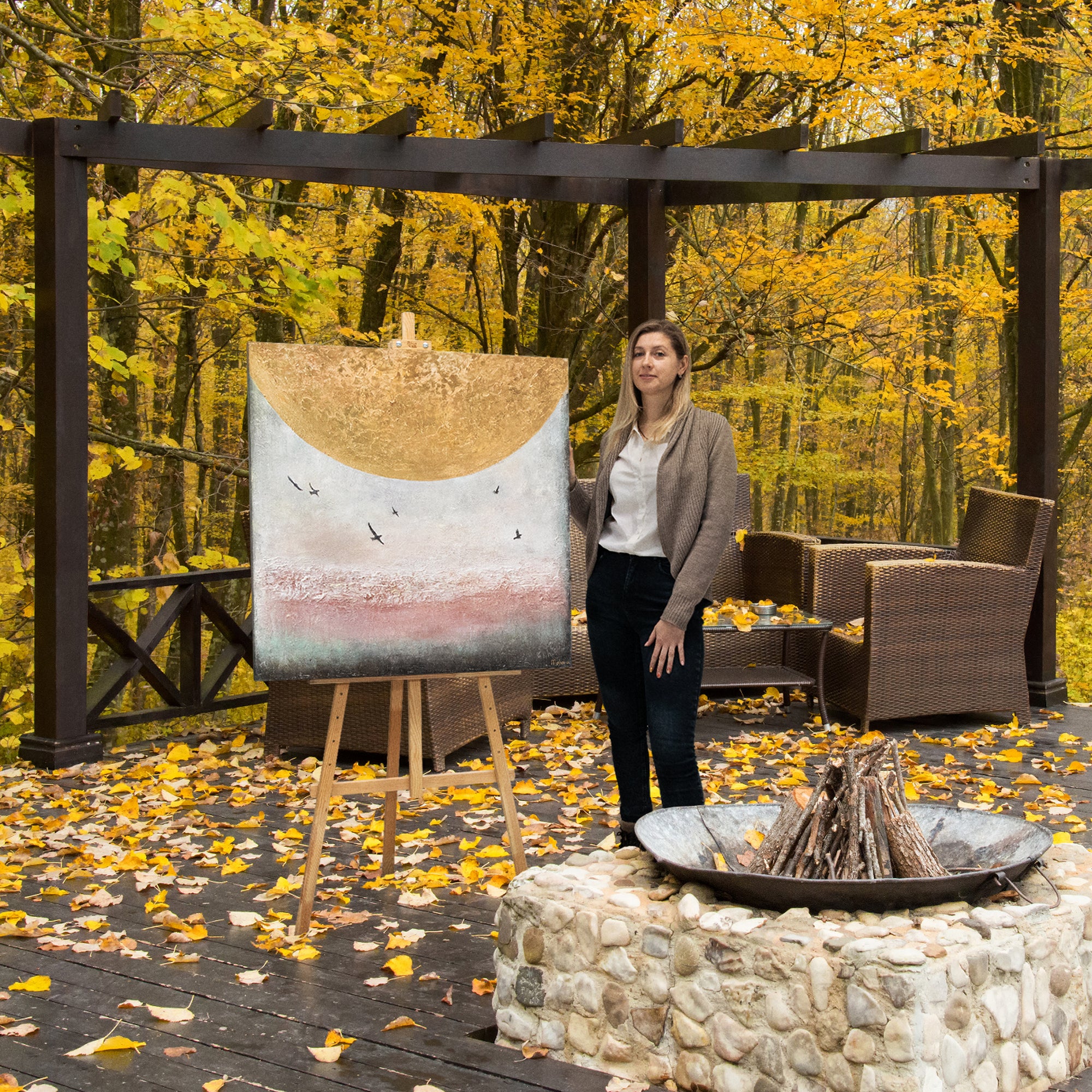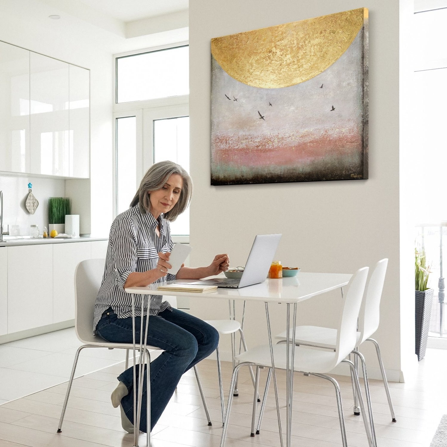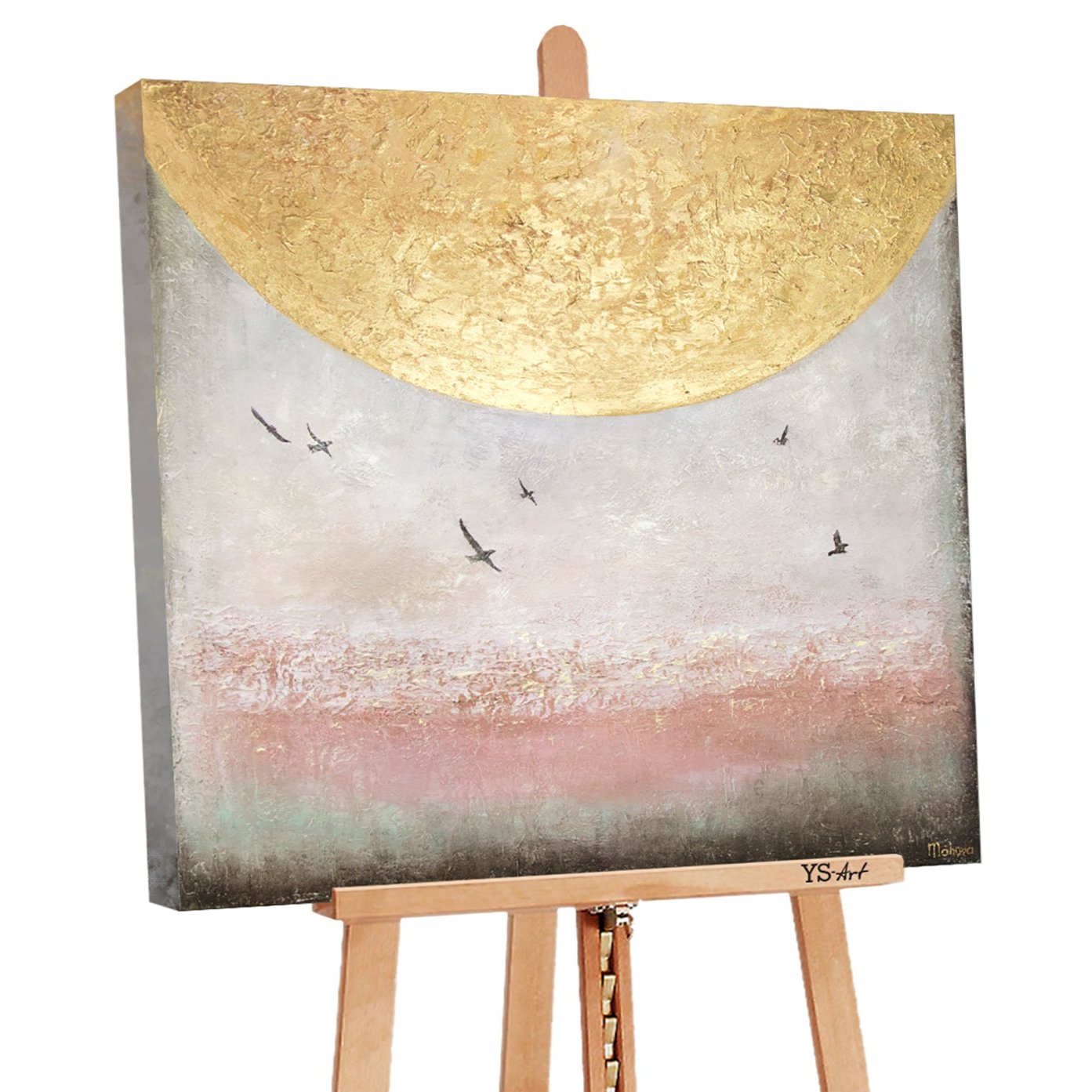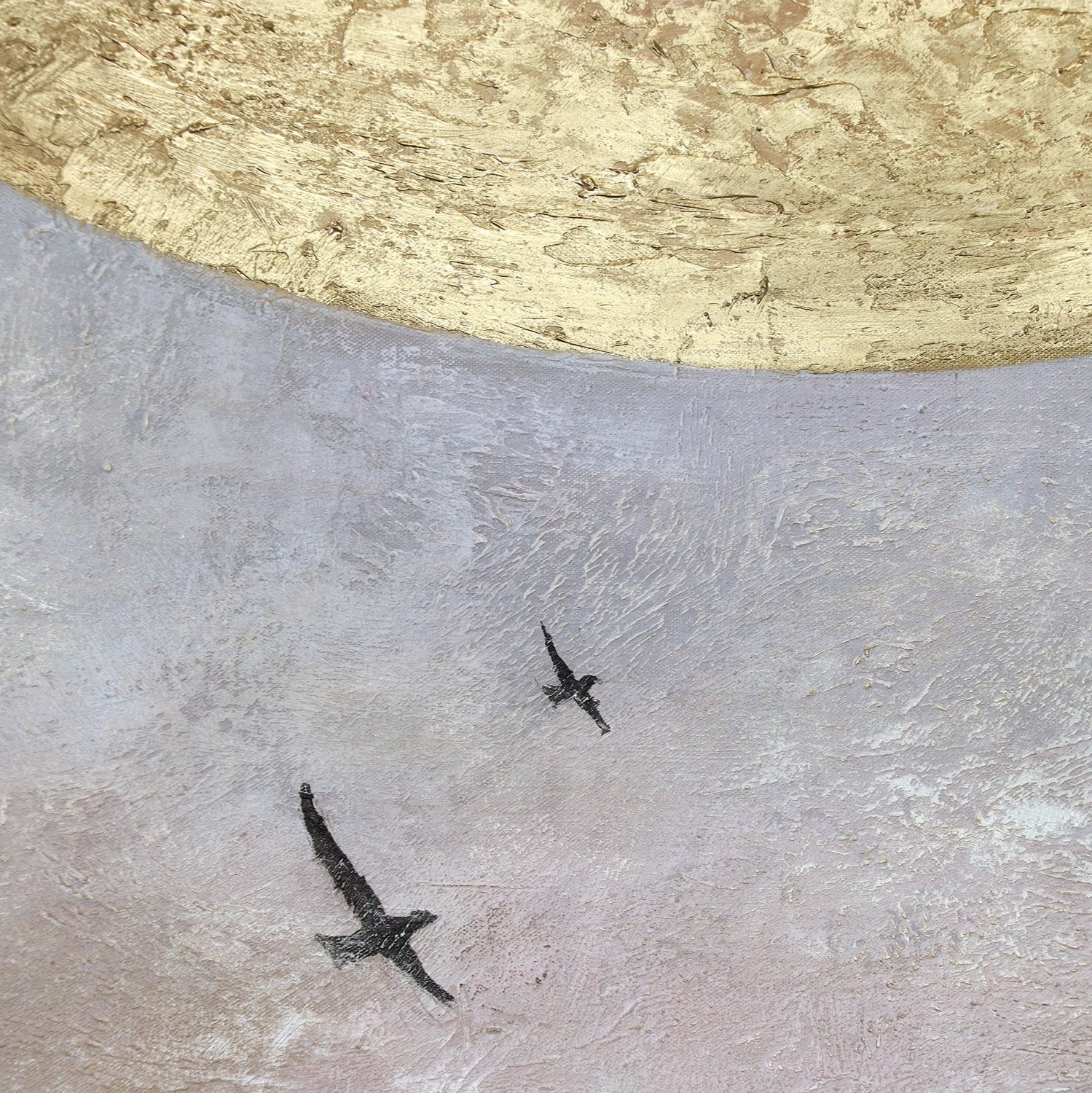Este cuadro abstracto sobre lienzo destaca por su representación minimalista de un cielo con aves en vuelo y un toque dorado que completa la escena a la perfección. Pintado a mano sobre lienzo de alta calidad, esta obra aporta una atmósfera moderna y serena a cualquier hogar. Ideal para el salón, el dormitorio o el despacho.