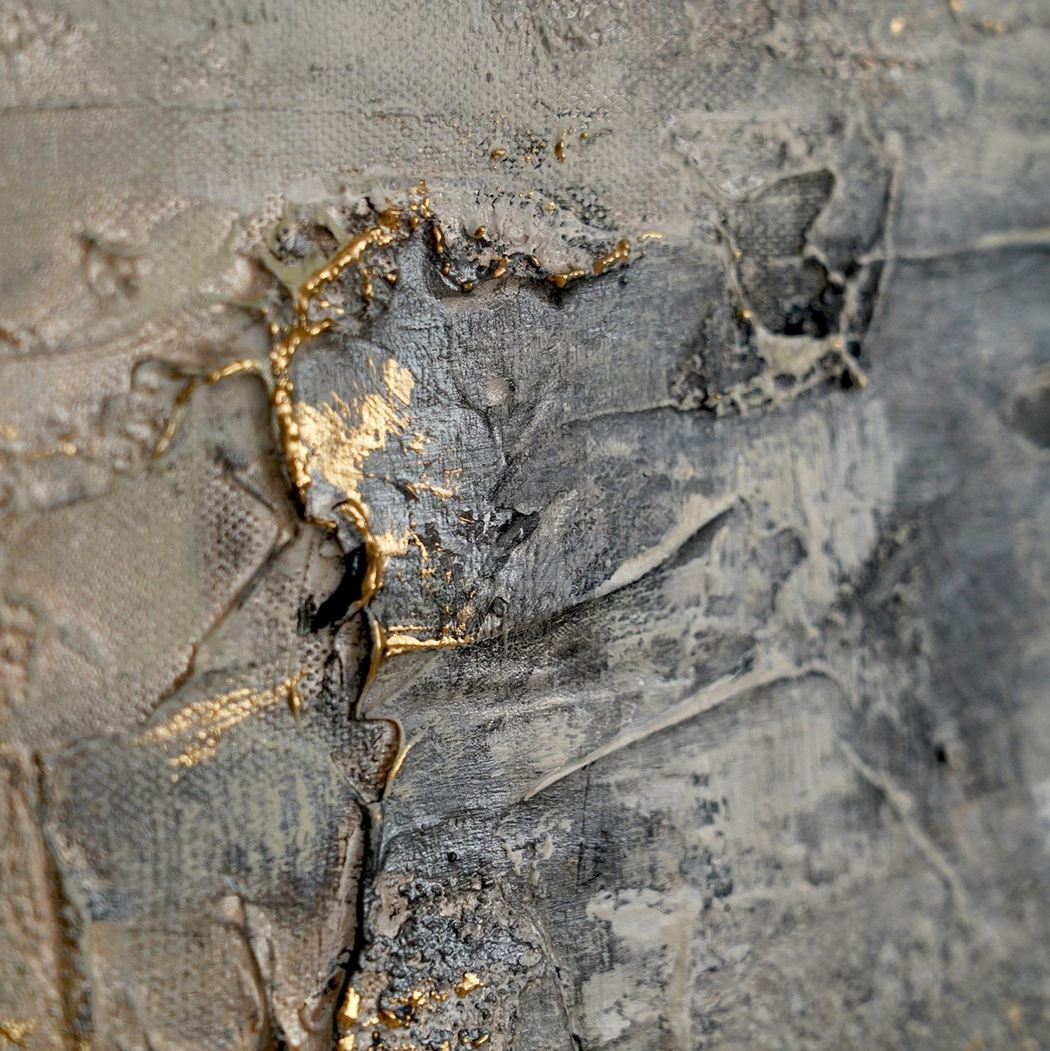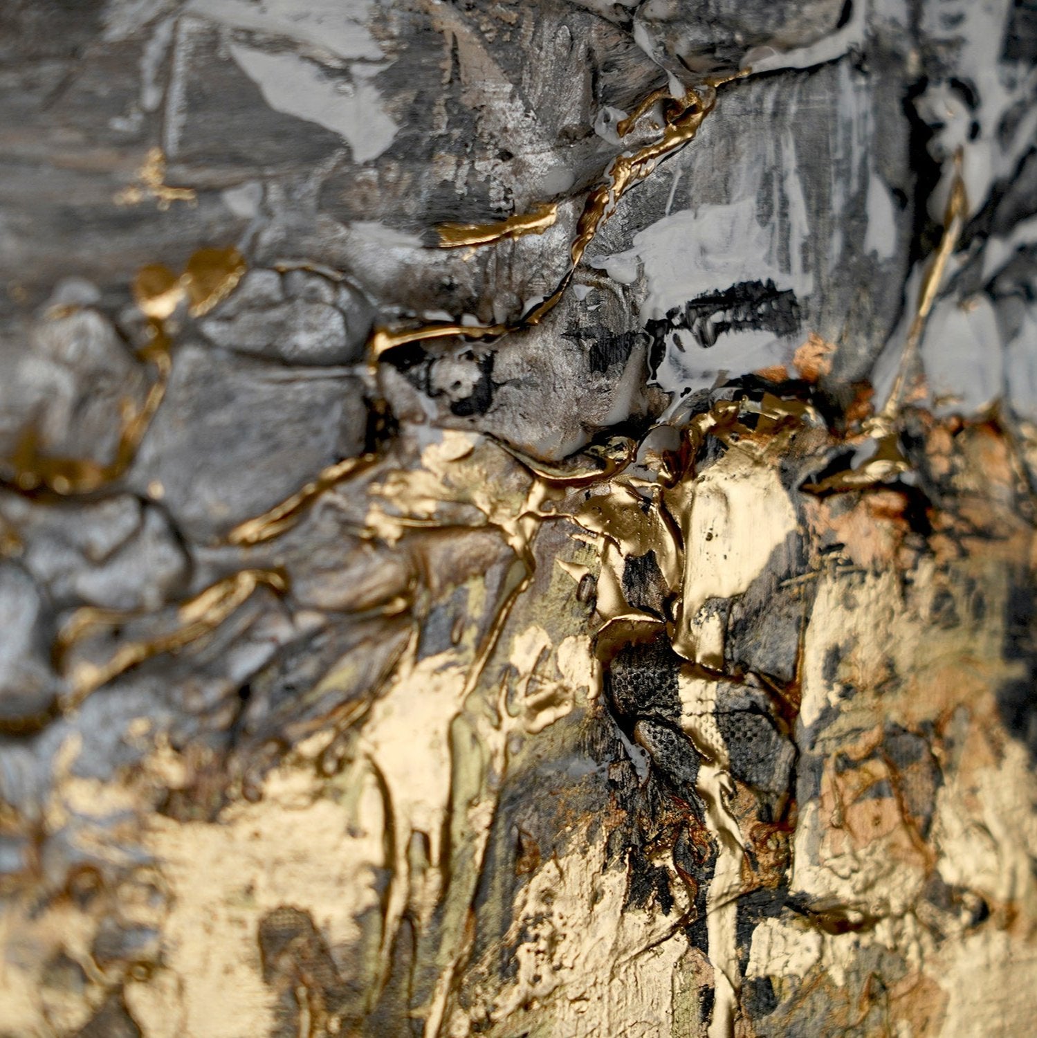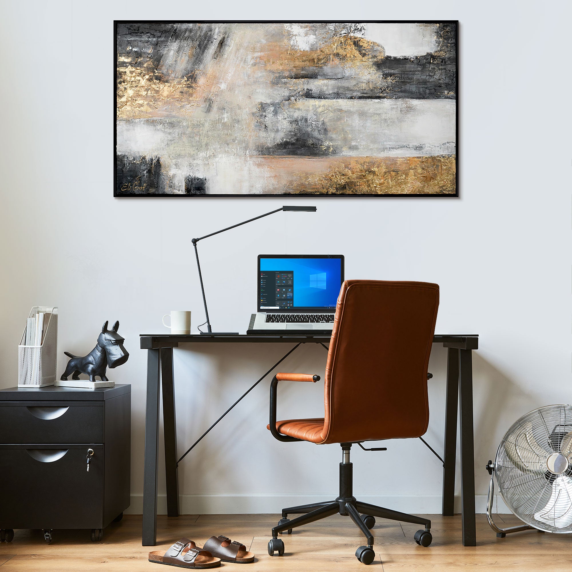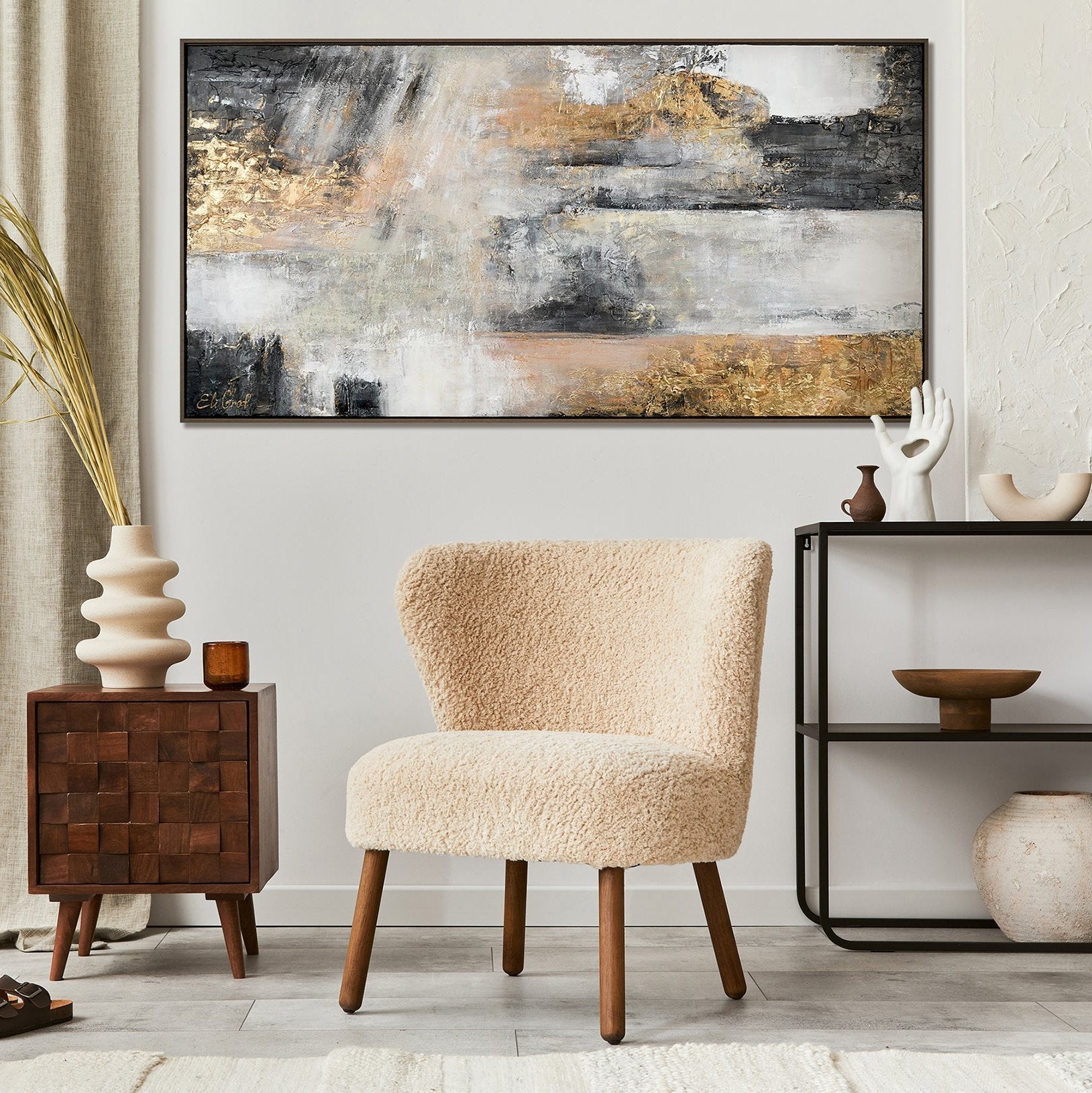 Esta pintura abstracta hecha a mano combina la estética moderna con un toque de lujo. Los acentos dorados aportan profundidad y elegancia, mientras que la paleta armoniosa de negro, blanco y beige transmite serenidad y fuerza al mismo tiempo.