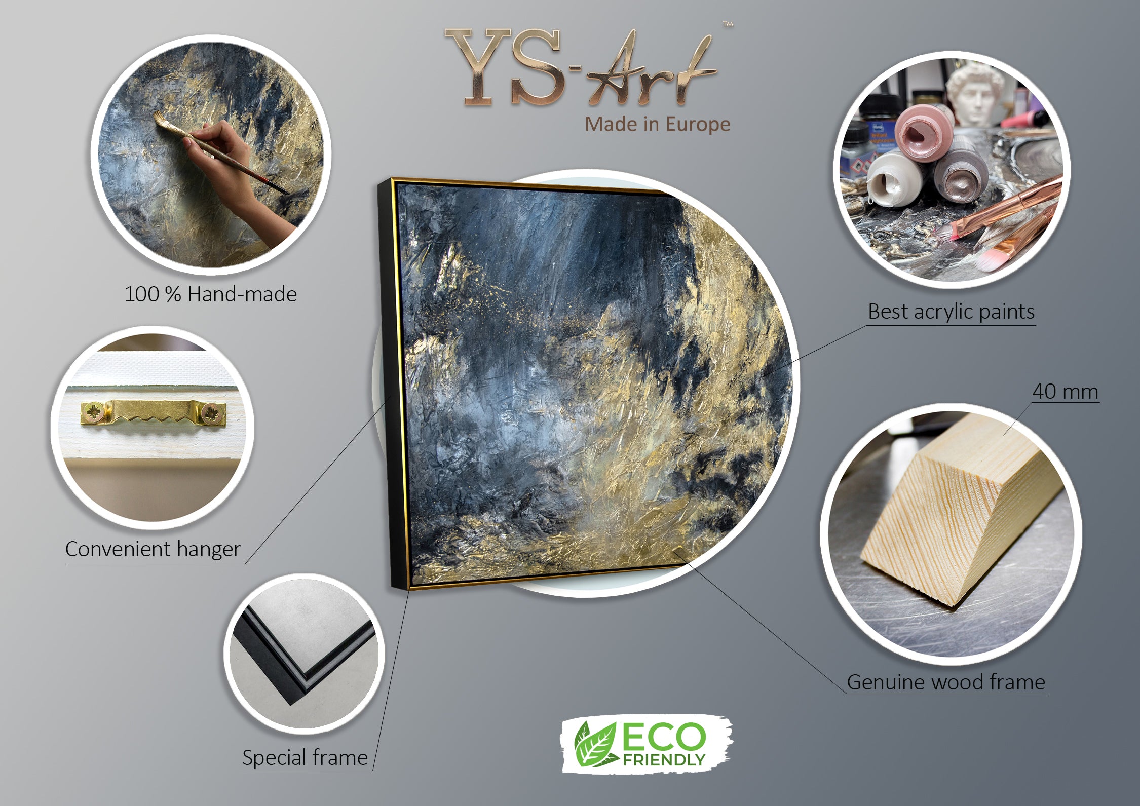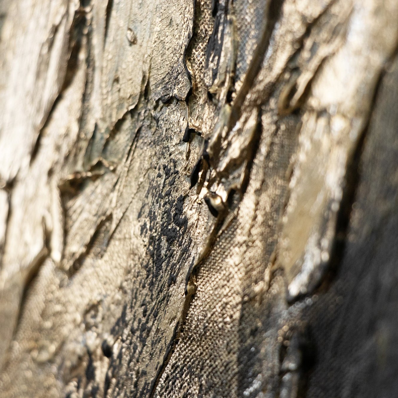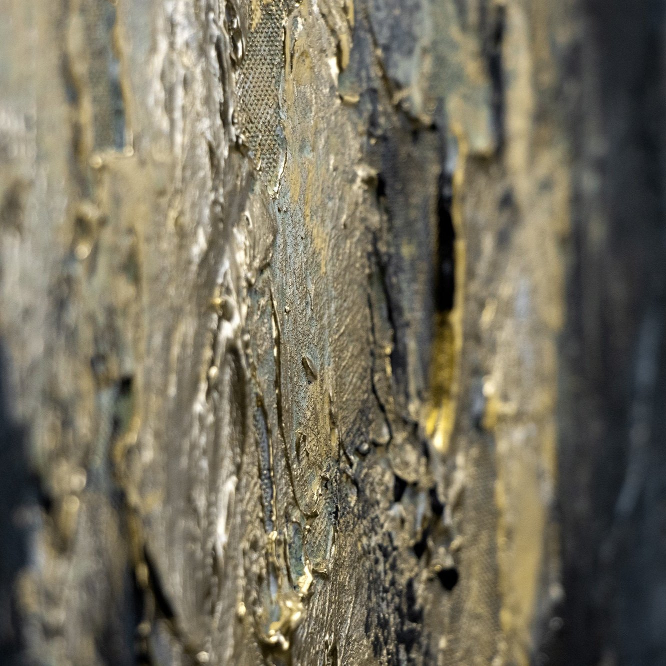 Esta pintura abstracta hecha a mano sobre lienzo destaca por su rica combinación de tonos negros, grises y dorados. Las texturas dinámicas y el uso artístico de acentos dorados crean una composición elegante y sofisticada que irradia lujo y profundidad visual.